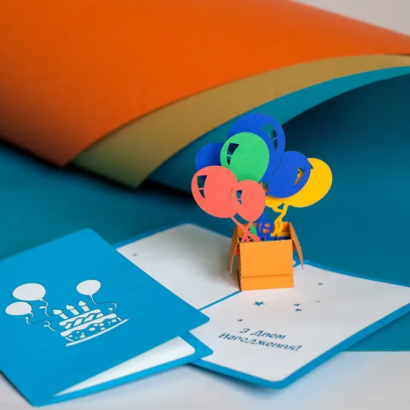 Особенности: 3d открытки из шариков – объемная открытка ручной работы изготовлена с итальянского дизайнерского картона. Внутри дизайнерская открытка украшена 3D иллюстрацией — воздушными шариками со слоновой кости в оранжевой коробочке и надписью на украинском языке: «З Днем Народження». Дарите открытки авторские 3d открытки – оригинально выражая ваши чувства родным и друзьям! Купить 3d открытки – всегда оригинально и необычно! Открытки для сестры – 3d открытка с шариками – подарите любящему человечку праздник! Открытка подруге – 3d открытки из шариков – трогательно и бесценно!