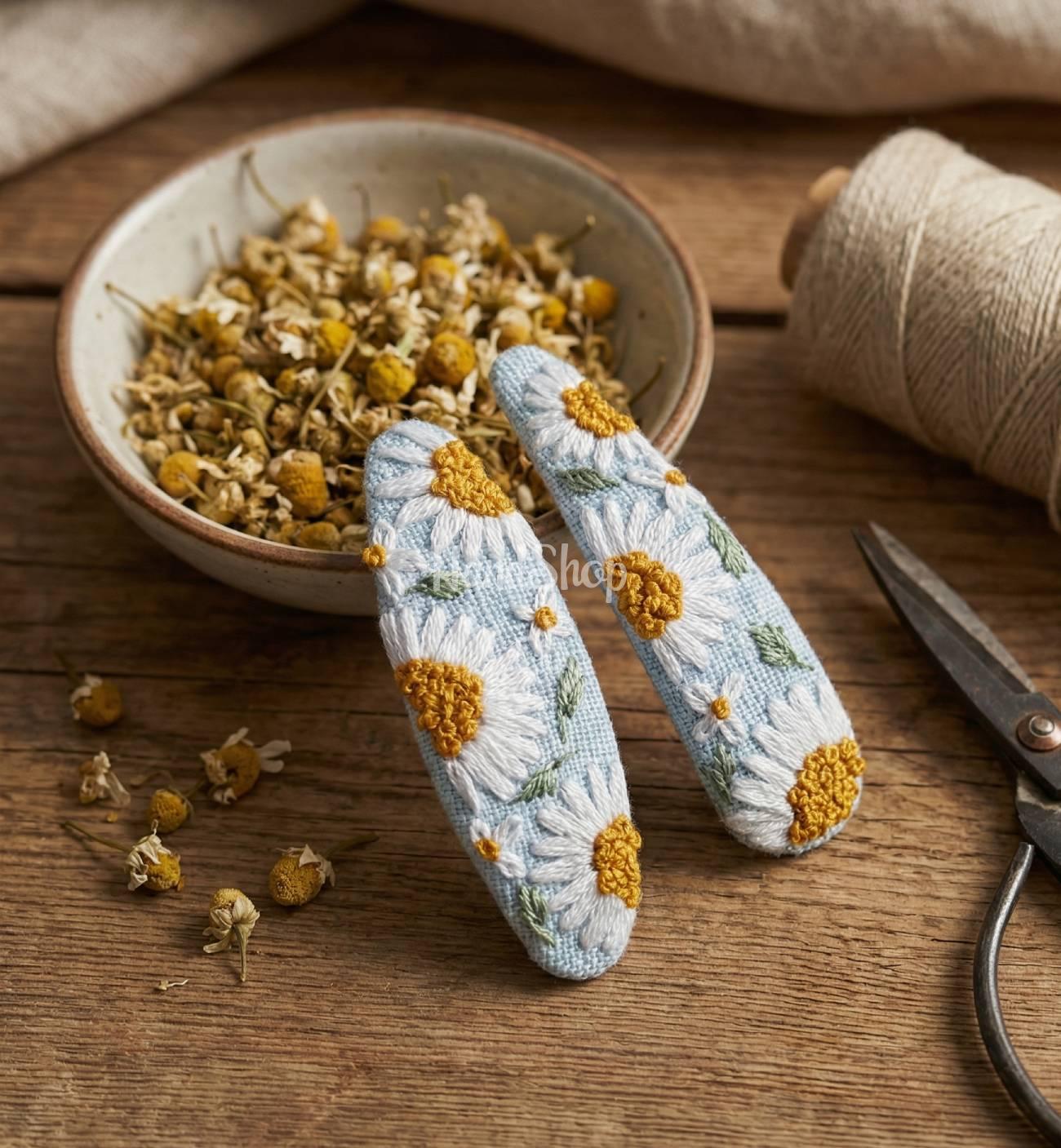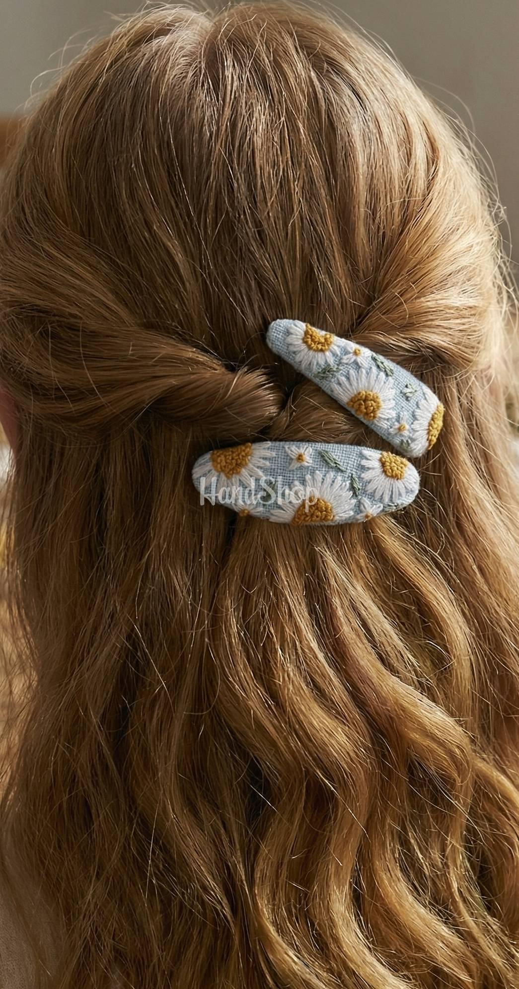Особенности: аксессуары для волос с вышивкой ручной работы – детская заколка клик-клак для волос своими руками с авторской вышивкой белые полевые цветочки ромашек. Основа заколок выполнена из голубой ткани – натуральный лен. Ручная вышивка цветов ромашки выполнена с использованием шелковых нитей DMC Франция. Женские заколочки имеют металлическое основание клик-клак длиной 6 см. Авторские украшения для волос с вышивкой цветы полевые ромашки – эксклюзивно, стильно и очень красиво! Авторские заколочки с маленькими цветочками белыми ромашками – прекрасное романтическое дополнение детского образа на празднике. Зажим для волос цветы ромашечки – это очень нежно, мило и креативно!