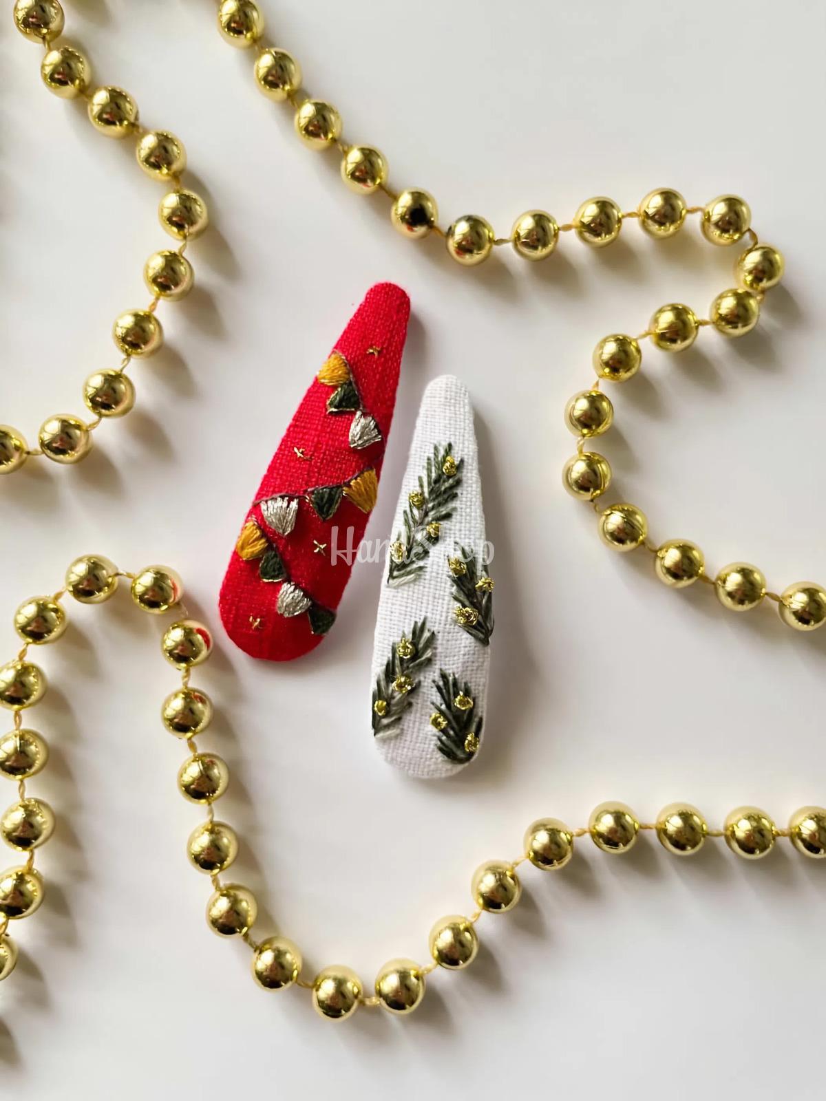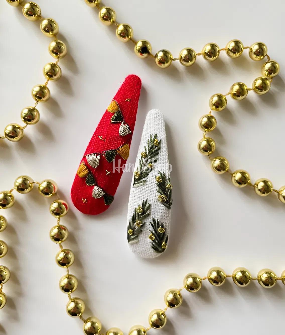 Особенности: детские аксессуары для волос с вышивкой ручной работы – пара заколочек клик-клак для волос своими руками с авторской вышивкой рождественские праздничные флажки, сосновые веточки. Рождественские флажки и сосновые веточки на этих заколочках приносят тепло и радость в холодные зимние дни. Они идеально дополнят новогодний или рождественский образ вашего ребенка, добавляя праздничной магии в ее облик. Основа заколочек выполнена из ткани – натуральный лен. Ручная вышивка новогодних праздничных символов выполнена с использованием шелковых нитей DMC Франция. Эти заколочки с вышивкой новогодних символов станут настоящим украшением для малышей в зимний период. Детская пара заколочек имеют металлическую основу клик-клак длиной 6 см. Детские заколочки клик-клак с вышивкой ручной работы – нежный и стильный аксессуар, сочетающий традиции и современный дизайн. Пара заколочек создана своими руками из натурального льна и украшена авторской вышивкой рождественских флажков и веточек сосны. Вышивка заколочек выполнена шелковыми нитями DMC (Франция), что придает аксессуарам особый блеск и долговечность. Металлическое основание клик-клак длиной 6 см удобно держится в волосах, не скользит и подходит для ежедневного ношения и праздничных образов.