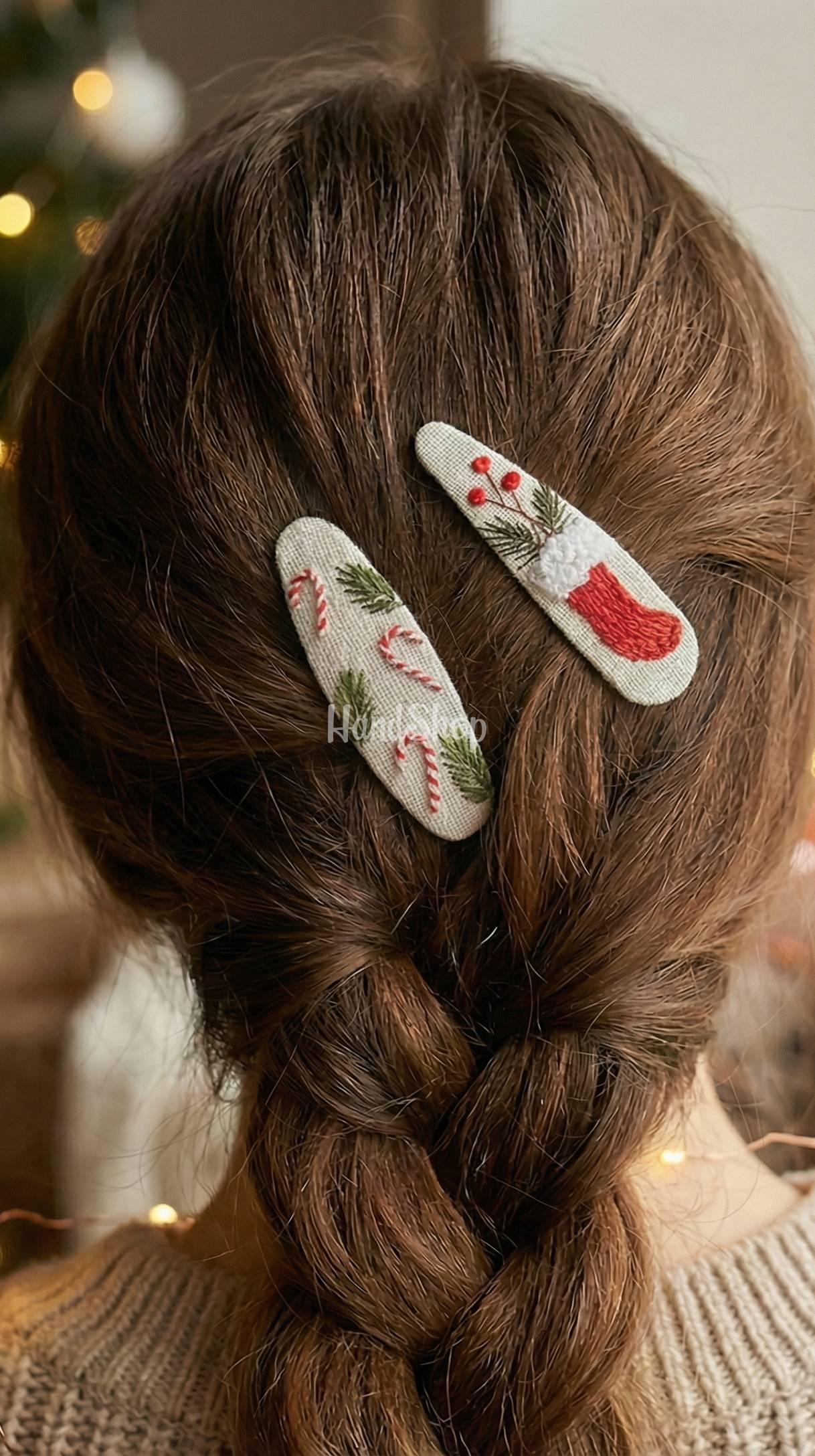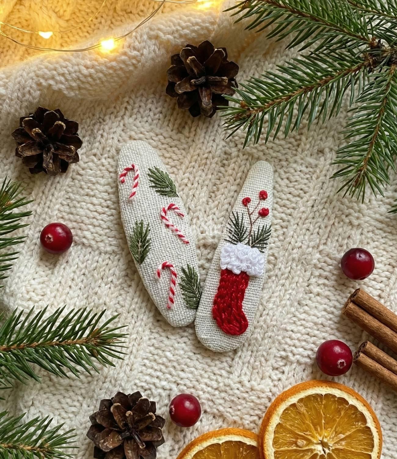 Особенности: детские аксессуары для волос с вышивкой ручной работы – пара заколочек клик-клак для волос своими руками с авторской вышивкой рождественский сапог, сосновые веточки и леденцы. Рождественский сапог и леденцы на этих заколочках приносят тепло и радость в холодные зимние дни. Они идеально дополнят новогодний или рождественский образ вашего ребенка, добавляя праздничной магии в ее облик. Основа заколочек выполнена из ткани – натуральный лен. Ручная вышивка новогодних праздничных символов выполнена с использованием шелковых нитей DMC Франция. Эти заколочки с вышивкой новогодних символов станут настоящим украшением для малышей в зимний период. Детская пара заколочек имеет металлическую основу клик-клак длиной 6 см. Детские заколочки клик-клак с вышивкой ручной работы – нежный и стильный аксессуар, сочетающий традиции и современный дизайн. Пара заколочек создана своими руками из натурального льна и украшена авторской вышивкой рождественских леденцов и сапог. Вышивка заколочек выполнена шелковыми нитями DMC (Франция), что придает аксессуарам особый блеск и долговечность. Металлическое основание клик-клак длиной 6 см удобно держится в волосах, не скользит и подходит для ежедневного ношения и праздничных образов.