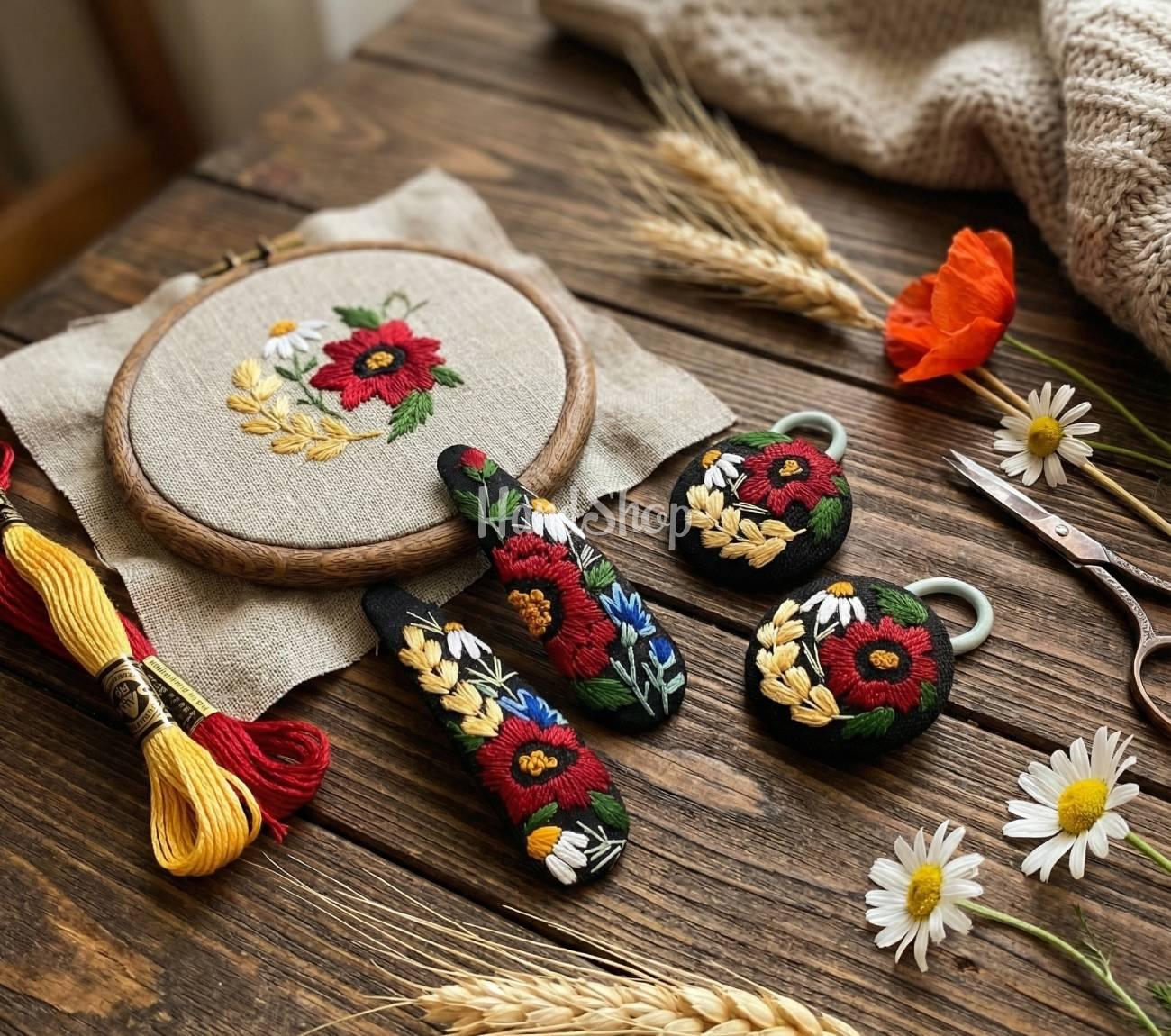 Особенности: аксессуары для волос с вышивкой ручной работы – заколка клик-клак и резинка для волос своими руками с авторской вышивкой полевые цветы. Основа резинок и заколочек выполнена из ткани – натуральный лен. Ручная вышивка украинских полевых цветов выполнена с использованием шелковых нитей DMC Франция. Детские заколочки имеют металлическую основу клик-клак длиной 6 см. Резинка для волос своими руками круглой формы — пуговки имеют диаметр 2,7 см. Авторские украшения для волос с вышивкой полевые цветы — красные маки, ромашки, васильки и колосья — эксклюзивно, стильно очень красиво! Авторская резинка для волос и заколочки с маленькими вышитыми цветами – прекрасное, романтическое дополнение образа. Резинка для волос цветка – это очень женственно, ярко и креативно!