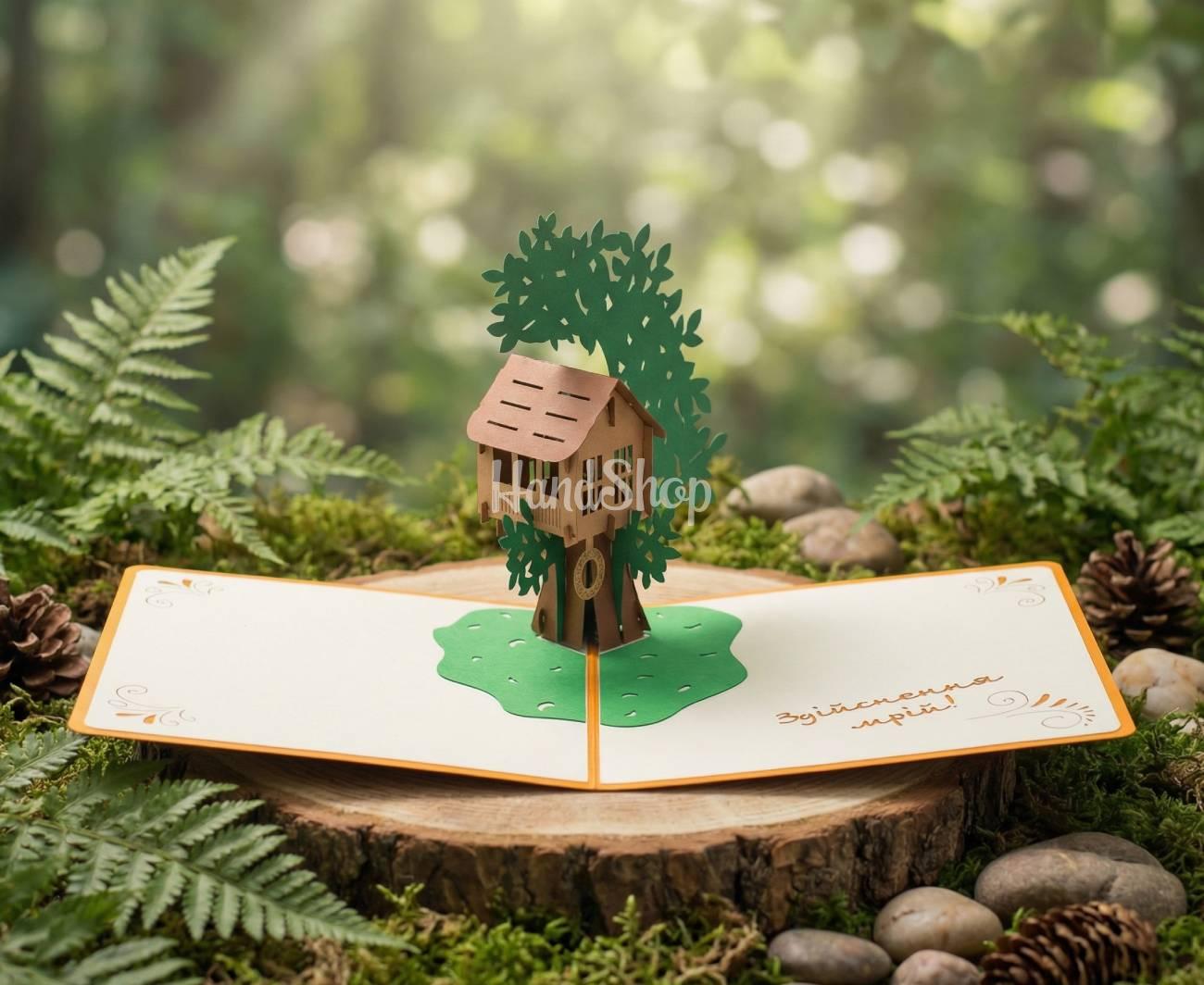 Особенности: домик открытка – объемная открытка ручной работы 14,5 x 14,5 см изготовлена с итальянского дизайнерского картона. Внутри дизайнерская открытка украшена 3D иллюстрацией – объемным деревом и детским домиком на нем со слоновой кости. Открытка домик скрапбукинг украшена надписью на украинском языке: «Здійснення мрій!». Дарите открытки авторские 3d открытки – открытка домик своими руками – оригинально выражая ваши чувства родным и друзьям! Купить 3d открытки – дерево открытка – очень оригинально и необычно! Открытка с деревом – подарите маленькому человечку праздник! Открытка подруге – домик открытка – символичный презент для друзей! Открытка домик на дереве своими руками – малыши будут в восторге!
