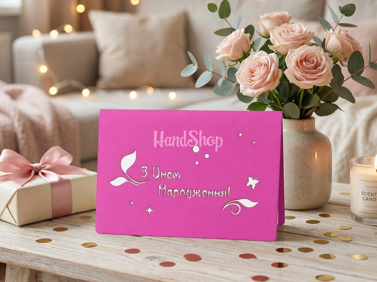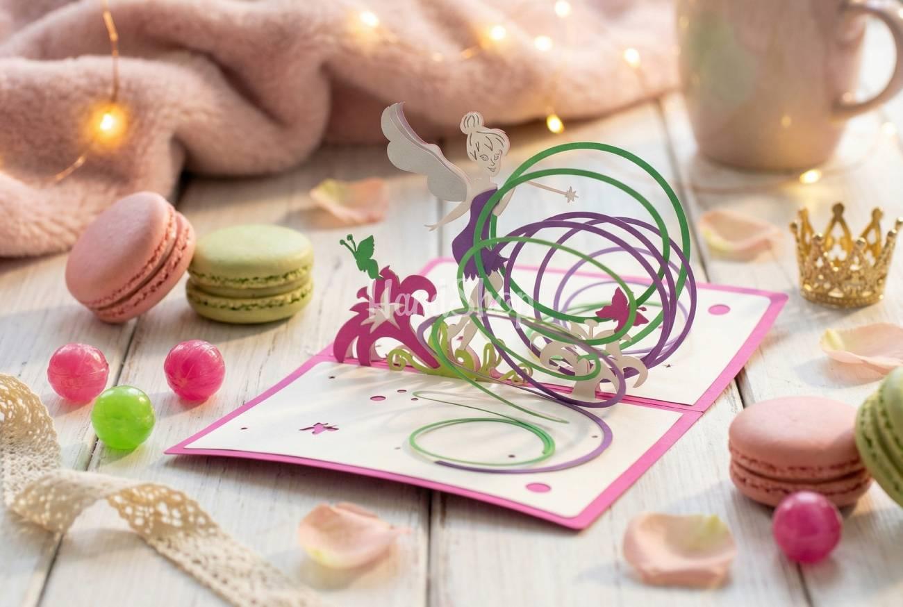 Особенности: 3d объемные детские открытки – объемная открытка ручной работы изготовлена из итальянского дизайнерского картона и создана с вниманием к каждой детали. Внутри поздравительной детской открытки – очаровательная 3D иллюстрация феи с бабочками и цветочками и теплая надпись на украинском языке «С Днем Рождения». При открытии открытка превращается в маленькое чудо, которое увлекает ребенка с первого взгляда. Авторская объемная открытка феечки – идеальная для подарка: дочери, сестре, крестнице; маленькой именинницы и для девочек, любящих сказки. Объемная 3D-открытка – это эмоции, которые остаются в памяти надолго. Купить 3D открытку с феей – значит подарить ребенку настоящий праздник, радость и улыбку. Подарите ребенку настоящую сказку с нашей авторской открыткой феей.