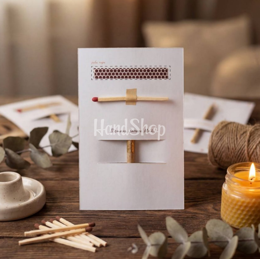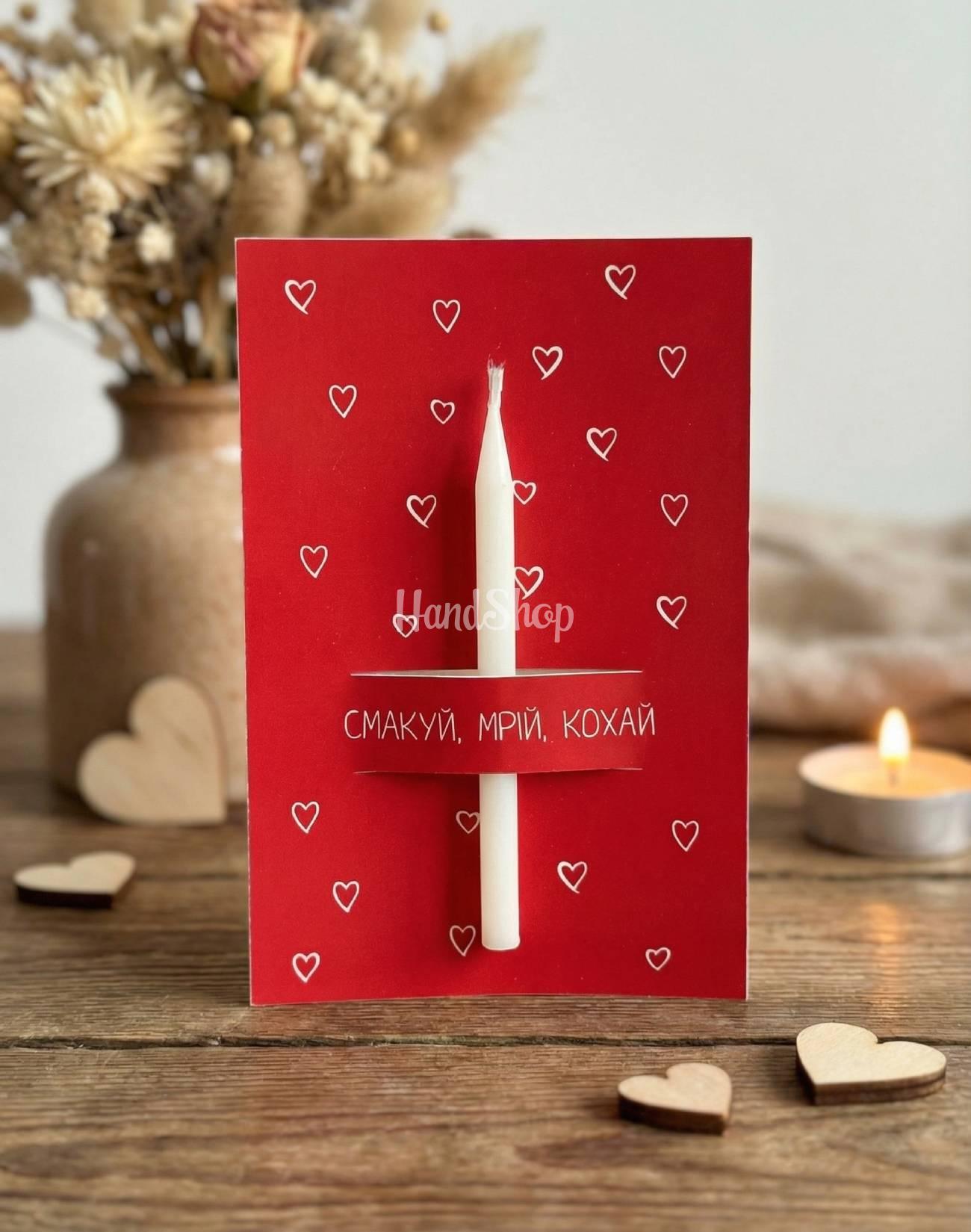 Особенности: праздничные атрибуты — романтическая поздравительная авторская открытка маленького формата 12 х 8 см. Поздравительная открытка имеет прорезное окошечко, через которое виднеется длинная свеча бенто-карандаш ручной работы 9 см и 0,5 см в диаметре, изготовлена из натурального воска, в белом цвете. На оборотной стороне открытки есть специальная полоска серы — чиркало, а также спичка, закрепленная на цветной скотч, чтобы получить идеальный ответ на любой праздник. Дизайнерский картон, на котором сделана открытка, подчеркивает ее элегантность. На лицевой стороне вы найдете изображение белых сердечек, и надпись «Смакуй, мрій, кохай» на украинском языке, что придает открытке празднично-романтическое настроение. Эта романтическая открытка со свечой станет отличным подарком для любимого человека, который оценит его утонченность и теплоту. Уникальность дизайна и мастерство изготовления делают его идеальным вариантом для самых лучших моментов вашей жизни.