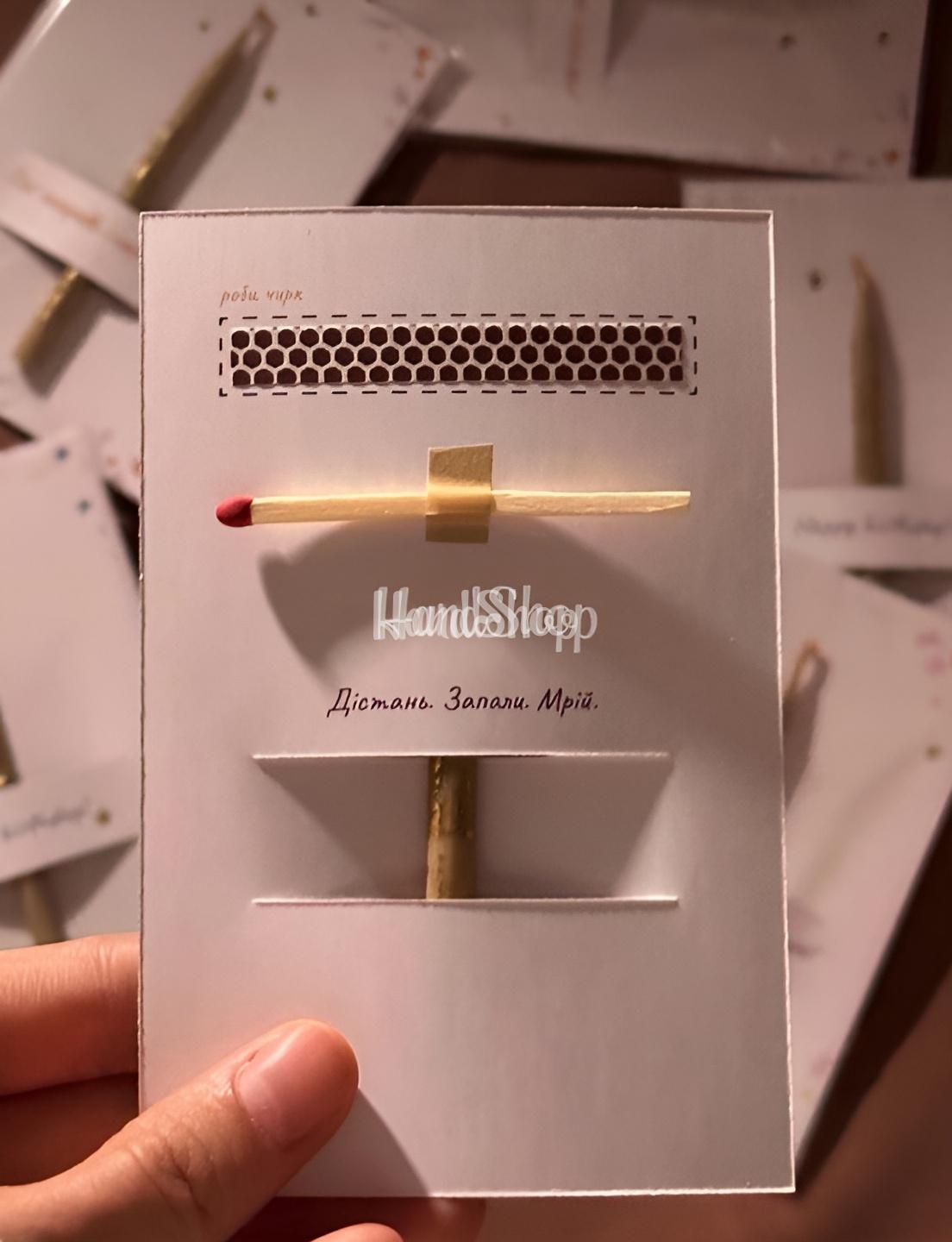 Особенности: праздничные атрибуты – романтическая поздравительная авторская открытка маленького формата 12х8 см. Открытка имеет прорезное окошечко, через которое виднеется длинная свеча бенто-карандаш ручной работы 9 см и 0,5 см в диаметре, изготовленная из натурального воска, в красном цвете, что придает волшебную атмосферу. На оборотной стороне открытки есть специальная полоска серы – чиркало, а также спичка, закрепленная на цветной скотч, чтобы получить идеальный ответ на любой праздник. Дизайнерский картон, на котором сделана открытка, подчеркивает ее элегантность. На лицевой стороне вы найдете изображение влюбленной пары, обменивающейся сердечками, а надпись «Для особых моментов» на украинском языке придает открытке глубокое эмоциональное содержание. Эта романтическая открытка со свечой станет отличным подарком для любимого человека, который оценит его утонченность и теплоту. Уникальность дизайна и мастерство изготовления делают его идеальным вариантом для самых лучших моментов вашей жизни.