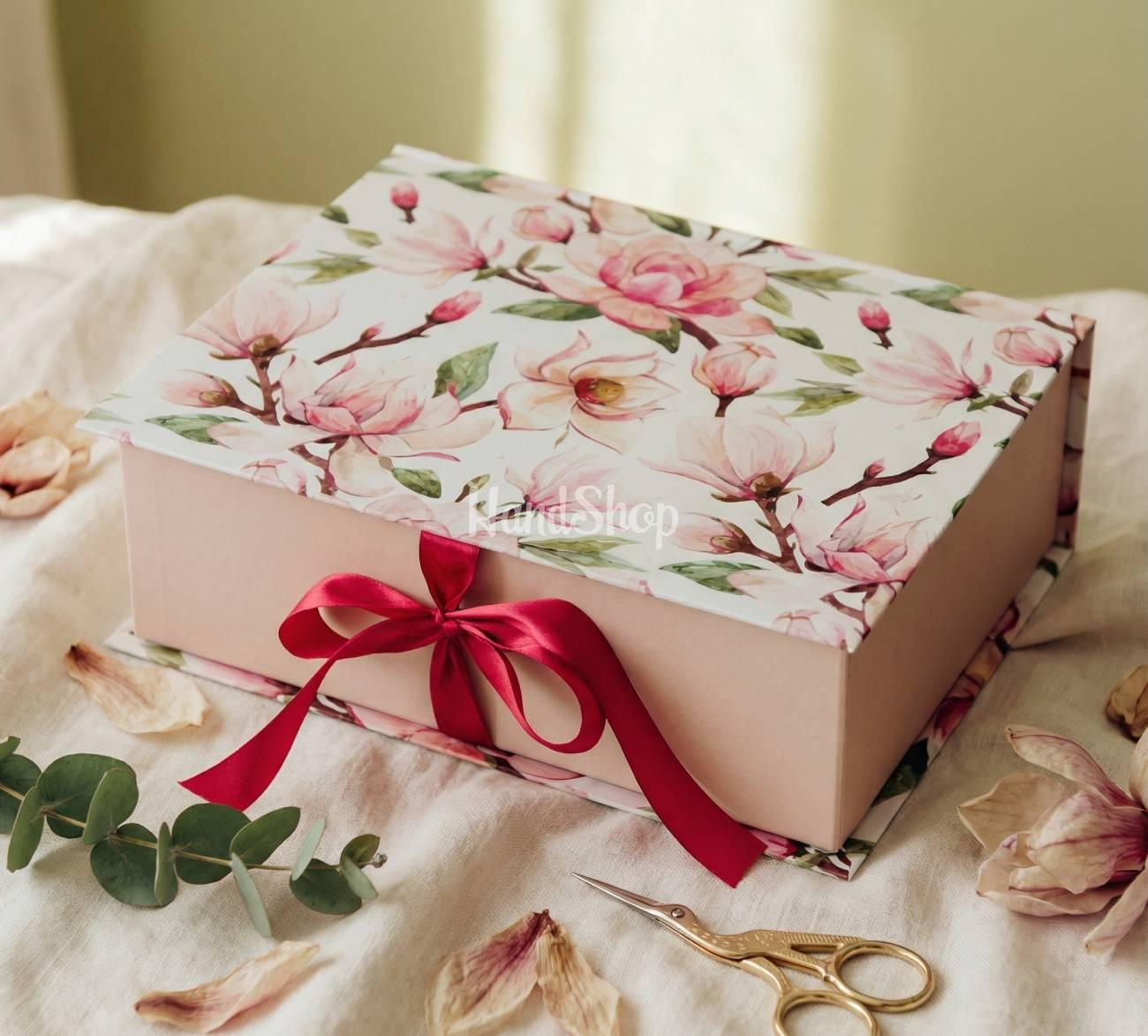 Особенности: большие подарочные сувенирные коробки – прямоугольная коробка с размерами 33 х 24 х 11 см с принтом розовые цветы магнолии и длинной атласной лентой борового цвета. Прямоугольная коробка оформлена нежным принтом розовых цветов магнолии, станет элегантным и стильным дополнением к вашему подарку. Ее размер позволяет удобно вместить одежду, сладости и даже две бутылки вина, что делает коробку идеальной для любых праздничных случаев. Длинная атласная лента бордового цвета придает коробке еще большее изящество, а большой бордовый бант на ленте придает ей особую роскошь. Такая коробка – это не только упаковка, но и важный элемент вашего подарка, который произведет неизгладимое впечатление на получателя. Подарите эмоции, которые продлятся еще долго после того, как подарок будет распакован. Подарочная сувенирная коробка цветы магнолии – это роскошное решение для любого праздничного момента!