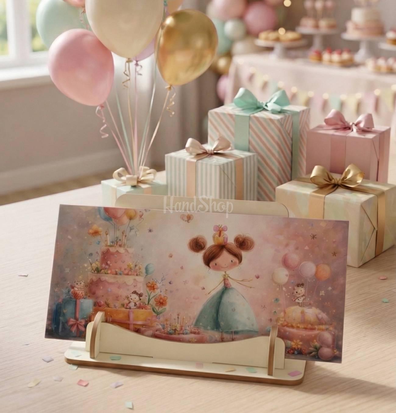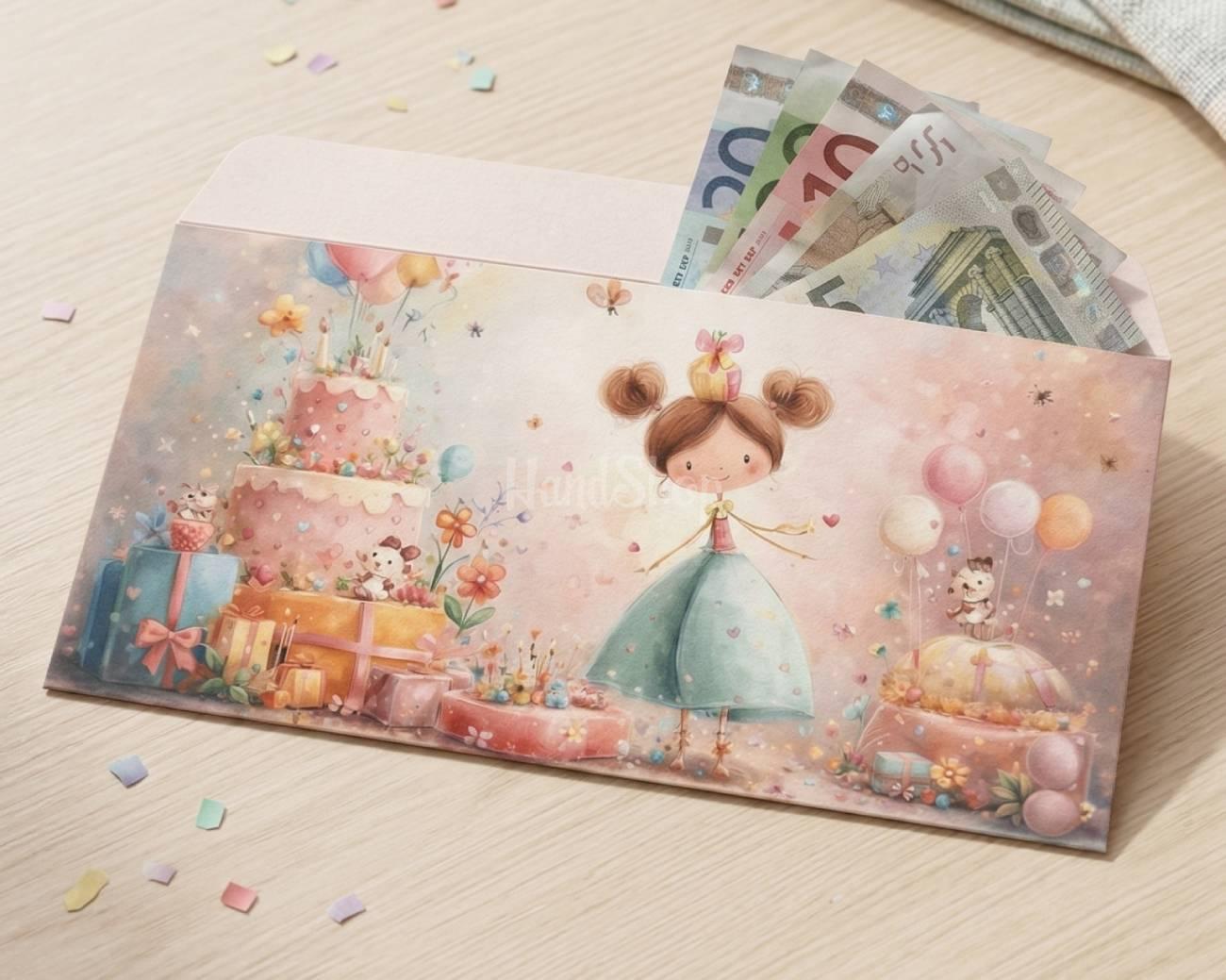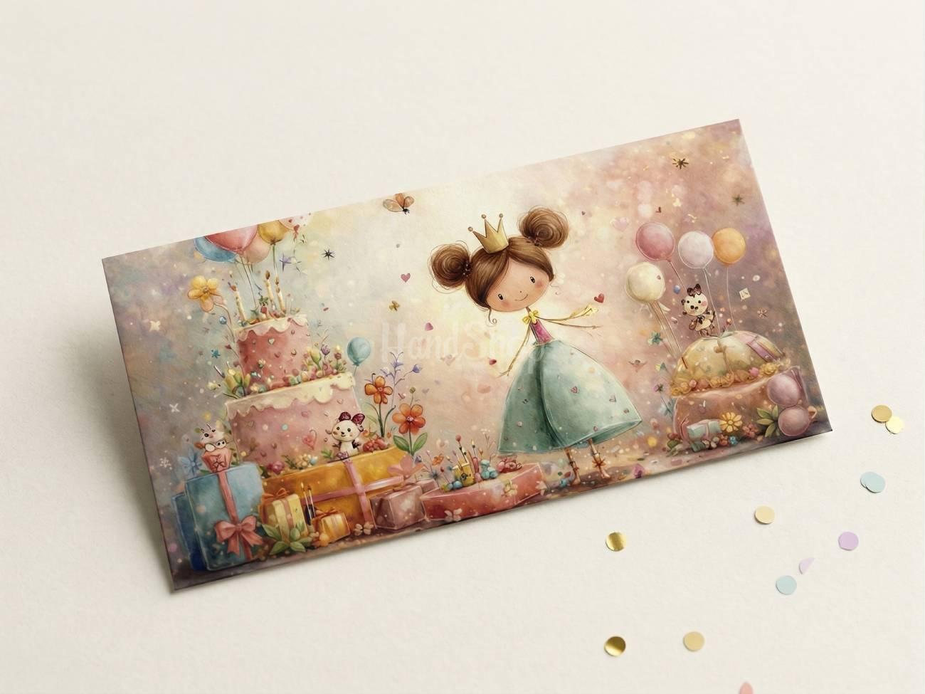 Особенности: детские конверты для денег – оригинальный праздничный конверт 16,7 х 8,4 см для девочки на день рождения. Оригинальный праздничный конверт размером 16,7х8,4 см изготовлен из качественного дизайнерского картона. Он приятен на ощупь, плотен и выглядит стильно и изысканно – настоящее произведение искусства, которое подчеркнет важность события. Яркий детский дизайн с очаровательной именинницей в праздничном платье, тортиком, шарами и подарками создает атмосферу радости и сказки. Такой конверт непременно очарует девочку всех возрастов и сделает момент получения подарка еще более особенным. Конверт для денег – это идеальное дополнение к денежному подарку на день рождения – красиво, празднично и незабываемо! Детский конверт для денег – это не просто упаковка для подарка, а настоящий элемент праздника, создающий настроение с первого взгляда.
