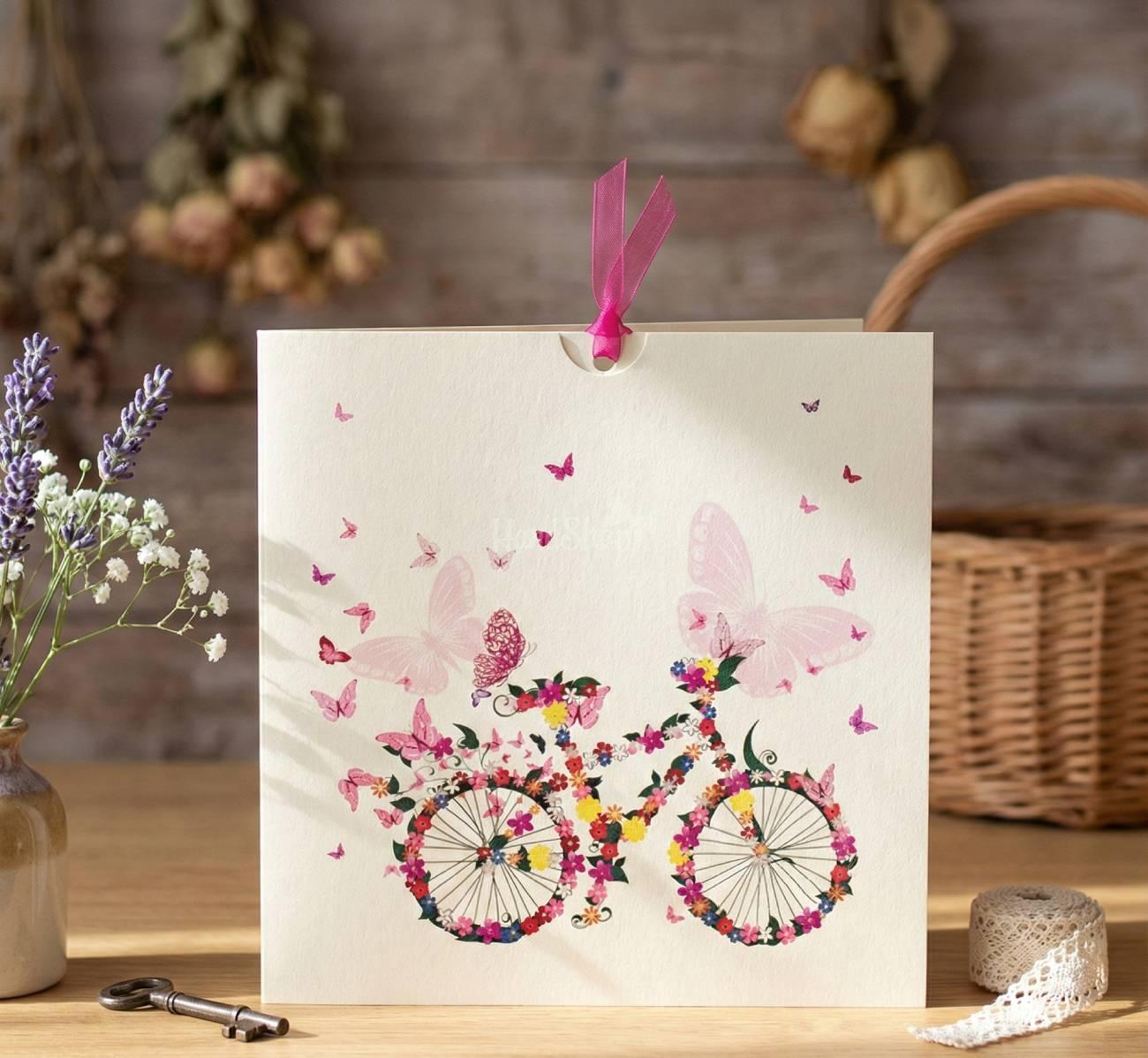 Особенности: поздравительные открытки конверты – красивая романтическая открытка квадратной формы 16 х 16 см, изготовленная из турецкого бежевого дизайнерского картона, который приятен на ощупь и выглядит стильно и изысканно – настоящее произведение искусства. Особое очарование свадебной открытке конверта придает авторский рисунок — велосипед в цветах и бабочках. Этот образ символизирует путешествие в новую совместную жизнь, легкость чувств и красоту первого шага вместе. Эта женская открытка – как легкий ветерок в летний день: мягкая, радостная и полная вдохновения. Подарите пожелания, которые останутся с ними навсегда. Внутри открытки велосипед – изящная вкладка для поздравлений на розовой ленте, которую можно легко вынуть и заполнить собственноручно и добавить приятный денежный сюрприз. Эта романтическая открытка – как воспоминание о легком весеннем дне, когда любовь расцветает среди цветов и бабочек. Это идеальный формат для пожеланий, которые не теряются. Открытка, которую хочется хранить годами.