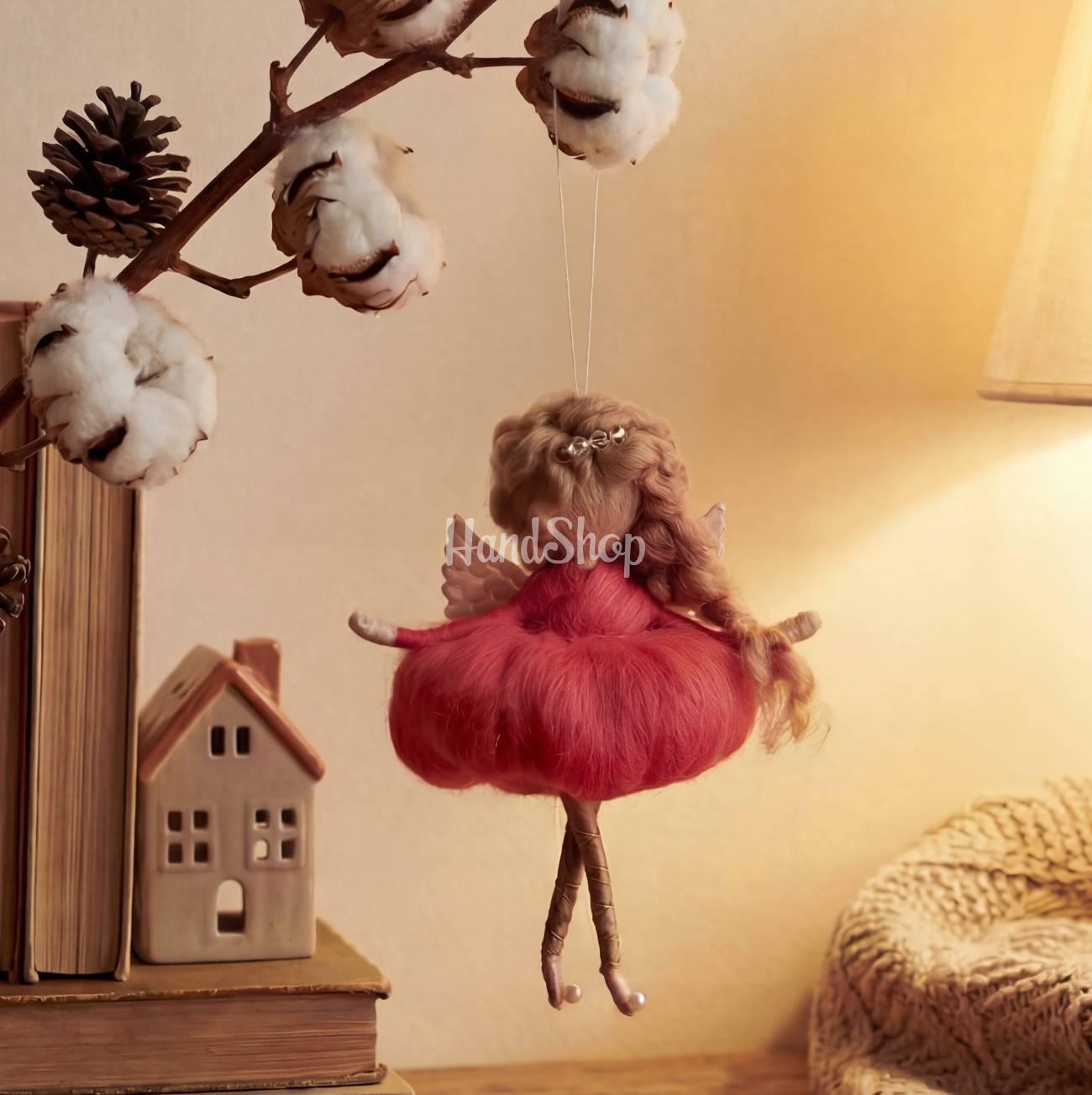 Особенности: куклы валяния шерсти детские куклы подвески сувениры — мини кукла своими руками небольшого размера до 14 см — сувенир подвеска. Детская игрушка кукла выполнена из шерсти мериноса в милом образе ангел балерина фея на подвесной нити. Кукла подвеска ангел с белокурыми волосами в косичке – сзади с белыми ангельскими крылышками. Кукла из шерсти сделана в виде сувенира подвески на ниточке. Кукла валяная из шерсти в ярко красно-розовом пышном платье можно использовать в качестве подарочных сувениров подвески вашим любимым и родным. Маленькой из шерсти куклой можно украшать детский интерьер, вешать в машине. Мини куклы своими руками – кукла из шерсти балерина феечка – сувенир и талисман родным девушкам! Детская кукла балерина – куклы свалены из шерсти порадует и очарует не только ребенка, но и взрослого!