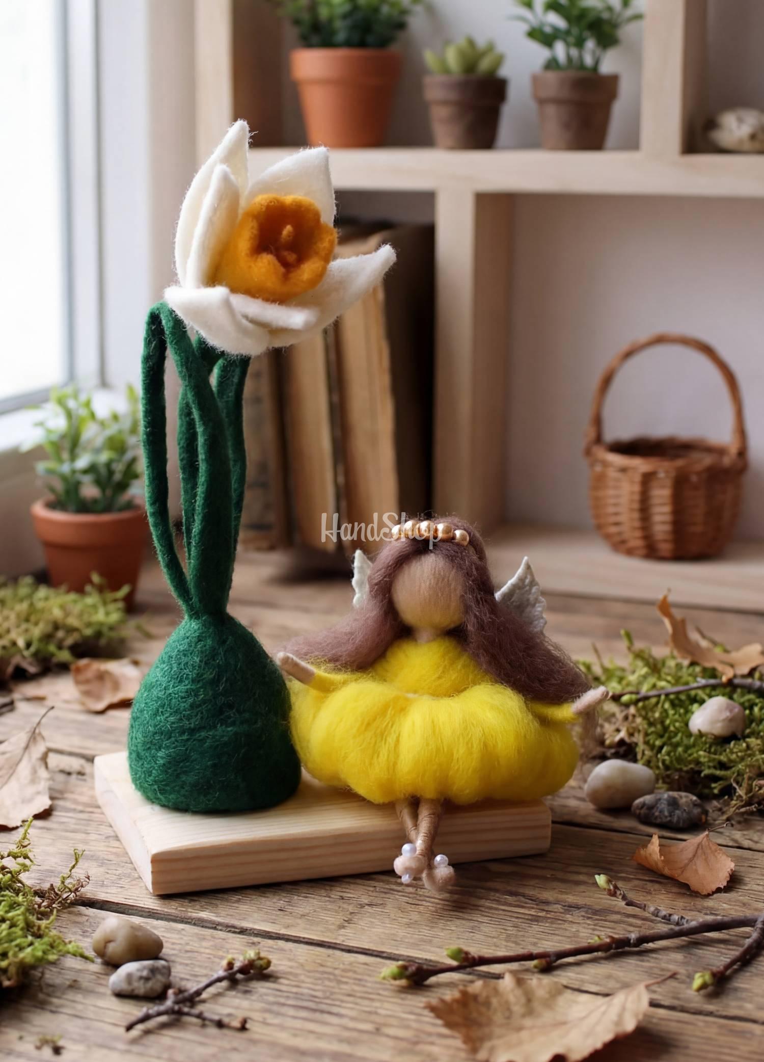 Особенности: сувенирные куклы и цветы ручной работы – маленькие куклы валяния шерсти – весенние женские сувениры. Мини кукла веснянка своими руками небольшого размера до 15 см с весенней композицией на деревянной подставке 10 х 8 х 16 см. Кукла феечка на 8 марта с весенним цветком нарцисс. Детская кукла в желтом пышном платье с длинными прямыми волосами, прекрасно подчеркивающими ее нежность. Эта милая кукла веснянка фея на подставке станет отличным подарком для ваших близких, придавая атмосферу тепла и весеннего настроения. Идеально подходит для празднования 8 марта или элегантный сувенир для дома! Такой цветочный сувенир станет отличным подарком к 8 марта, дополнив праздничную атмосферу и подарив радость вашим близким. Благодаря ручной работе каждая кукла с нарциссом неповторима и способна стать настоящим символом весеннего обновления, тепла и красоты. Это идеальный выбор для любителей уникальных и стильных декоров, а также для ищущих особый подарок, который будет приносить радость каждый день. Изготовленная из натуральных материалов, эта кукла веснянка нарцисс также может стать отличным подарком для коллекционеров или просто для тех, кто ценит ручной труд и качество.