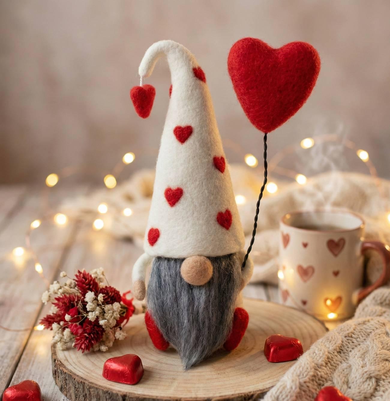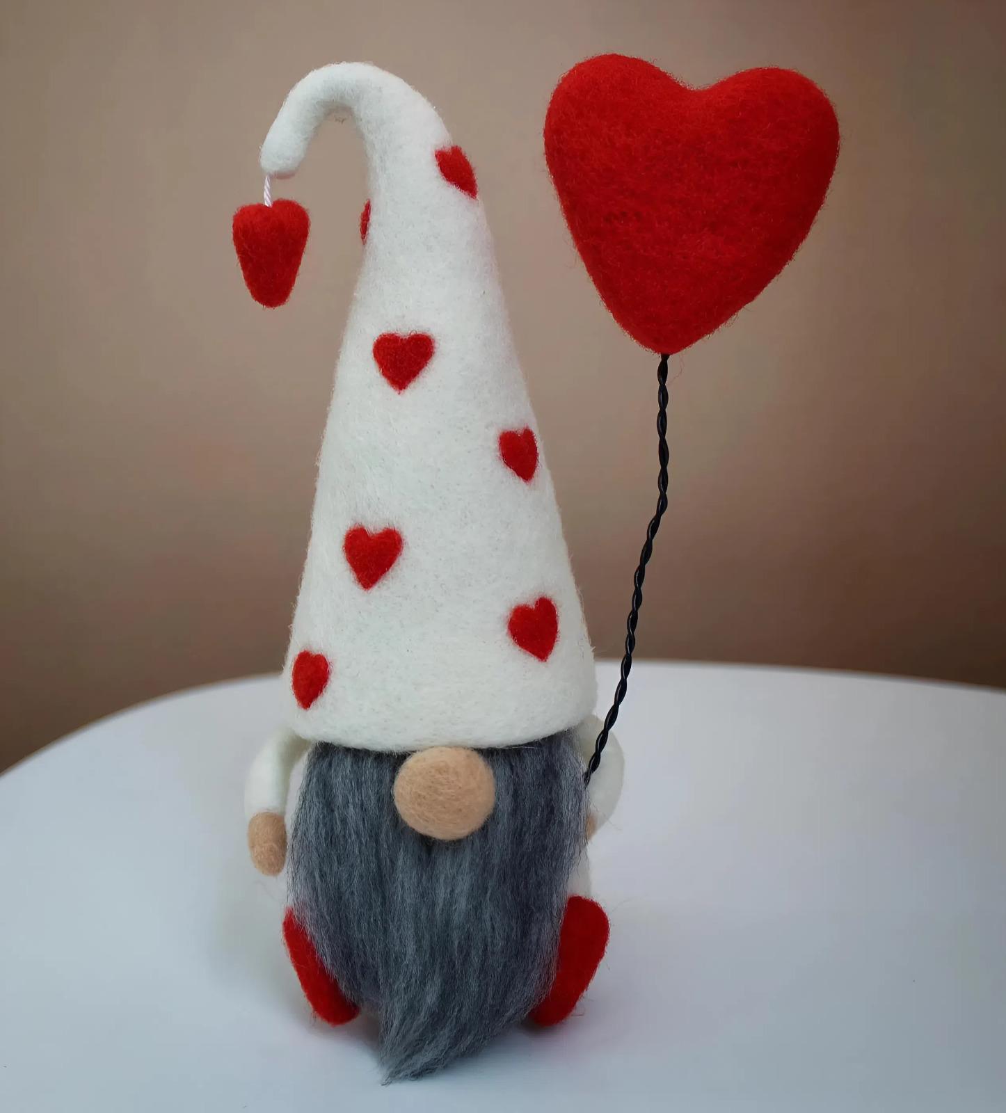 Особенности: игрушки ручной работы – сувенирный гном валяния шерсти – романтический сувенир на День святого Валентина. Белый гномик серой бородой из шерсти своими руками небольшого размера до 17 см, что делает его идеальным декоративным элементом для любой комнаты. Романтический гном ручной работы – это волшебный сувенир, который наполнит простор теплом, уютом и праздничным настроением. Каждый гномик создан вручную в технике валяния из нежной мериносовой шерсти, благодаря чему носит мягкую фактуру и живой, душевный характер. Сувенирный гном высотой до 17 см идеально подходит для декора полки, стола или комода. Праздничный образ романтического валентина дополнен ярким акцентом – шариком в виде красного сердечка на проводе, символизирующим любовь, заботу и искренние чувства. Внимательно проработанные детали, гармонические цвета и тепло настроение делают каждого гномика неповторимым. У этих авторских игрушек нет двойников: каждый гномик имеет свое настроение и характер, ведь производится с любовью и вдохновением. Они станут отличным романтическим подарком ко Дню святого Валентина, годовщине, свадьбе или просто как милый знак внимания близкому человеку. Подарите частицу магии и романтики – сувенирные гномы из шерсти не только украсят интерьер, но и подарят теплые эмоции, которые хочется надолго сохранить.