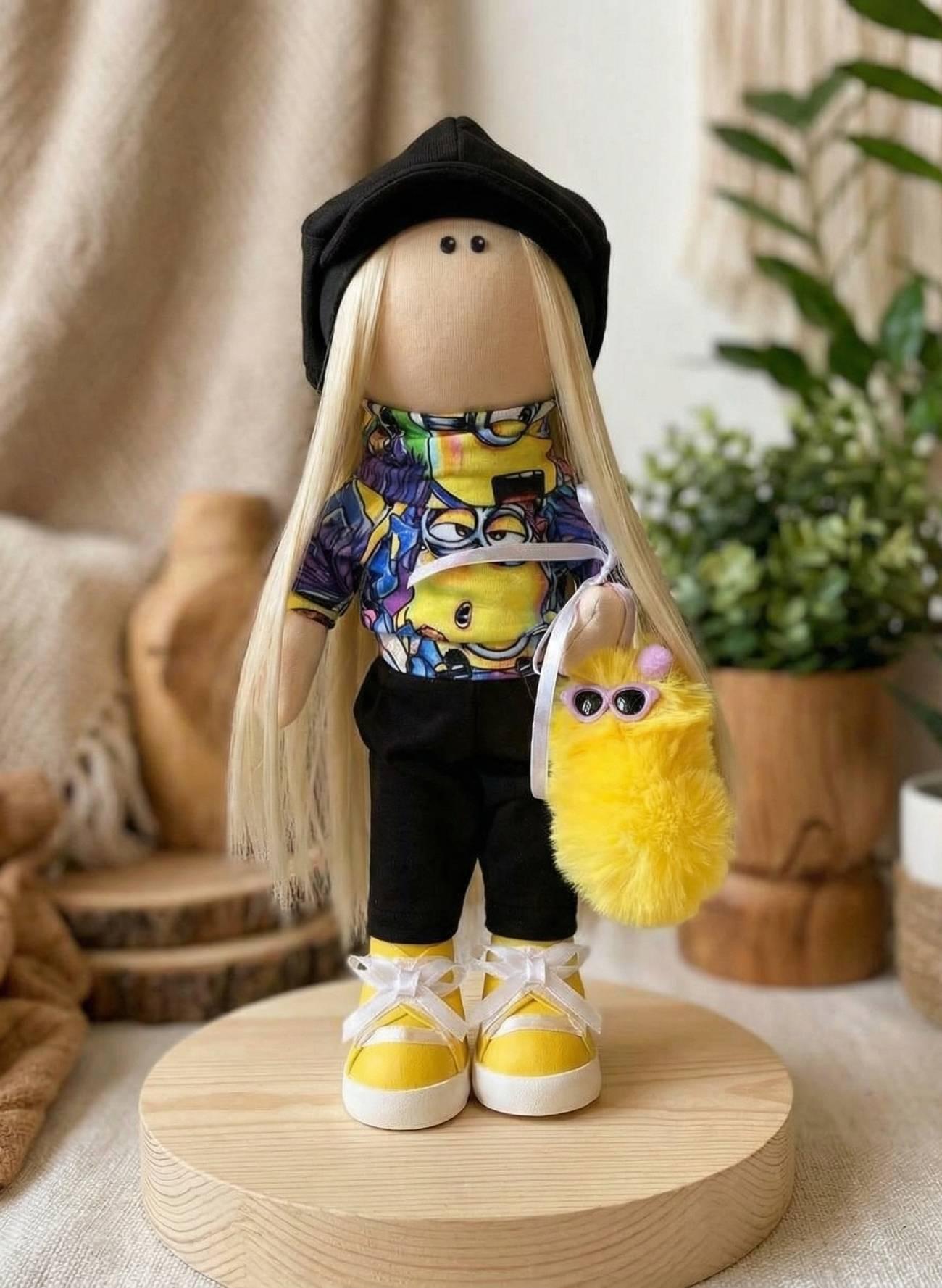 Особенности: интерьерная кукла ручной работы – большая авторская интерьерная кукла 37 см в ярком детском образе настоящей поклонницы Миньонов и черной шапочке кепке. Тильда кукла Миньон блондинка с длинными волосами одета в разноцветный гольф с притом веселых миньончиков и черные прямые штанишки. В кукле текстильной шапочки, одежду и туфельки не снимаются! Текстильная интерьерная кукла с длинными прямыми белокурыми волосами стоит самостоятельно, без опоры! Кукла текстильная интерьерная сувенирная блондинка Миньон украшена мягкой пушистой игрушкой — создана для поклонников Миньонов! Интерьерная кукла сувенирная блондинка – сделана своими руками, с частицей души и теплым настроением! Эта интерьерная кукла Миньон станет отличным подарком для детей и взрослых, любящих оригинальные игрушки и стильный декор. Она придаст весеннему настроению и ярким краскам к любому помещению! Не упустите возможность украсить свое пространство этой замечательной авторской куклой тильдой Миньон!