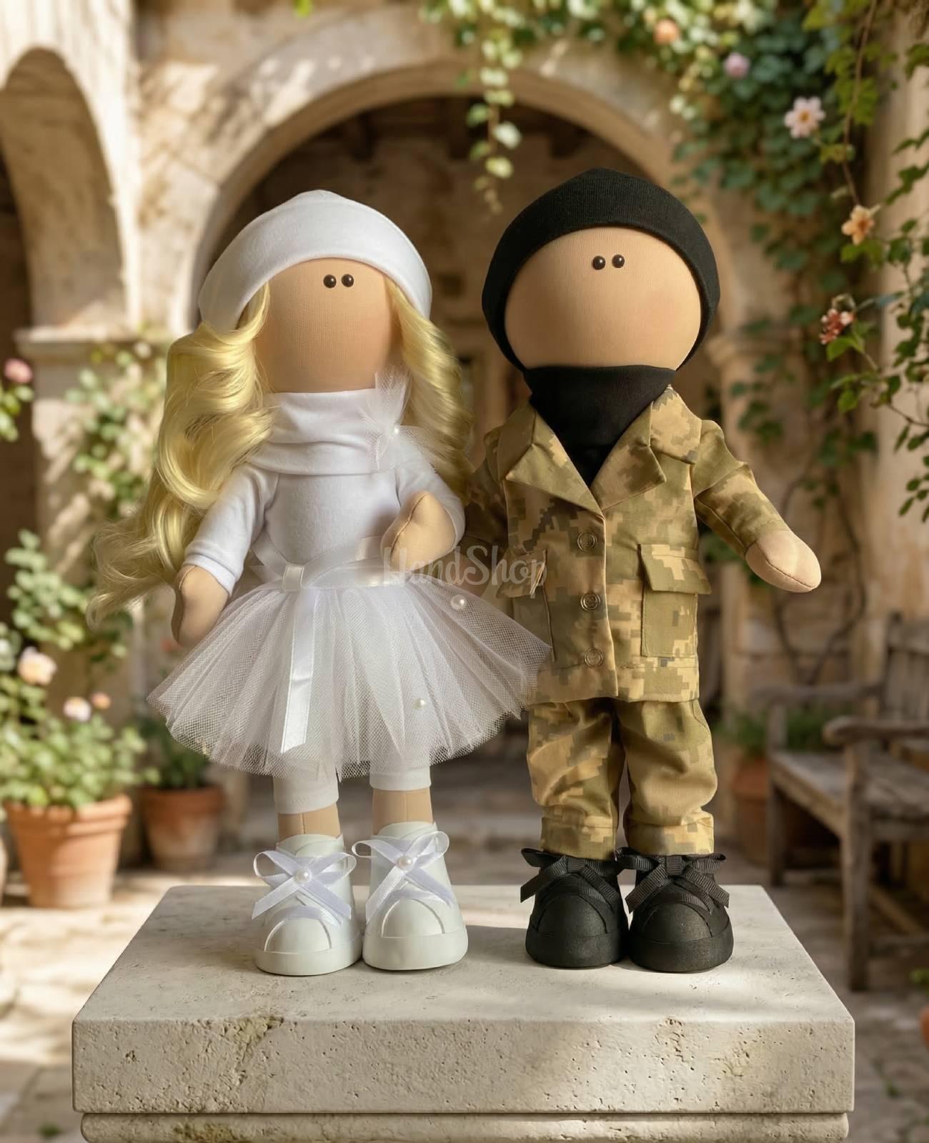 Особенности: авторские текстильные куклы ручной работы по 37 см в патриотических образах современных молодоженов. Пара авторских текстильных кукол стоят самостоятельно, одежда в свадебных куклах не снимается! Девочка тильда валентинка кудрявая блондинка с длинными волосами в белом свадебном платье и мальчик тильда кукла авторский военный защитник в украинской форме. Кукла парень тильда в образе молодого современного защитника Украины. Кукла военный одета в современную модель милитари формы Вооруженных Сил Украины, что придает ей еще большую подлинность и реалистичность. В куклах текстильных шапочки, одежду и обувь не снимаются! Авторские тильда куклы украинцы – отличный и оригинальный подарок молодоженам. Авторские текстильные куклы ручной работы украинцы будут талисманом и сувениром вашим родным и близким из Украины!