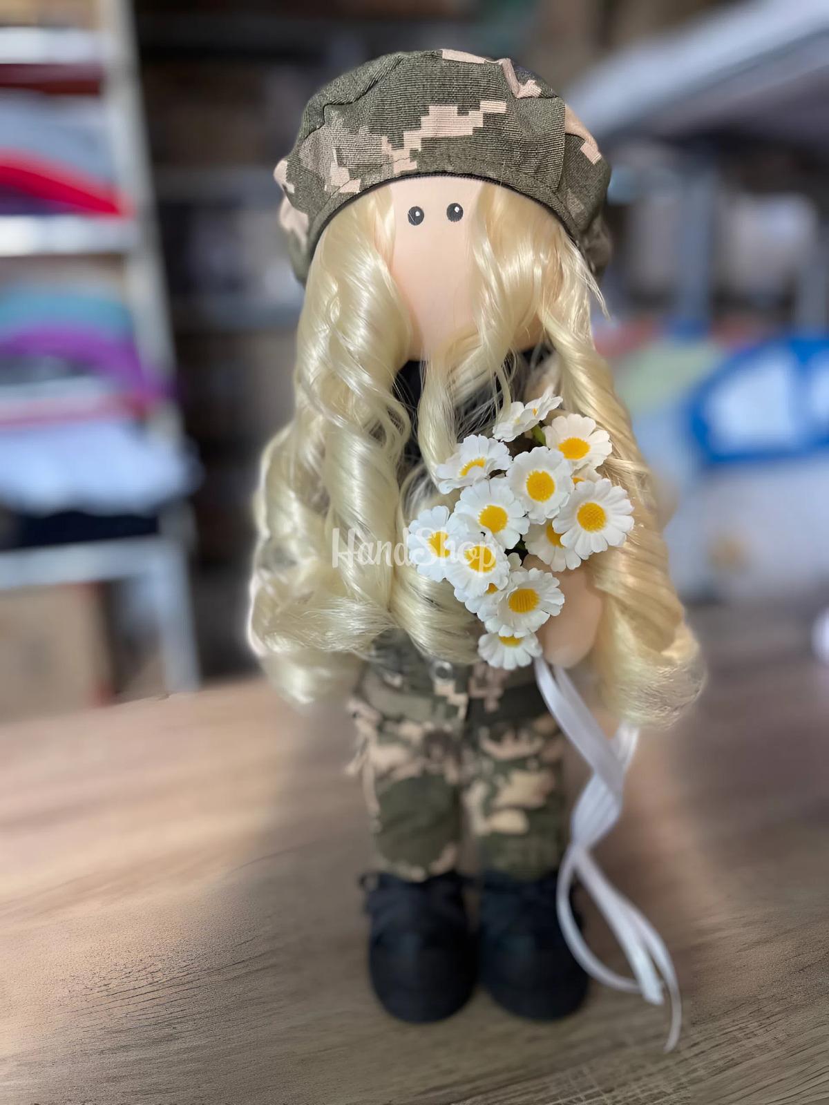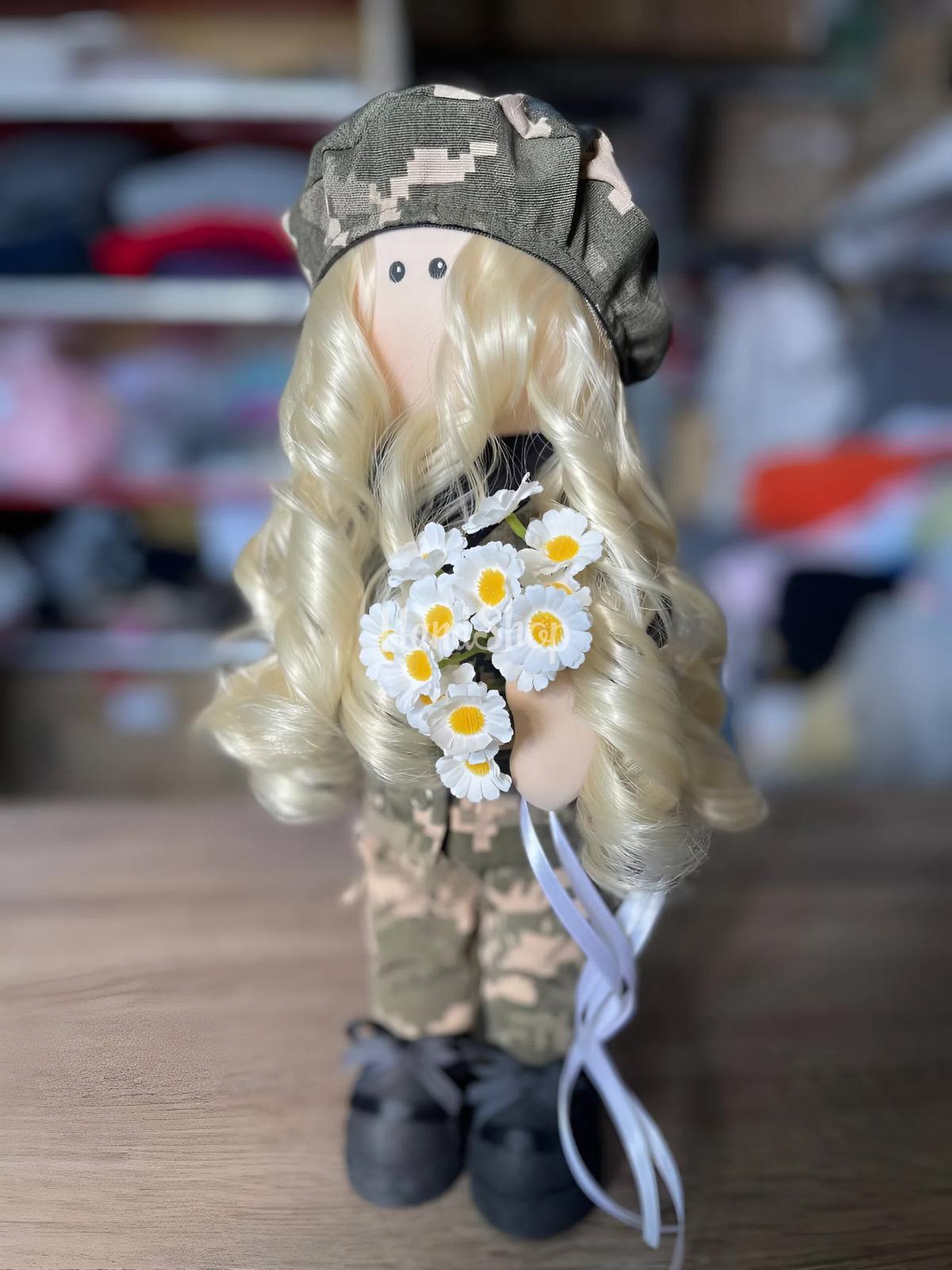 Особенности: авторская текстильная кукла ручной работы – сувенирная тильда 37 см в патриотическом образе современной военной защитницы украинки. Игрушка кукла блондинка с кудрявыми длинными волосами, в стильном милитаре форме Вооруженных Сил Украины, символизирует силу, нежность и несгибаемый дух наших женщин-защитниц. Авторская текстильная кукла блондинка кудрявая военная стоит самостоятельно, одежда военной кукле не снимается! Девочка тильда блондинка с длинными волосами военная защитница одета в украинскую форму с цветами полевыми белыми ромашками в руках – вынимаются! Кукла девушка блондинка тильда в образе молодой современной защитницы Украины. Кукла военная одета в современную модель милитари формы Вооруженных Сил Украины, что придает ей еще большую подлинность и реалистичность. Эта текстильная кукла военная – не просто сувенир, а символ женской отваги, красоты и любви к Украине. Она станет отличным подарком для коллекционеров, патриотов или как оригинальный элемент декора вашего дома. Наша уникальная кукла тильда украиночка военная – это трогательный образ молодой современной украинской защитницы, созданный с любовью и вдохновением.