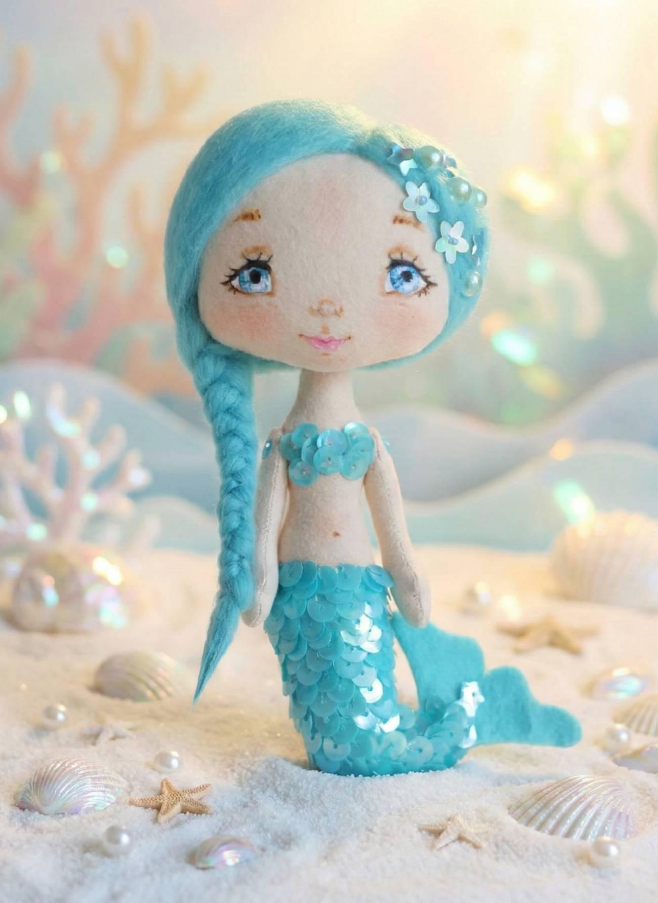Особенности: детские куклы ручной работы – мини кукла своими руками русалка с голубовато-бирюзовыми волосами с ростом 15 см. Кукла маленькая русалочка с длинной косичкой. Игровая детская кукла выполнена в образе сказочной куклы русалки с бирюзовыми волосами и паетками на волосах, придающими ей нежность. Хвост куклы русалочки выполнен из переливающихся на свете блестящих паеток. Куколка своими руками русалочка стоит только с опорой! Детские куклы для девочек сувениры русалки – в индивидуальном экземпляре! Эта игровая кукла русалка не только станет любимой игрушкой вашего ребенка, но и воплотит в жизнь лучшие морские фантазии. Позвольте вашему ребенку погрузиться в мир сказки и мечтаний вместе с нашей мини куколкой русалкой! Эта маленькая русалочка станет отличным аксессуаром для коллекции или незабываемым подарком для вашего ребенка. Идеально подходит для игры или декора детской. Созданная с любовью и вниманием к деталям, она подарит радость и восхищение каждому владельцу!