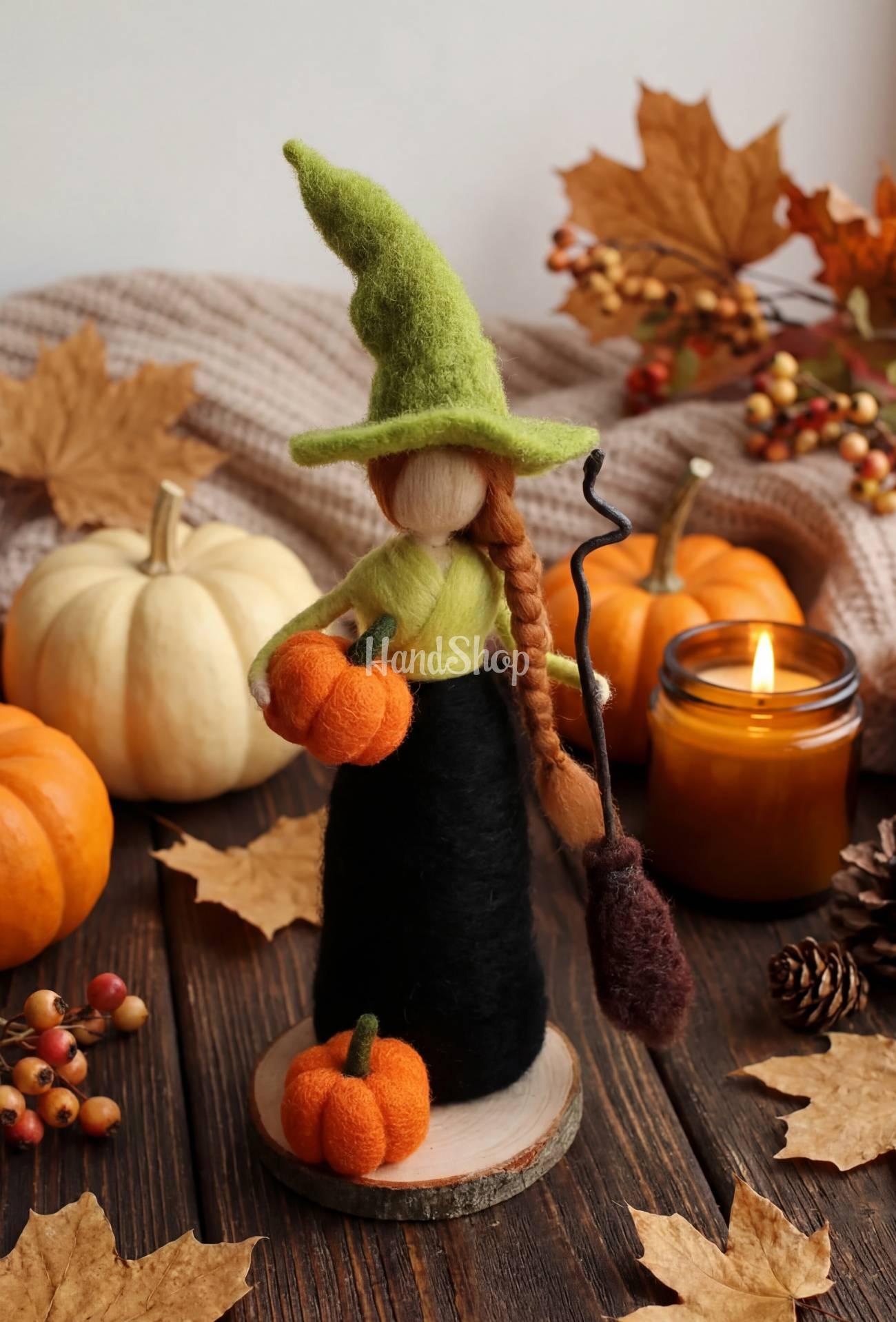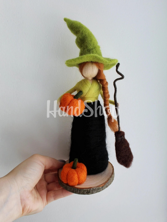 Особенности: кукла из шерсти ручной работы – сувенирная кукла рыжая ведьмочка Halloween 2025 на деревянной подставке. Интерьерная кукла рыжеволосая ведьма своими руками среднего размера 18-20 см, что делает ее идеальной для декора или коллекционирования или презентом на праздник Halloween 2025. Это не просто игрушка — это произведение искусства, выполненное в технике сухого валяния из натуральной шерсти осенние сказки. Эта интерьерная кукла олицетворяет образ доброй осенней ведьмы. Ее длинная рыжая коса, острая шляпка, салатово-черное платье и маленькая метла в руках — каждая деталь продумана до мелочей, чтобы создать завораживающий образ с первого взгляда. Она будто сошла со страницы волшебной сказки, чтобы стать украшением вашего дома или неповторимым подарком для близких. Кукла оберег ведьма стоит на деревянной подставке, рядом с декоративными тыквами – еще один штрих, подчеркивающий дух праздника Halloween. Не упускайте возможности добавить немного магии к своей жизни или порадовать близкого человека в Halloween 2025. Заказывайте куклу-ведьмочку из шерсти на подставке уже сегодня – волшебная осень начинается с деталей!