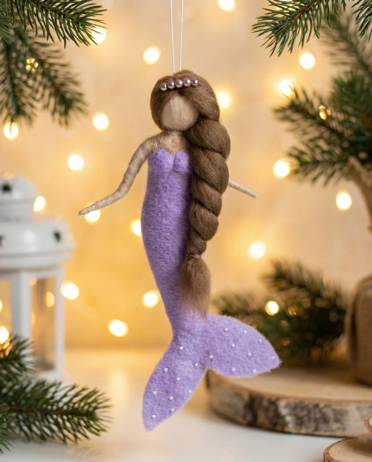 Особенности: куклы валяния шерсти – детские куклы подвески сувениры – сказочная кукла своими руками русалочка небольшого размера до 15 см – великолепный сувенир, который придаст сказочной атмосфере в любое жилище! Созданная вручную из высококачественной шерсти мериноса, эта маленькая, но очень подробно исполненная кукла выглядит как настоящая русалка из магического мира. Ее нежный фиолетовый цвет и длинные волосы, украшенные маленькими бусинками, создают атмосферу обаяния и загадочности. Благодаря небольшому размеру (до 15 см) кукла русалочка может быть использована в качестве декоративной подвески на ниточке, позволяющей ее легко повесить на стену, окно или даже на автомобиль. Кукла подвеска сказочная русалочка – это идеальный сувенир для детей и взрослых, которые любят сказочных существ и хотят добавить немного магии в своей жизни. Не упускайте возможности добавить этот волшебный элемент в свой интерьер или подарить его близким – нашу авторскую куклу русалочку подвеску!