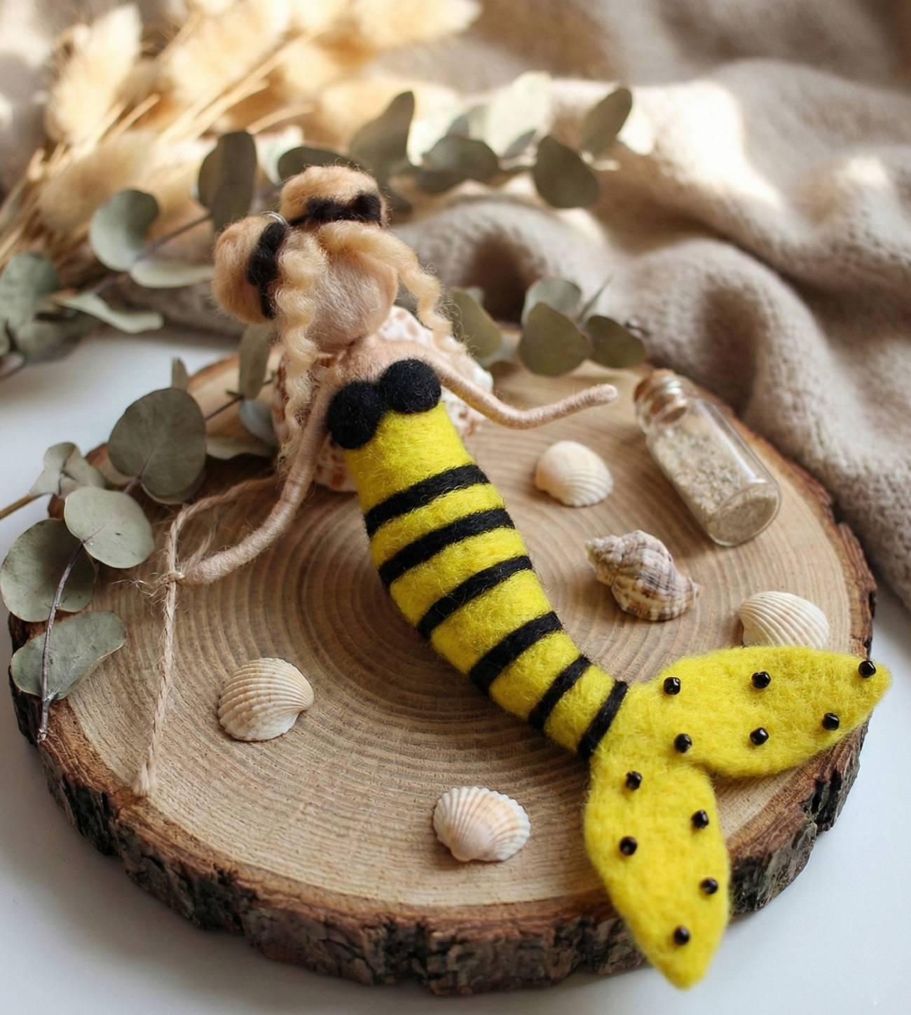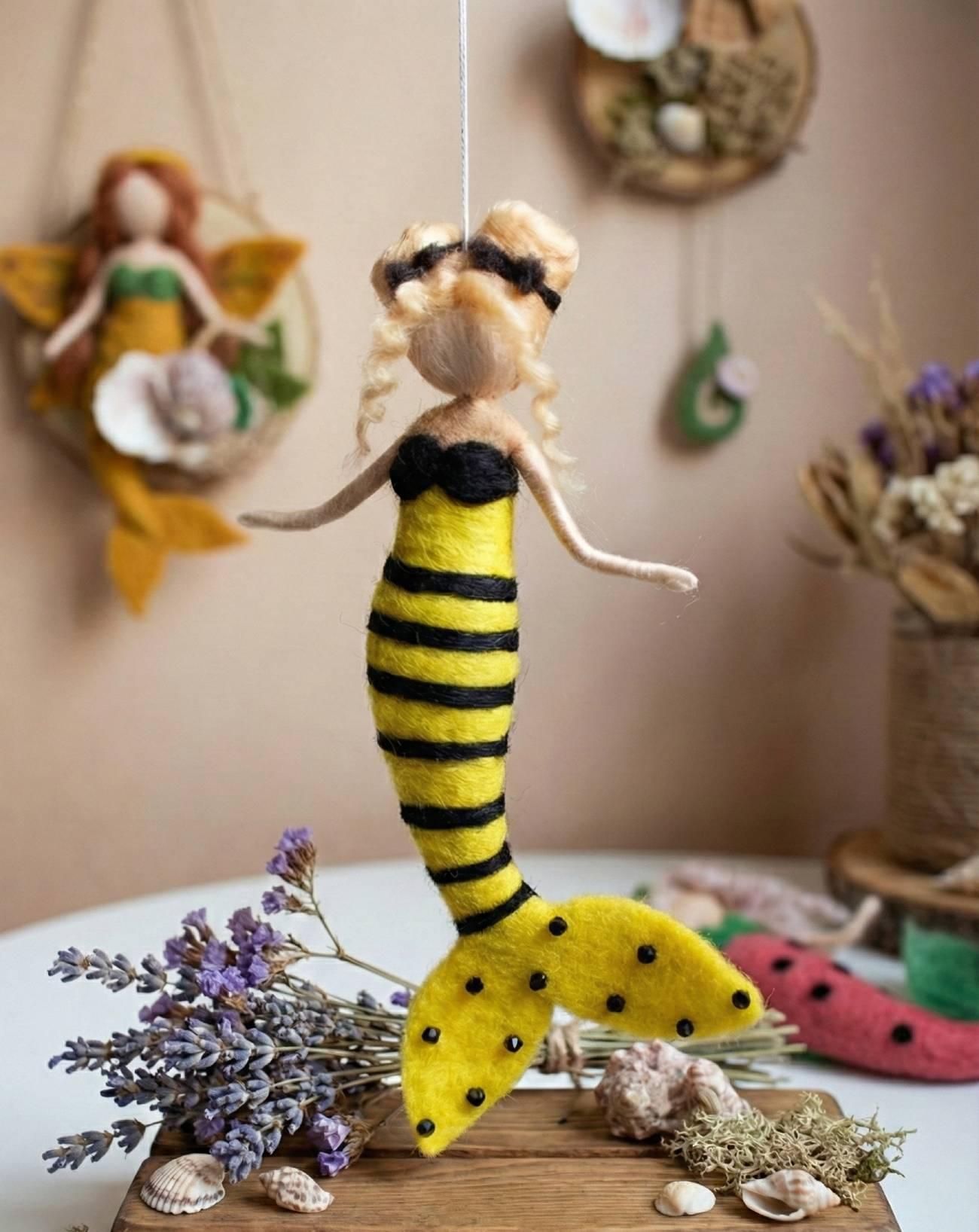 Особенности: куклы валяния шерсти – детские куклы подвески сувениры ручной работы – сказочная кукла своими руками русалочка небольшого размера до 15 см. Кукла сувенир подвеска русалочка сделана в образе веселой красивой девочки пчелки. Детская игрушка кукла выполнена из шерсти мериноса в милом образе маленькой сказочной русалочки пчелки на подвесной нити. Кукла подвеска русалка пчелка с белокурыми волосами. Сувенирная кукла русалочка желтого цвета имеет украшенные волосы черными бантиками. Кукла из шерсти русалка сделана в виде сувенира подвески на ниточке. Куклу валянную из шерсти русалочка можно использовать в качестве подарочных сувениров подвески вашим любимым и родным. Маленькой из шерсти куклой русалкой можно украшать детский интерьер, вешать в машине. Мини куклы своими руками русалка – кукла из шерсти – сувенир и талисман маленьким девушкам! Детская кукла русалка – куклы свалены из шерсти порадует и очарует не только ребенка, но и взрослого!