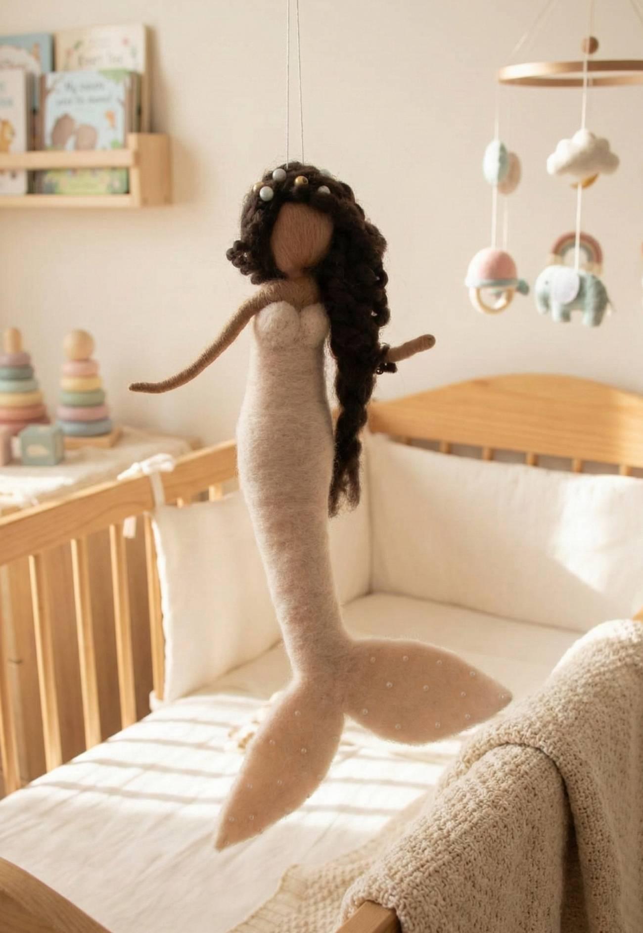 Особенности: куклы валяния шерсти – детские куклы подвески сувениры – сказочная кукла своими руками русалочка небольшого размера до 15 см – сувенир подвеска. Детская игрушка кукла выполнена из шерсти мериноса в милом образе маленькой сказочной русалочки принцессы на подвесной нити. Кукла подвеска русалка с длинными темными волосами. Сувенирная кукла русалочка бежево-молочного цвета имеет украшенные волосы бусинками. Кукла из шерсти русалка сделана в виде сувенира подвески на ниточке. Куклу валянную из шерсти русалочка можно использовать в качестве подарочных сувениров подвески вашим любимым и родным. Маленькой из шерсти куклой русалкой можно украшать детский интерьер, вешать в машине. Мини куклы своими руками русалка – кукла из шерсти принцесса – сувенир и талисман маленьким девушкам! Детская кукла русалка – куклы свалены из шерсти порадует и очарует не только ребенка, но и взрослого!