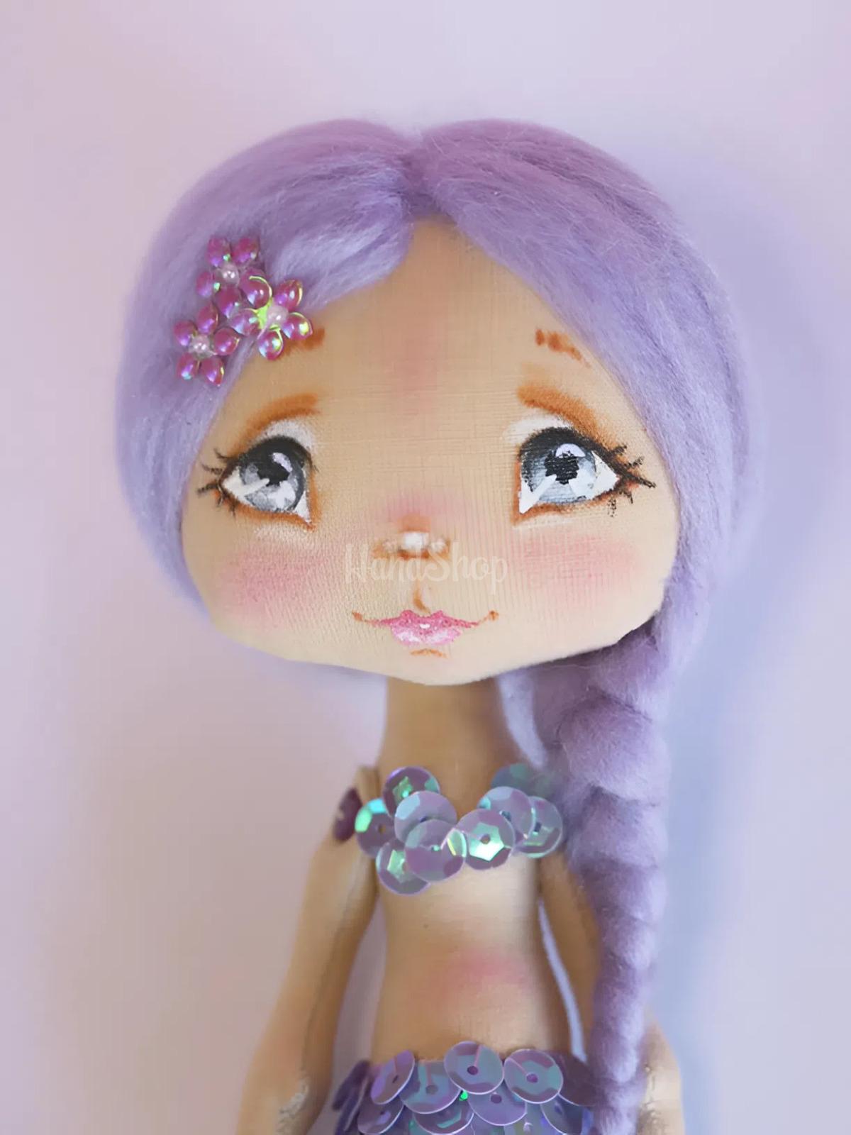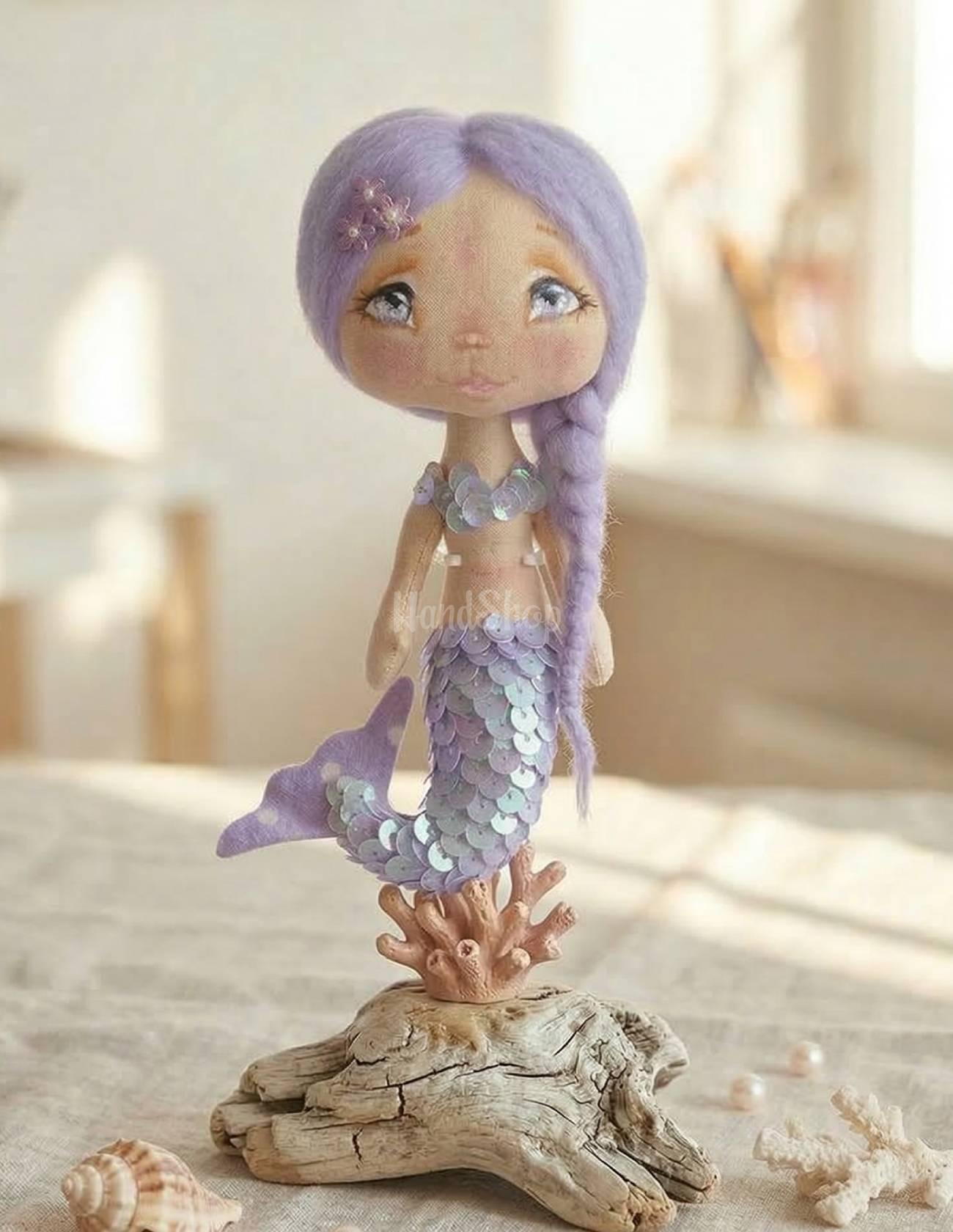 Особенности: сувенирные детские куклы ручной работы – мини кукла своими руками русалка с фиолетовыми волосами и ростом 15 см. Эта маленькая русалочка имеет длинную косу и нежные цветы блестки на голове, придающие ей особое очарование. Хвост выполнен из блестящих фиолетовых паеток, переливающихся на свете, создавая настоящую морскую магию. Все это делает куклу отличным сочетанием нежности и образа сказочной русалки. Кукла русалочка стоит с опорой, а ее игровой формат делает ее идеальной для детских игр, коллекций или декоративных композиций. Эта мини-кукла русалка станет любимой игрушкой вашего ребенка и подарит незабываемые морские приключения в мире фантазии. Подарите маленькую сказку своему ребенку – пусть его любимая русалочка оживет прямо в ее руках! Погрузитесь в мир детских фантазий с уникальной куклой ручной работы – мини-русалкой! Ее рост – 15 см, но она вмещает в себя целую сказку морского мира.