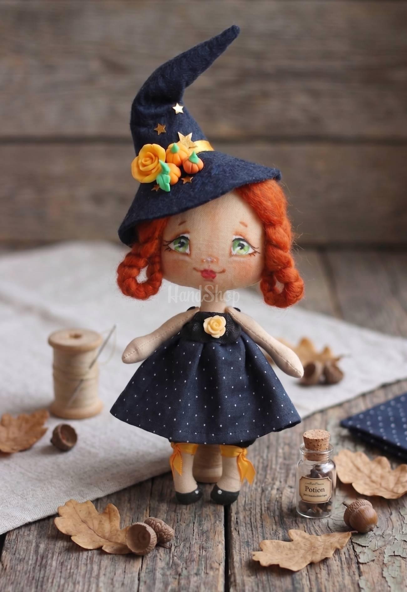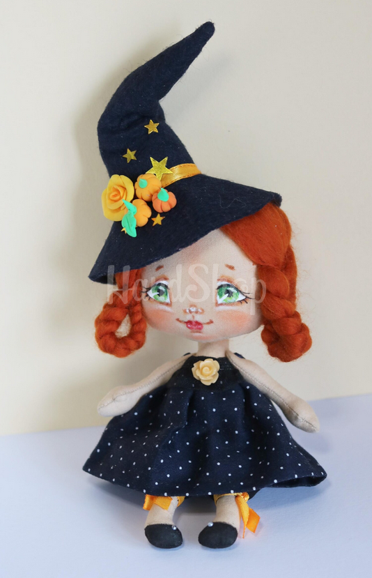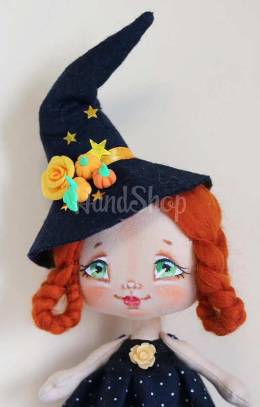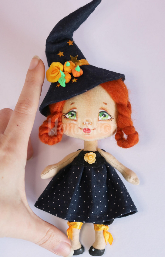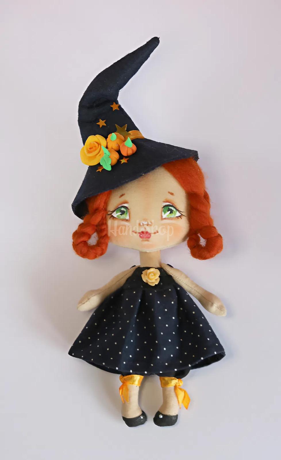 Особенности: интерьерная кукла ручной работы – сувенирная авторская интерьерная кукла рыжеволосая ведьмочка с черным колпаком, украшенным тыквами ручной работы, добавляет невероятного шарма и магии в любой интерьер. Хэллоуин кукла ведьма до 15 см в стильном черном оранжевом образе маленькой милой куклы ведьмы на Хэллоуин с тыквочками из пламени глины ручной лепки на шляпке. В текстильной кукле — сувенирная ведьма авторская кукла черный шапочка-колпак и черное длинное платье — не снимаются, что придает ей особую целостность. Каждый элемент куклы ведьмочки изготовлен с вниманием к деталям, а тыквы из полимерной глины, ручной лепки, на шляпке придают неповторимую индивидуальность. Эта сувенирная ведьмочка станет отличным подарком для любителей Хэллоуина, а также дополнит любую коллекцию авторских кукол! Наша маленькая мило зловещая кукла высотой до 15 см, в стильном черном-оранжевом наряде, создана для тех, кто любит атмосферу праздника.