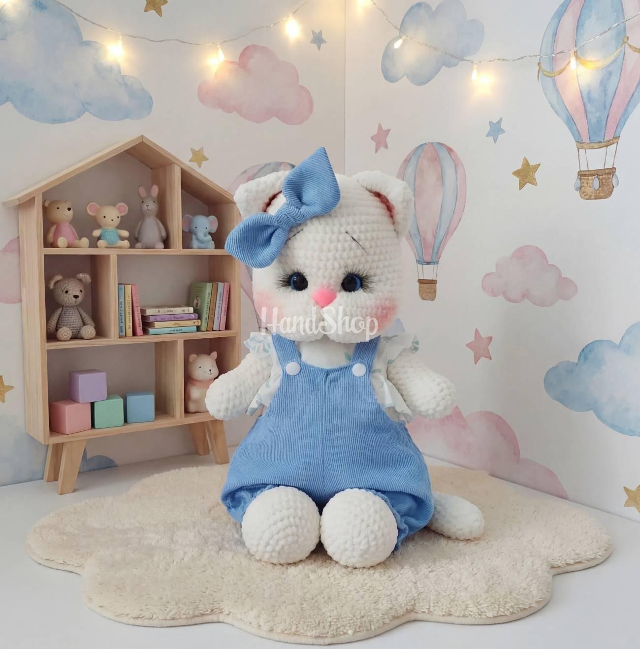 Особенности: детские игрушки ручной работы – милый белый вязаный котик девочка своими руками. Высотой 35 см, котик игрушка одет в стильный голубой комбинезон с хлопковой блузочкой и дополнен милым бантиком на голове – настоящая модница среди игрушек! Игрушка вязаная белый котик может сидеть, но его основное положение – стоя с опорой, что придает ему особый вид. Вязаный белый котик имеет подвижные ручки и ножки, что позволяет создавать разные позы и играть с ним разными способами. Выполненный из мягкой, гипоаллергенной плюшевой пряжи в белом, этот котик не только красив, но и безопасен для детей. Эта сувенирная большая игрушка кот, вязаная крючком, станет отличным подарком для ваших малышей или коллекционеров. Сменная одежда на котике – голубой комбинезон и бантик – позволяет легко создавать новые образы для игрушки, добавляя еще больше радости в игру! Прекрасный подарок для маленьких сердец – детские игрушки ручной работы котики, которые приносят тепло и нежность! Этот милый белый котик девочка, созданный с любовью, поражает своим очарованием и деталями. Добавьте в свою коллекцию или сделайте подарок малышам — этот котик принесет радость и тепло в любое жилище!