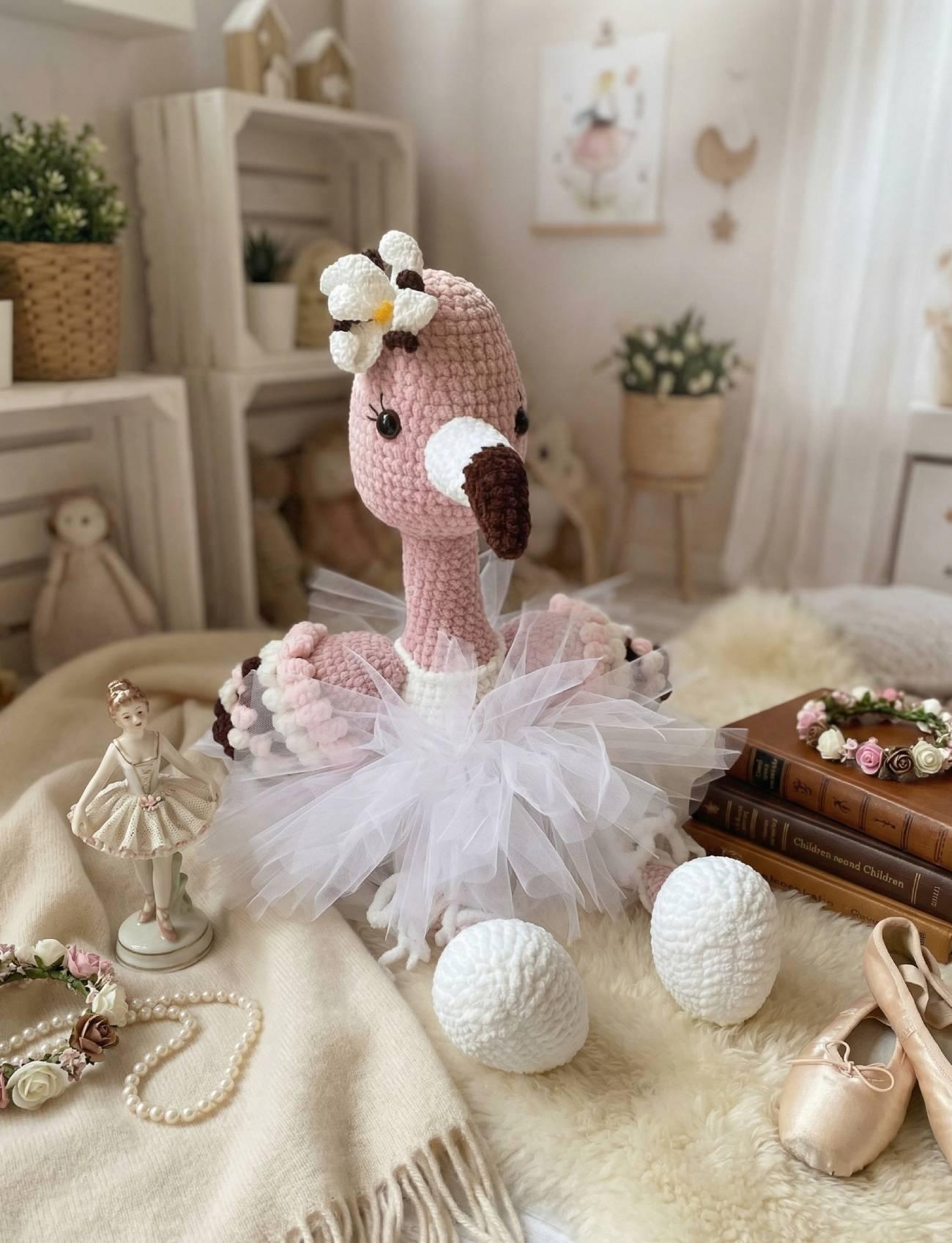 Особенности: большая вязаная игрушка крючком – большой розовый фламинго 50 см в образе танцовщицы балерины в пуантах. Фламинго детская игровая игрушка одета в пышную белую фатиновую юбку и вязаный белый боди. Балерина фламинго тильда вязанная в образе спортсменки танцовщицы в белых пуантах. В вязаной игрушке крючком розовый фламинго глаза надежно закреплены, все детали крепко пришиты – зафиксированы. У фламинго ручной работы балерины – большой красивый вязаный цветок ромашка на голове. Розовый фламинго тильда сувенирная балеринка – стоит и сидит только с опорой! Вязаные крючком игрушки – вязаный розовый фламинго крючком в образе спортсменки танцовщицы балерины – пропитан энергией, добротой и любовью!