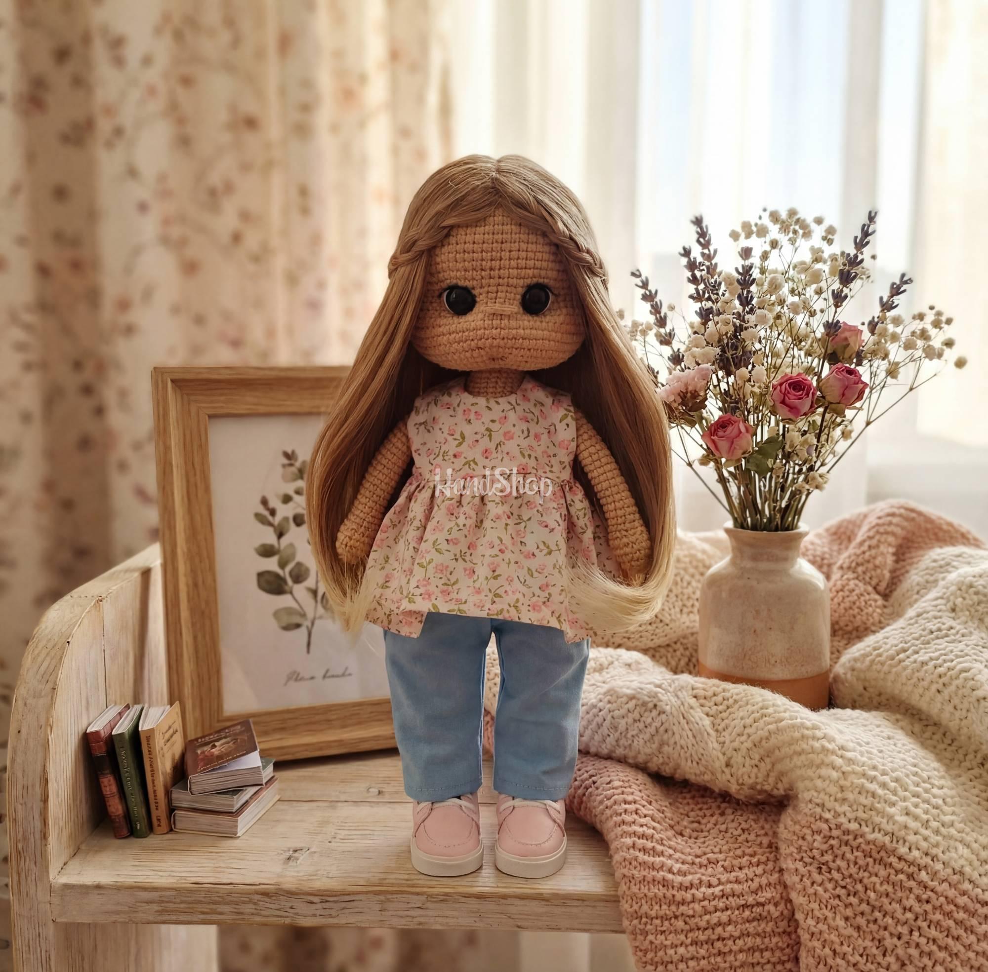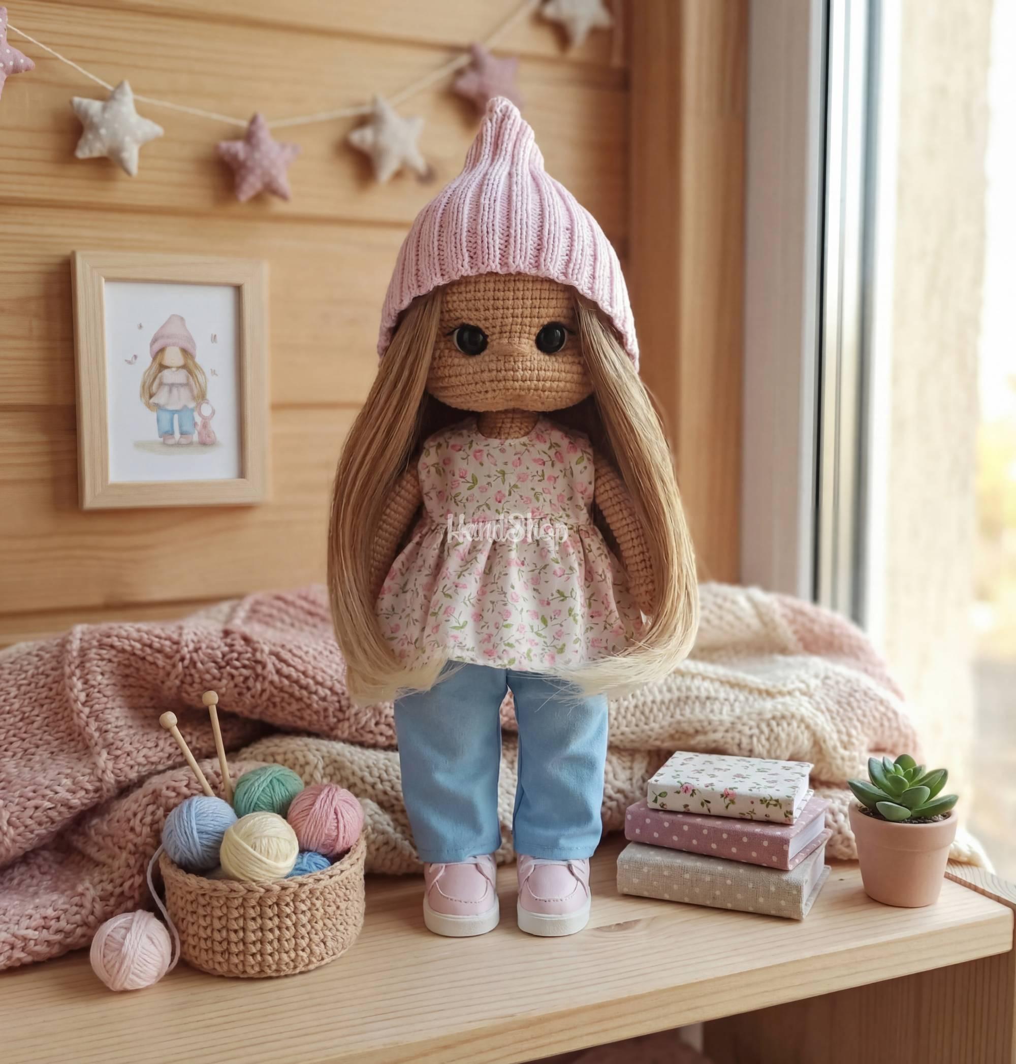 Особенности: большая вязаная кукла крючком – уникальная авторская вязаная кукла – идеальный выбор для тех, кто ищет не только стильный аксессуар, но и изделие ручной работы! Кукла с длинными каштановыми волосами станет настоящим украшением любой коллекции игрушек и привлечет внимание своей неповторимой внешностью. Она одета в стильную цветочную блузку тунику и голубые джинсы, создающие яркий, но вместе с тем элегантный образ. Особой изюминкой куклы является съемная вязаная розовая шапочка, которую можно одевать и снимать, позволяя изменять вид куклы в зависимости от настроения или образа. Все детали, включая глаза, надежно закреплены, а элементы наряда прочно пришиты, что обеспечивает длительный срок службы. Вязаная кукла имеет крепкую обувь, благодаря которой может стоять самостоятельно, что делает ее еще более удобной как для игры, так и для экспозиции. Ее можно ставить на полочку или использовать как часть детской коллекции, добавляя яркие акценты в любой интерьер. Эта кукла – не просто игрушка, а настоящее произведение искусства, выполненное вручную, что станет отличным подарком для маленьких модниц, а также для тех, кто ценит ручной труд и стильные детали.