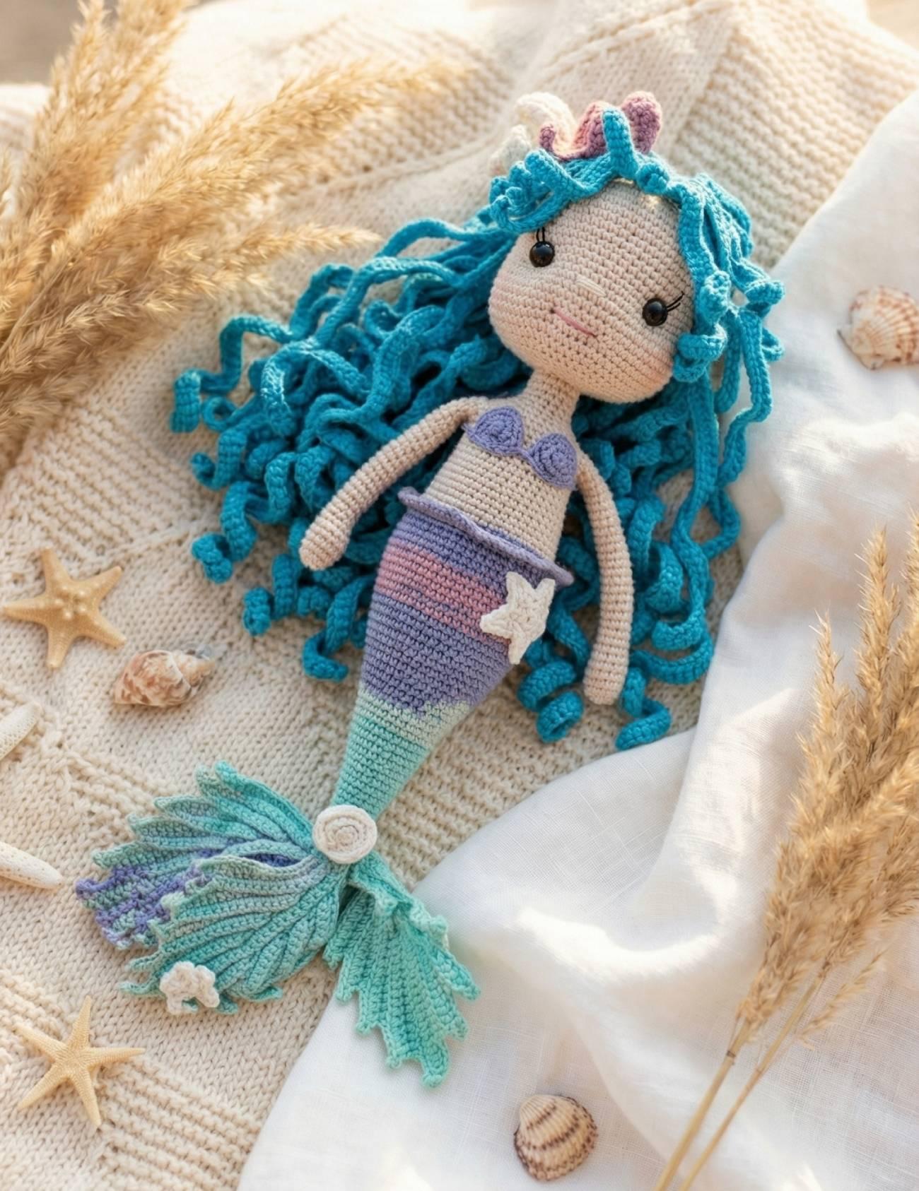 Особенности: большая вязаная кукла крючком — сувенир игрушка кукла 40 см в образе морской красавицы русальни с длинными кудрявыми голубыми волосами, что создает эффект невероятного обаяния. Ее волосы украшены миленькими вязаными цветочками, придающими образу еще больше нежности. Яркий и красочный разноцветный хвост, объемно выполненный и украшенный белой морской звездочкой и раковиной, делает куклу еще более выразительной и магической. Такая кукла превращает любую комнату в морское королевство! Кукла русалка выполнена в технике вязания крючком и является настоящим произведением искусства. Все детали куклы, включая глаза, надежно закреплены, а элементы, такие как цветочки и морские украшения, крепко пришиты, что обеспечивает безопасность во время игры и эксплуатации. Каждая кукла является уникальной благодаря ручной работе, что придает особый шарм. Кукла-русалка с голубыми волосами прекрасно подойдет как для детской игры, так и для декора комнаты. Она станет ярким акцентом на полке, витрине или под окном, создавая атмосферу сказки и магии. Кукла может стоять, что позволяет размещать ее в любом месте без забот. Сделайте праздник еще более ярким, подарив хендмейд морскую куклу-русалку! Она станет не просто игрушкой, но и настоящим другом, который будет радовать своим присутствием и обаянием.