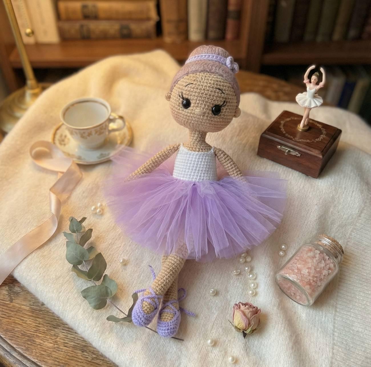 Особенности: большая вязаная кукла крючком – сувенир игрушка кукла 30 см в образе танцовщицы балерины в пуантах и в фиолетовой пачке. Кукла детская игровая балерина одета в пышную фатиновую юбку и белый вязаный боди. Балерина кукла тильда вязаная в образе спортсменки танцовщицы в лиловых пуантах. В вязаной куколке крючком глаза надежно закреплены, все детали крепко пришиты – зафиксированы. В куколке ручной работы балерины – каштановые волосы в виде прически шишечки. Кукла тильда сувенирная балеринка в пачке – стоит и сидит только с опорой! Вязаные крючком игрушки – вязаные куклы крючком в образе спортсменки танцовщицы балерины – пропитаны энергией, добротой и любовью!