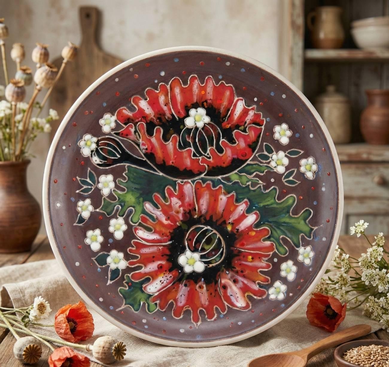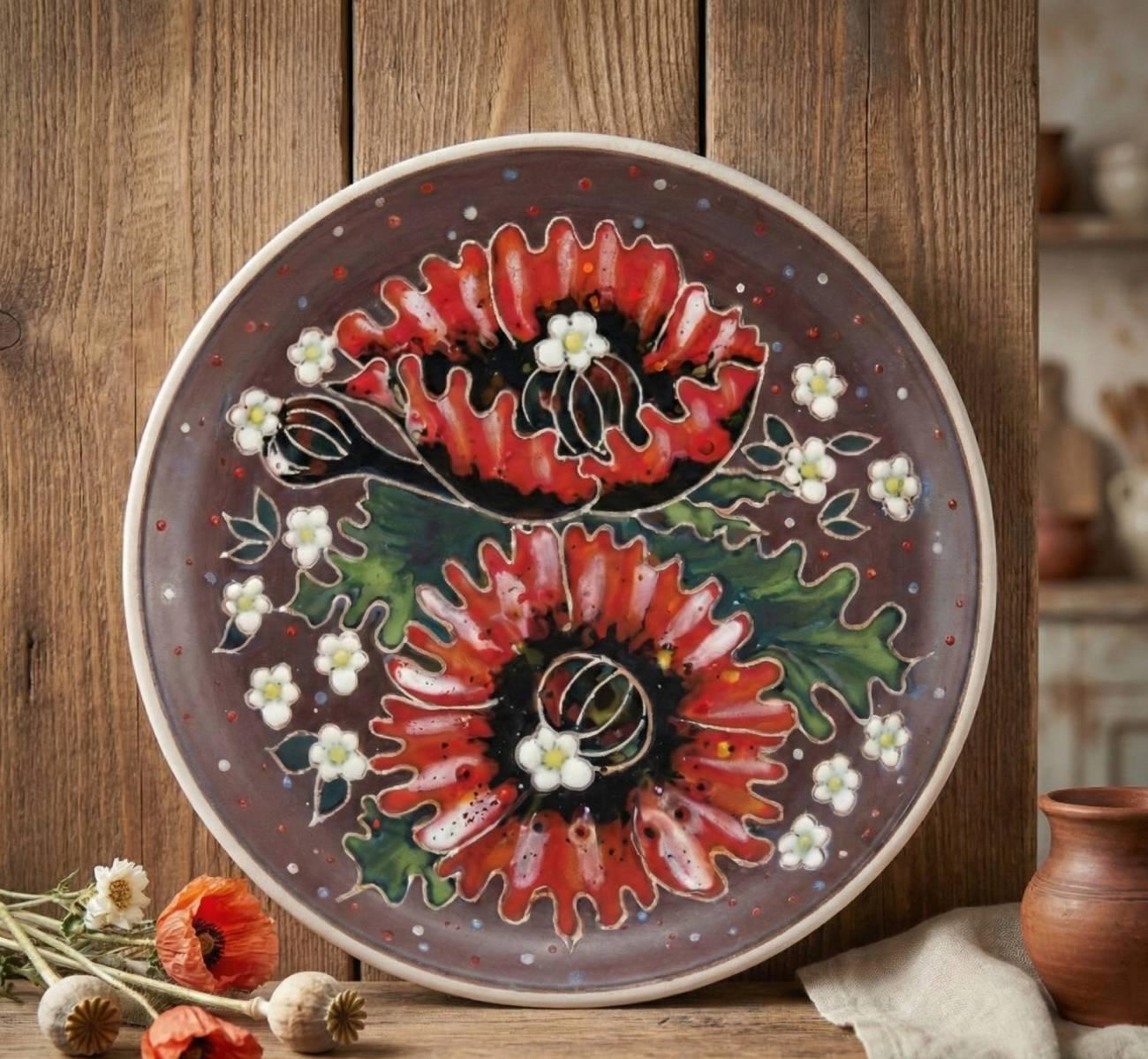Особенности: керамические сувениры ручной работы – авторская декоративная тарелка красные полевые маки ручная роспись.Большая декоративная тарелка из керамики 19 см в диаметре – это стильный элемент интерьера и настоящее произведение ручной работы. Авторская роспись с яркими красными полевыми маками придает изделию глубокую символику и особый характер. Маки давно считаются символом красоты, силы и украинской души, поэтому такая тарелка станет выразительным акцентом в любом пространстве. Тарелка диаметром 19 см и предназначена для декоративного использования. С оборотной стороны расположена удобная петелька, которая позволяет легко подвесить ее на стену и создать уникальную композицию в доме, офисе или творческом пространстве. Декоративная тарелка красных маков — это не просто сувенир, а частица украинского искусства, наполняющая пространство теплом, эмоцией и яркими красками.
