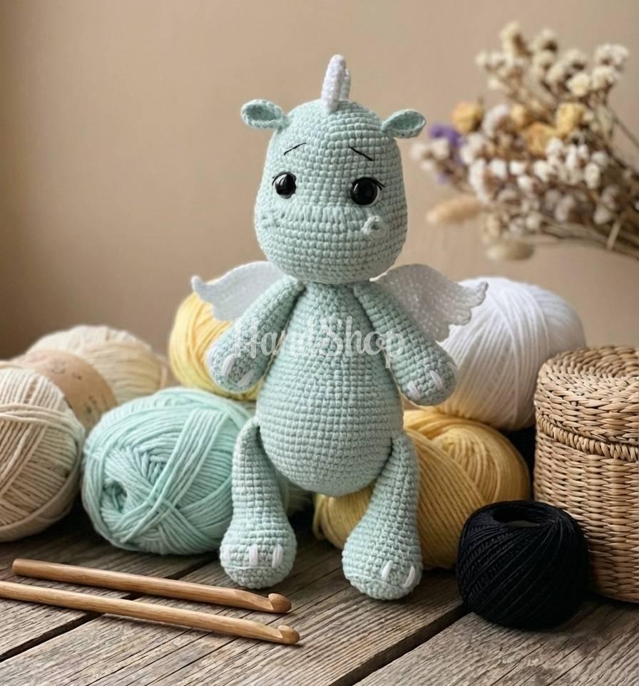 Особенности: вязаные игрушки крючком ручной работы – авторская игрушка дракон ручной работы. Игрушка мягкая вязаная дракончик из хлопковой пряжи 23 см. Авторская игрушка дракон в нежно мятном цвете с белыми крыльями. Игрушка дракончик тонирован сухой пастелью. Авторский вязаный дракон – идеальный подарок для любого любителя игрушек и коллекционеров. Изготовленный из нитей в мятном цвете, этот миленький символ года привлекает внимание своей яркостью и оригинальным дизайном. Дракончик имеет размер примерно 23 см, что делает его идеальным для объятий и игры. Его белые крылья делают его еще более привлекательным и придают ему неповторимый шарм. Игрушка дракон создана с большим вниманием к деталям и отличается высоким качеством связки. Она отлично подходит для подарков на любой важный случай или как символ нового года. Добавьте этого волшебного дракончика в свою коллекцию или подарите его близкому человеку, чтобы подарить ему радость и тепло от вашего сердца.