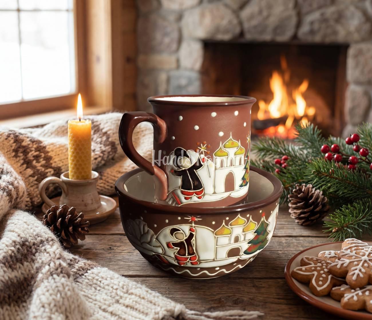 Особенности: керамическая посуда – новогодний праздничный сувенирный набор чашка 300 мл и миска 450 мл с ручной росписью – Святой вечер. Керамическая чашка ручной работы и керамическая миска выполнены в зимнем рождественском стиле. Ручная роспись чашки и миски с елками, церковью, вертепом и уютной праздничной атмосферой, погружающейся в волшебные мгновения зимней сказки. Чашка из глины зима Рождество 2025 года с размерами: диаметр мм: 85; высота, мм: 90; емкость, мл: 300. Керамическая миска с размерами: диаметр мм: 135; высота, мм: 60; емкость, мл: 450. Окунитесь в атмосферу зимнего праздника с нашим уникальным керамическим набором ручной работы! Эта замечательная чашка объемом 300 мл станет идеальным компаньоном для ваших теплых напитков во время холодных вечеров. Каждая чашка и миска украшена волшебными рисунками елок, церкви и вертепа, создающими уютную праздничную атмосферу. Стильный зимний мотив переносит вас в сказочную ночь Святого вечера, придавая особый шарм вашей кухне. Чашка и миска изготовлены из натуральной глины, что обеспечивает долговечность и экологичность. Приготовьтесь к празднованиям с этим великолепным керамическим набором, который не только подчеркнет ваш стиль, но и принесет тепло в ваш дом в зимний период!
