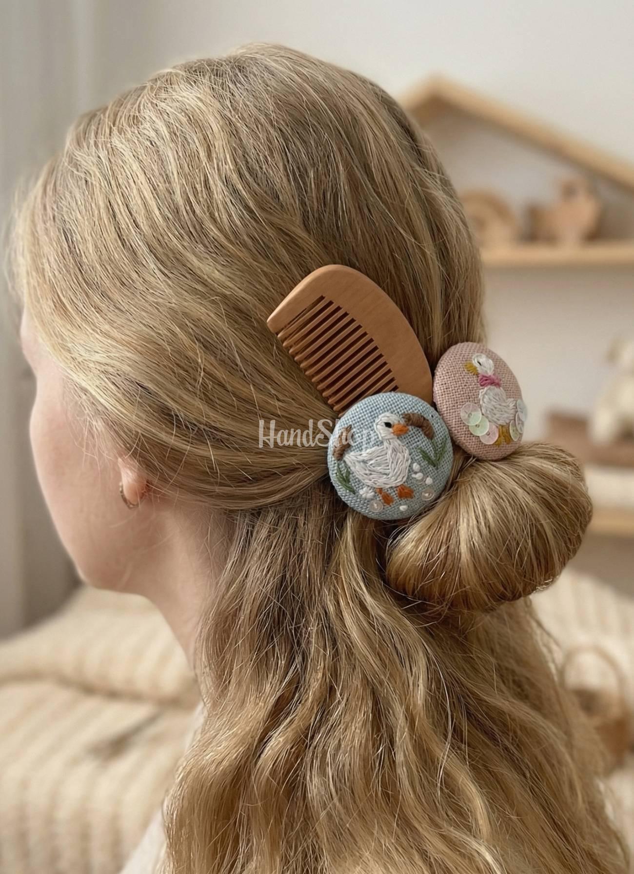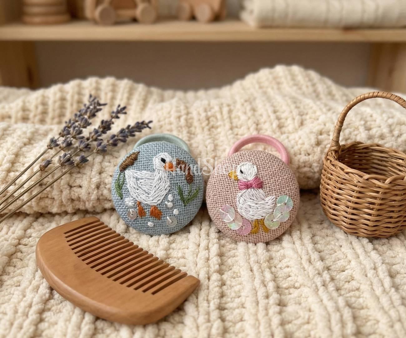 Особливості: аксесуари для волосся з вишивкою ручної роботи – пара дитячих резиночок для волосся своїми руками в з авторською вишивкою білі гуси пара. Основа резинок гусаки виконана з тканини – натуральний льон. Ручна вишивка гусей на резинках зроблена з використання шовкових ниток DMC Франція. Резинки для волосся своїми руками круглої форми – гудзички мають діаметр 2,7 см. Авторські прикраси для волося з вишивкою білі гуси пара в бежево-блакитній гамі – ексклюзивно, стильно та дуже красиво! Авторська резинка для волосся з маленькими гусаками – прекрасне, доповнення дитячого образу. Резинка для волосся гуси – це креативно, яскраво та оригінально!