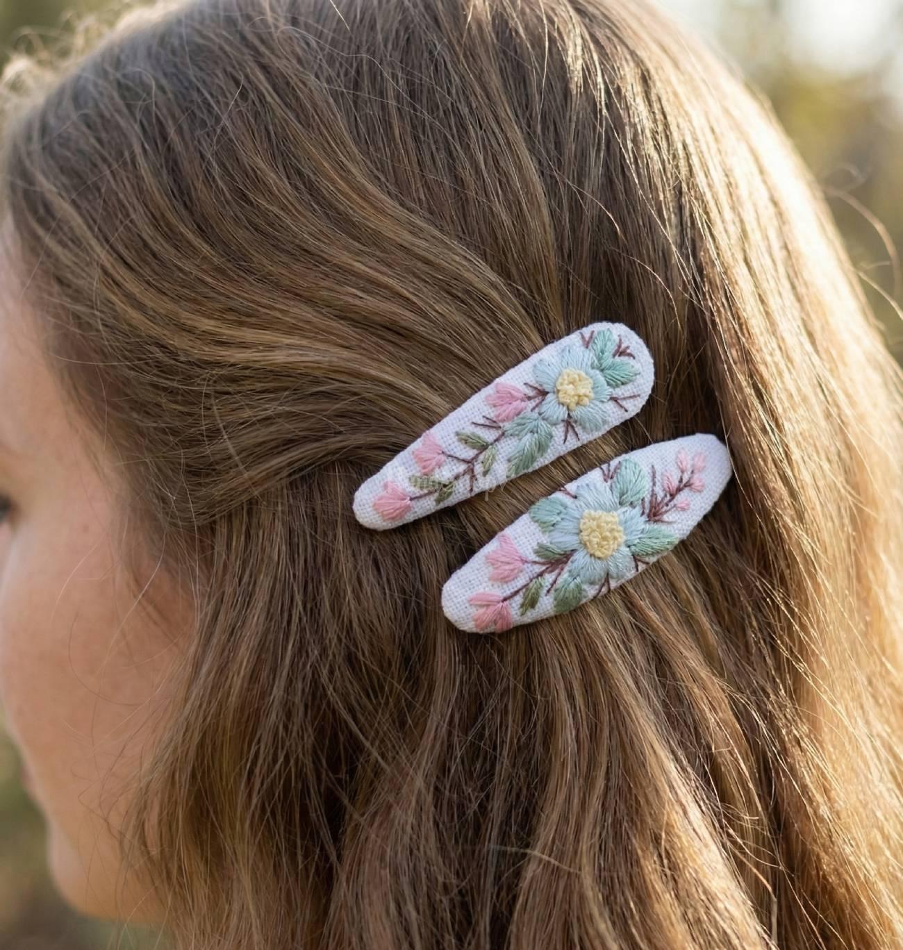 Особливості: аксесуари для волосся з вишивкою ручної роботи – дитяча пара заколок клік-клак для волосся своїми руками з авторською вишивкою польові квіточки та гілочки. Основа заколочок виконана з блакитної тканини – натуральний льон. Дитяча пара заколок клік-клак з авторською ручною вишивкою – це не просто аксесуар для волосся, а маленький витвір мистецтва, створений з любов’ю. Кожна заколочка оздоблена витонченими польовими квіточками та ніжними гілочками, що нагадують теплі літні прогулянки серед квітучого лугу. Основа виконана з натурального блакитного льону – приємного на дотик, безпечного та екологічного матеріалу. Вишивка створена вручну шовковими нитками від всесвітньо відомого французького бренду DMC, що надає квітам особливого блиску, глибини кольору та довговічності. Металева основа клік-клак довжиною 6 см зручна у використанні: заколочки легко фіксуються та надійно тримаються навіть на тонкому дитячому волоссі. Ці дитячі заколочки стануть ніжним акцентом у святковому чи повсякденному образі та подарують відчуття особливості кожного дня. Створені руками – щоб прикрашати найцінніше. Зажими для волосся квіти – це дуже ніжно, мило та креативно!