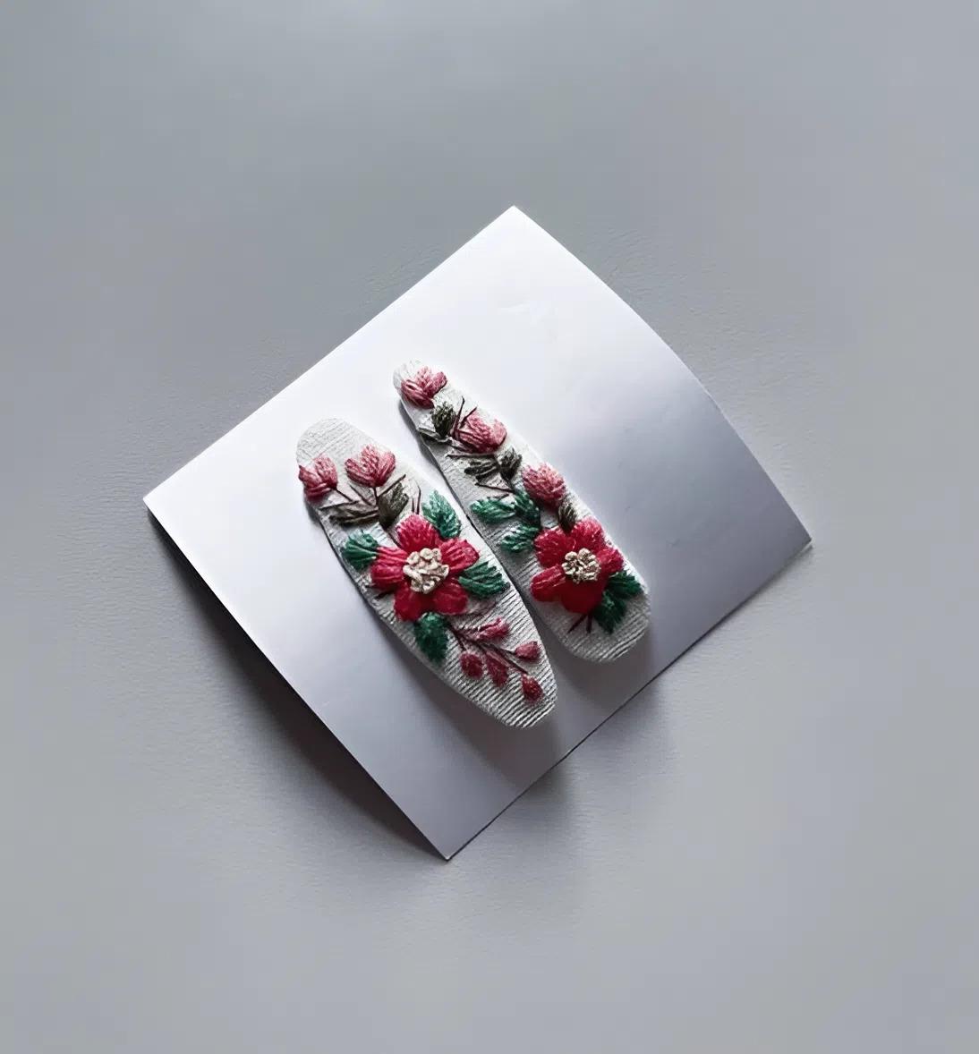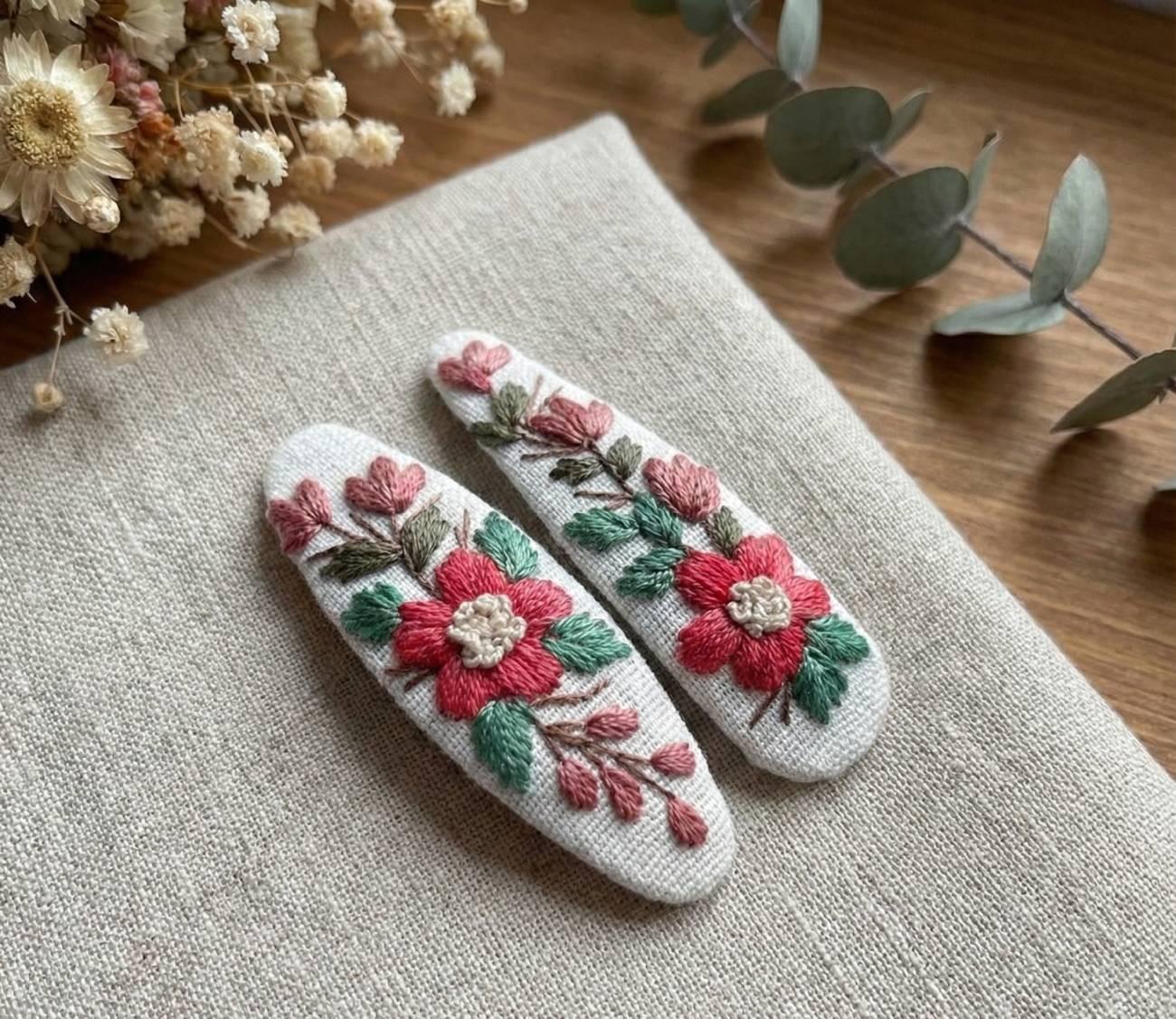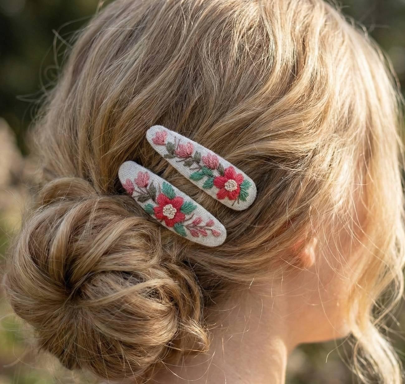 Особливості: аксесуари для волосся з вишивкою ручної роботи – дитяча пара заколочок клік-клак для волосся своїми руками з авторською вишивкою квіти. Яскраві бордові польові квіти вишиті вручну шовковими нитками преміальної якості від DMC Франція. Кожен стібок виконаний з особливою увагою до деталей, тому квіточки виглядають живими, об’ємними та неймовірно ніжними. Натуральна основа з льону на заколочках – екологічна, приємна на дотик і безпечна для дитячого волосся. Металева основа клік-клак довжиною 6 см зручна та надійно фіксує зачіску, не травмуючи волосся. Наші авторські квіткові заколочки стануть прекрасним романтичним доповненням святкового образу – для дня народження, фотосесії чи родинного свята. Зажими для волосся з квітами – це ніжність, милота та креатив в одному аксесуарі. Подаруйте дитині прикрасу, яка підкреслить її індивідуальність і зробить кожен день трішки чарівнішим. Додайте до образу маленької принцеси ніжний акцент, створений з любов’ю. Дитяча заколка клік-клак з авторською ручною вишивкою – це більше, ніж аксесуар. Це витончене поєднання натуральних матеріалів, майстерності та бездоганного стилю.