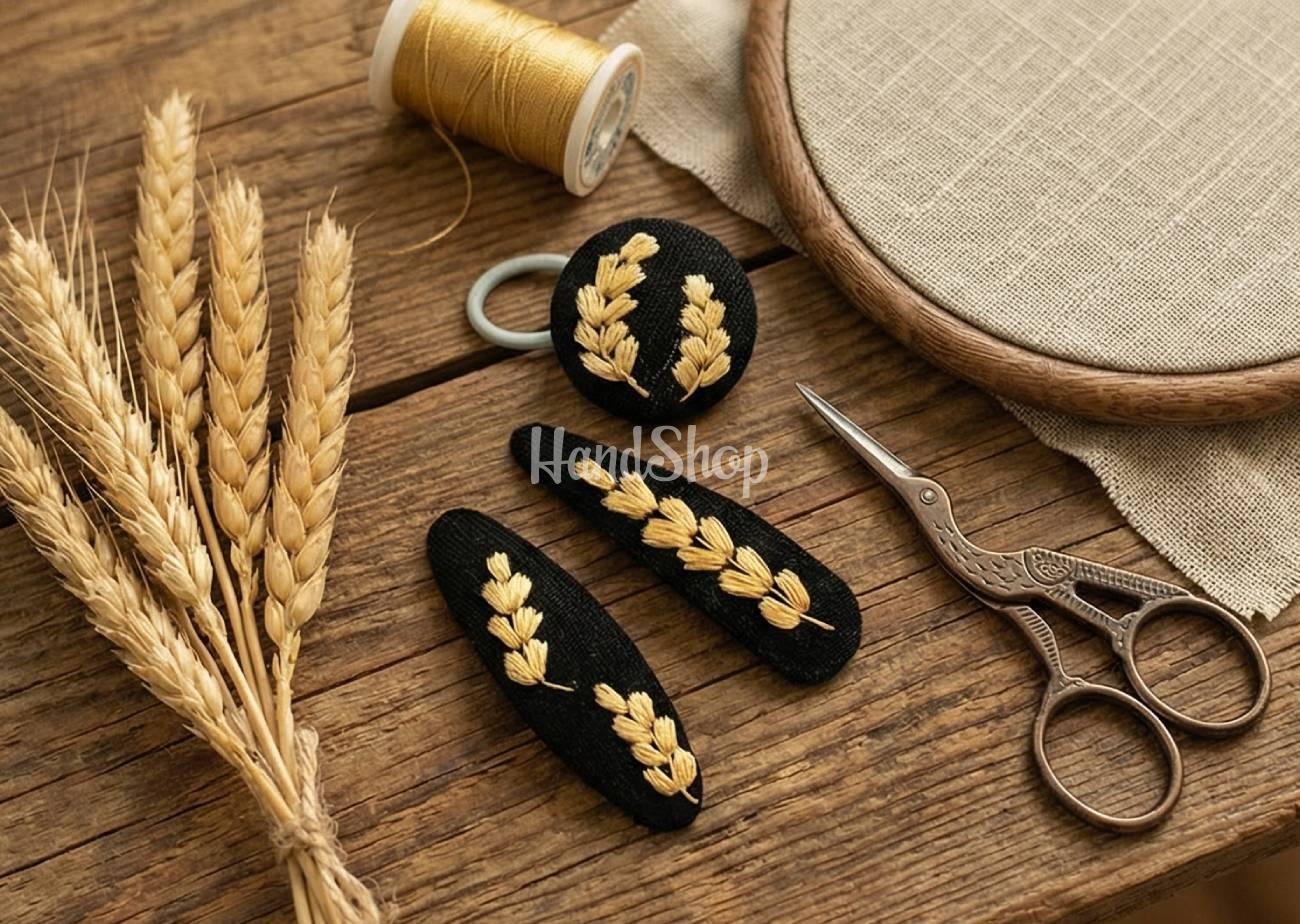 Особливості: аксесуари для волосся з вишивкою ручної роботи – заколка клік-клак та резинка для волосся своїми руками з авторською вишивкою золоті українські колоски. Основа резинок та заколочок виконана з тканини – натуральний льон. Ручна вишивка українських польових колосків – символ родючості, добробуту та зв’язку з рідною землею. Вишивка колосків на заколках виконана з використання шовкових ниток DMC Франція. Дитячі заколочки мають металічну основу клік-клак довжиною 6 см. Резинка для волосся своїми руками круглої форми – гудзик має діаметр 2,7 см. Авторські прикраси для волося з вишивкою колоски – ексклюзивно, стильно та дуже красиво! Подаруйте собі або дитині частинку українського тепла та майстерності! Наша колекція прикрас для волосся створена вручну з любов’ю до традицій, краси та природи. Ці прикраси стануть ніжним акцентом в образі, ідеальним подарунком або стильним доповненням до вишиванки. Авторська резинка для волосся та заколочки з маленькими вишитими колосками – прекрасне, романтичне доповнення образу. Резинка для волосся золоті колоски – це дуже жіночно, яскраво та креативно!