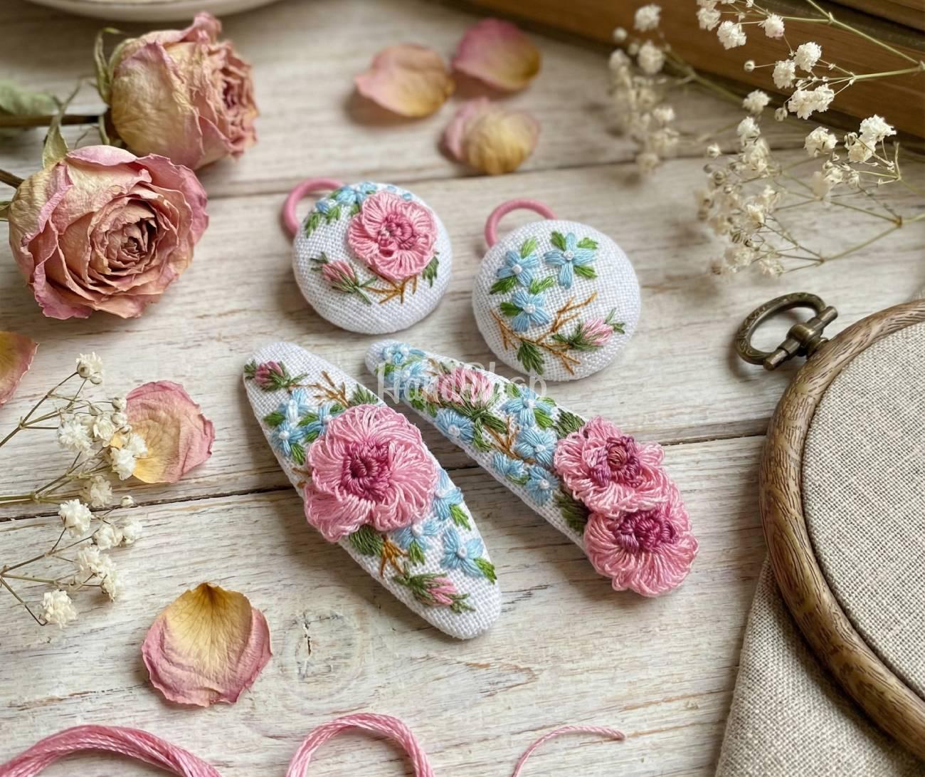 Особливості: аксесуари для волосся з вишивкою ручної роботи – заколка клік-клак та резинка для волосся своїми руками з авторською вишивкою рожеві квіти троянд. Основа резинок та заколочок виконана з тканини – натуральний льон. Ручна вишивка квітів рожеві англійські троянди виконана з використання шовкових ниток DMC Франція. Жіночі заколочки мають металічну основу клік-клак довжиною 6 см. Резинка для волосся своїми руками круглої форми – гудзички мають діаметр 2,7 см. Авторські прикраси для волося з вишивкою квіти – рожеві англійські троянди – ексклюзивно, стильно та дуже красиво! Авторська резинка для волосся та заколочки з маленькими вишитими квітами троянд – прекрасне, романтичне доповнення образу. Резинка для волосся квіти англійські троянди – це дуже жіночно, яскраво та креативно!