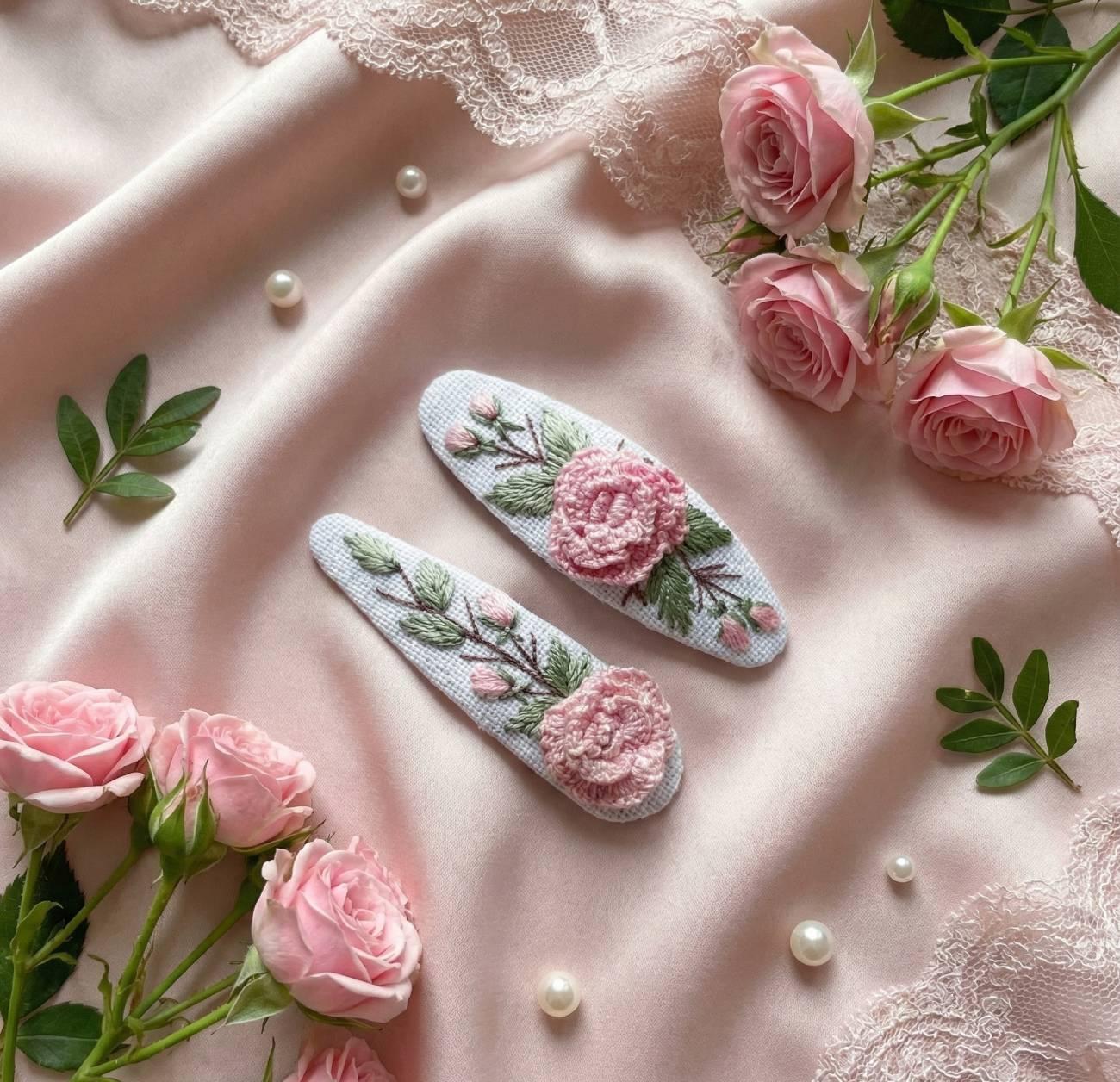 Особливості: аксесуари для волосся з вишивкою ручної роботи – заколки пара клік-клак для волосся своїми руками з авторською вишивкою ніжно рожеві квіти англійські троянди. Заколочки пара – це елегантний аксесуар, створений з любов’ю до деталей та краси. Основа заколочок виконана з тканини – натуральний льон. Ручна вишивка квітів рожеві англійські троянди виконана з використання шовкових ниток DMC Франція, що надає квітам делікатного блиску та об’ємності. Дитячі заколочки мають металічну основу клік-клак довжиною 6 см – надійно фіксує пасма, забезпечуючи комфорт протягом усього дня. На основі з натурального льону розквітають вишиті вручну англійські троянди – символ витонченості, ніжності та справжньої дівочої чарівності. Кожна квіткова дитяча заколочка створена своїми руками, тому є унікальною та неповторною. Це не просто прикраса для волосся – це маленький витвір мистецтва, який підкреслить індивідуальність і стане ніжним акцентом святкового чи повсякденного образу. Аксесуари з вишитими трояндами – це стильно, романтично та по-особливому красиво. Подаруйте дитині прикрасу, яка розквітає разом із її усмішкою.