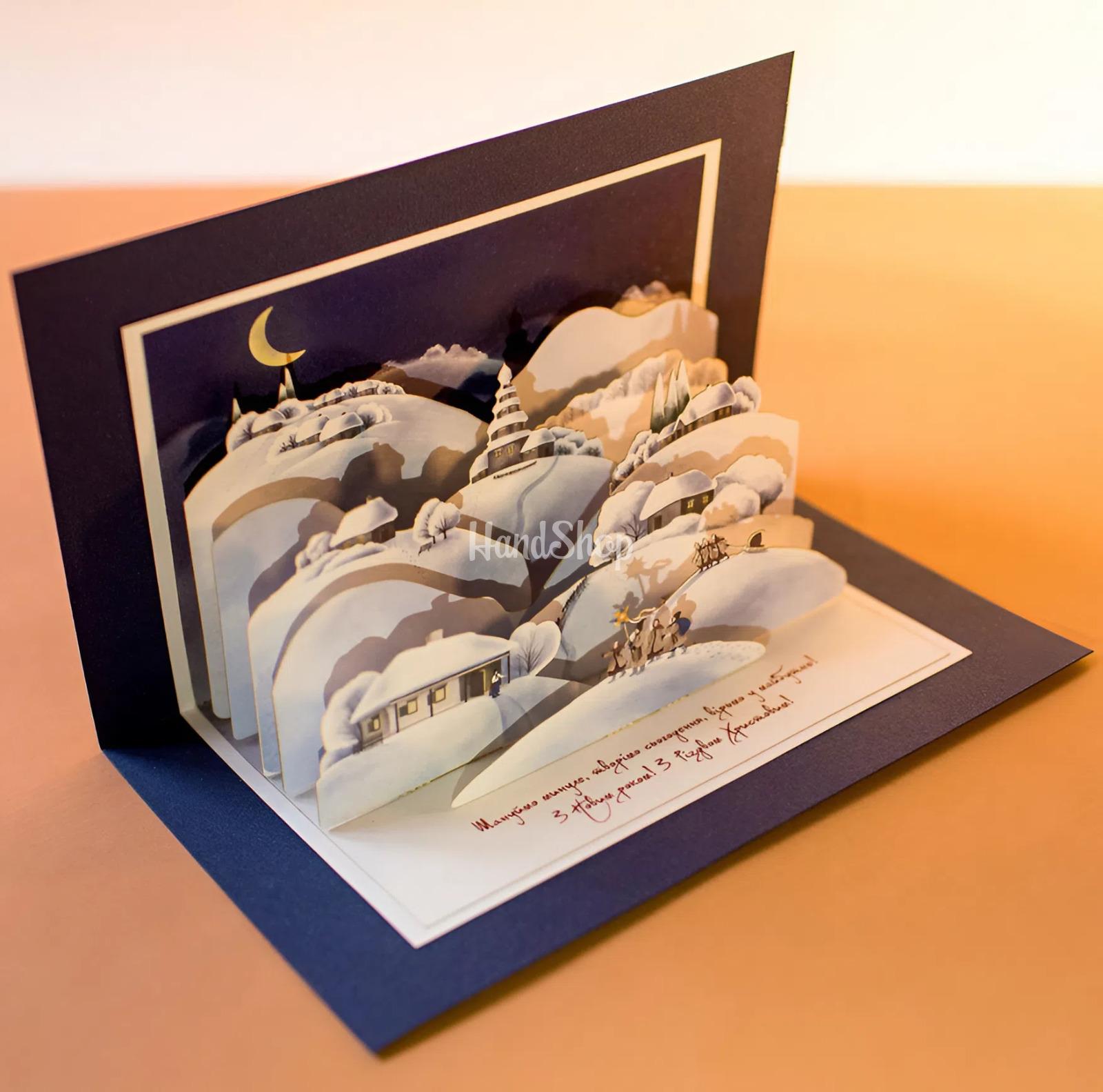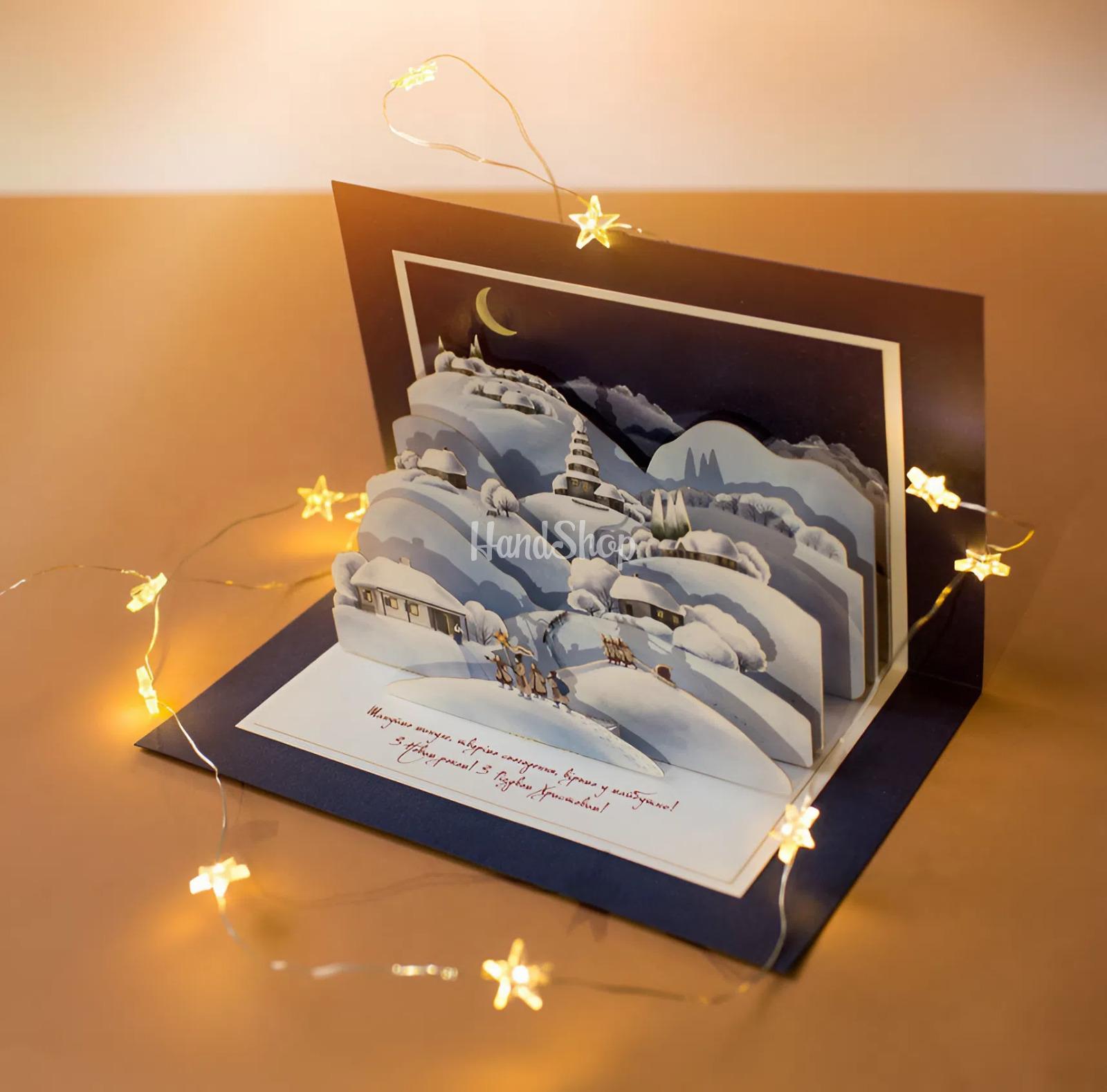 Особливості: листівки 3d новий рік 2026 – листівка на Різдво Новий рік своїми руками 2026. Листівка різдвяна ніч виготовлена з преміум італійського дизайнерського картону розміру 21 х 15 см. Усередині 3d лисівки – об’ємні елементи зимової святкової ночі: українські хатинки, чудовий місяць і святковий вертеп, що створюють чарівну атмосферу свят. Всі деталі виконані в білому та синьому кольорах, підкреслюючи зимовий настрій, а кожен об’ємний елемент виготовлений вручну, що додає листівці особливої цінності. Новорічна об’ємна листівка має напис: «Шануймо минуле, творімо сьогодення, вірьмо у майбутнє. З Новим роком! З Різдвом Христовим!». Ця листівка святковий вертеп – ідеальний подарунок для ваших близьких на новорічно-різдвяні свята 2026 року. Вона стане не лише яскравим доповненням до подарунку, а й символом тепла, любові та святкової магії. Подаруйте близьким неповторну атмосферу Різдва та Нового року разом з цією авторською 3D-листівкою вертеп!