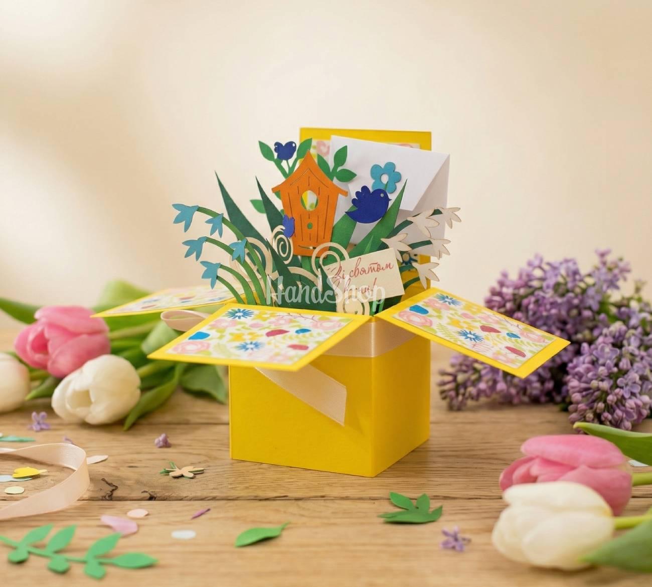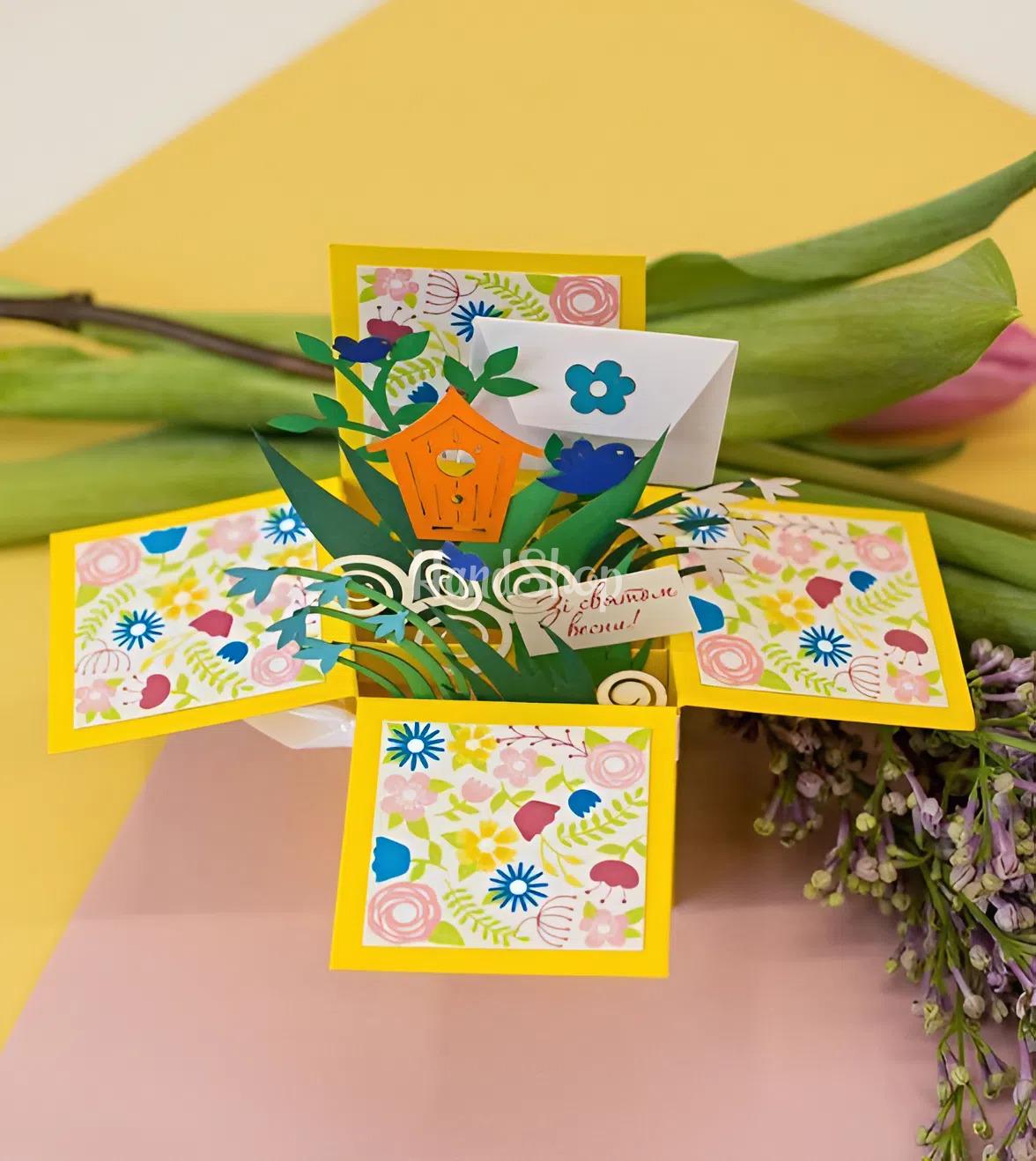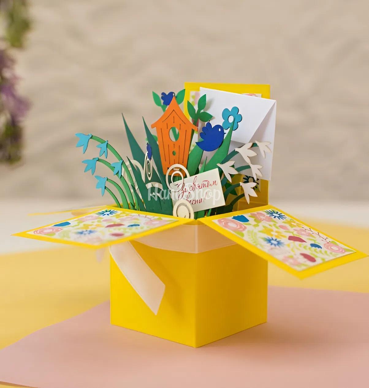 Особливості: листівка коробочки зі квітами ручної роботи – жіночі об’ємні листівки коробочки 12 x 12 см виготовлені з італійського дизайнерського картону. Усередині 3d святкової листівки коробочки – 3D ілюстрація жіноче свято. Об’ємна коробочка листівка прикрашена весняними квітами, пташками, шпаківнею, завитками у яскравому весняному кольорі. Вітальна листівка з написом українською мовою: «Зі святом!». Даруйте об’ємні коробочки з картону – листівки зі квітами у коробочках – мамам, сестрам, тіткам, бабусям та подругам! Об’ємна коробочка своїми руками – коробочка на день народження – завжди оригінальна та незвичайна! Скрапбукінг листівки об’ємна коробочка – подарунок у коробочці на день народження – здивує та порадує кожного!