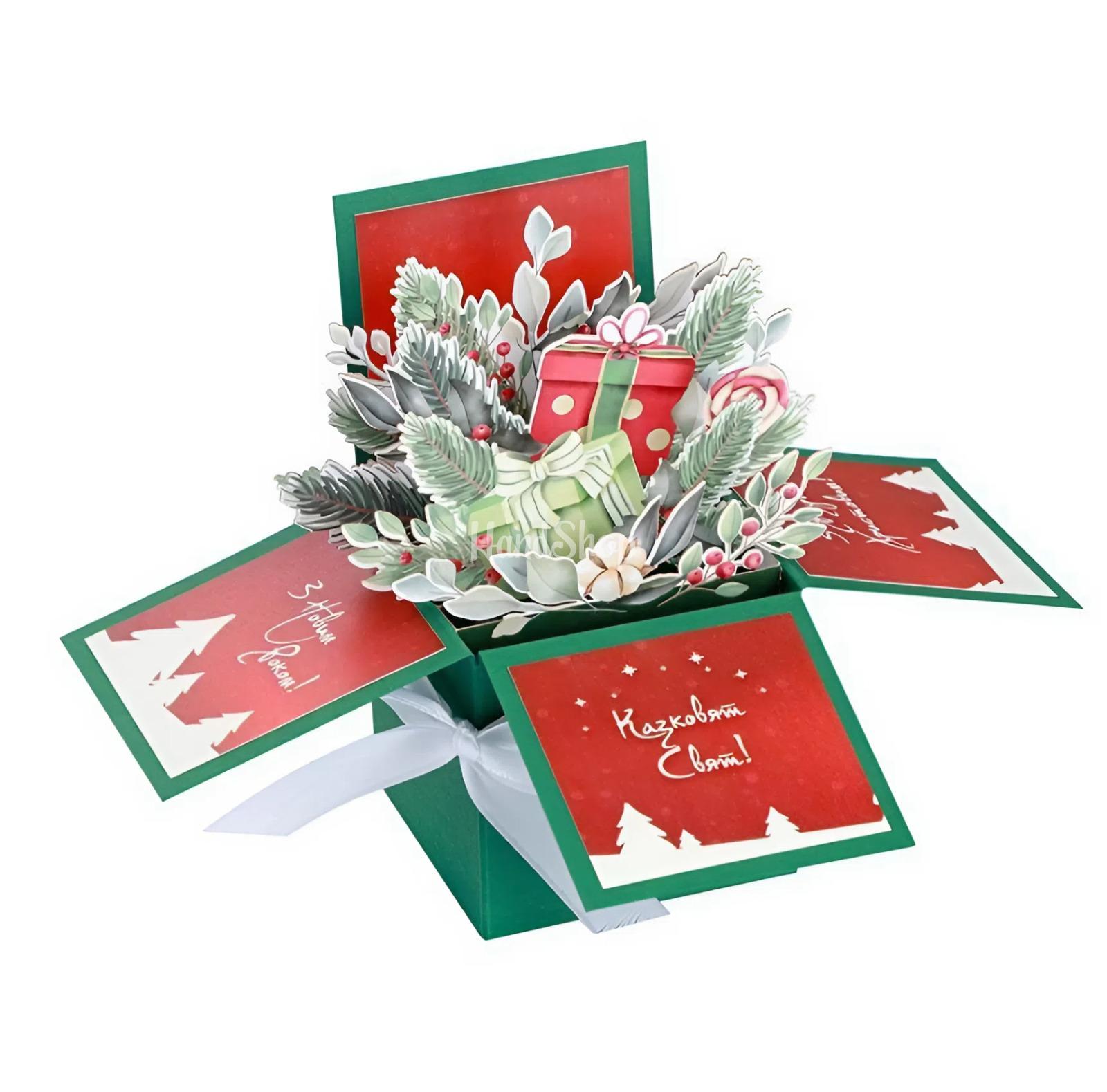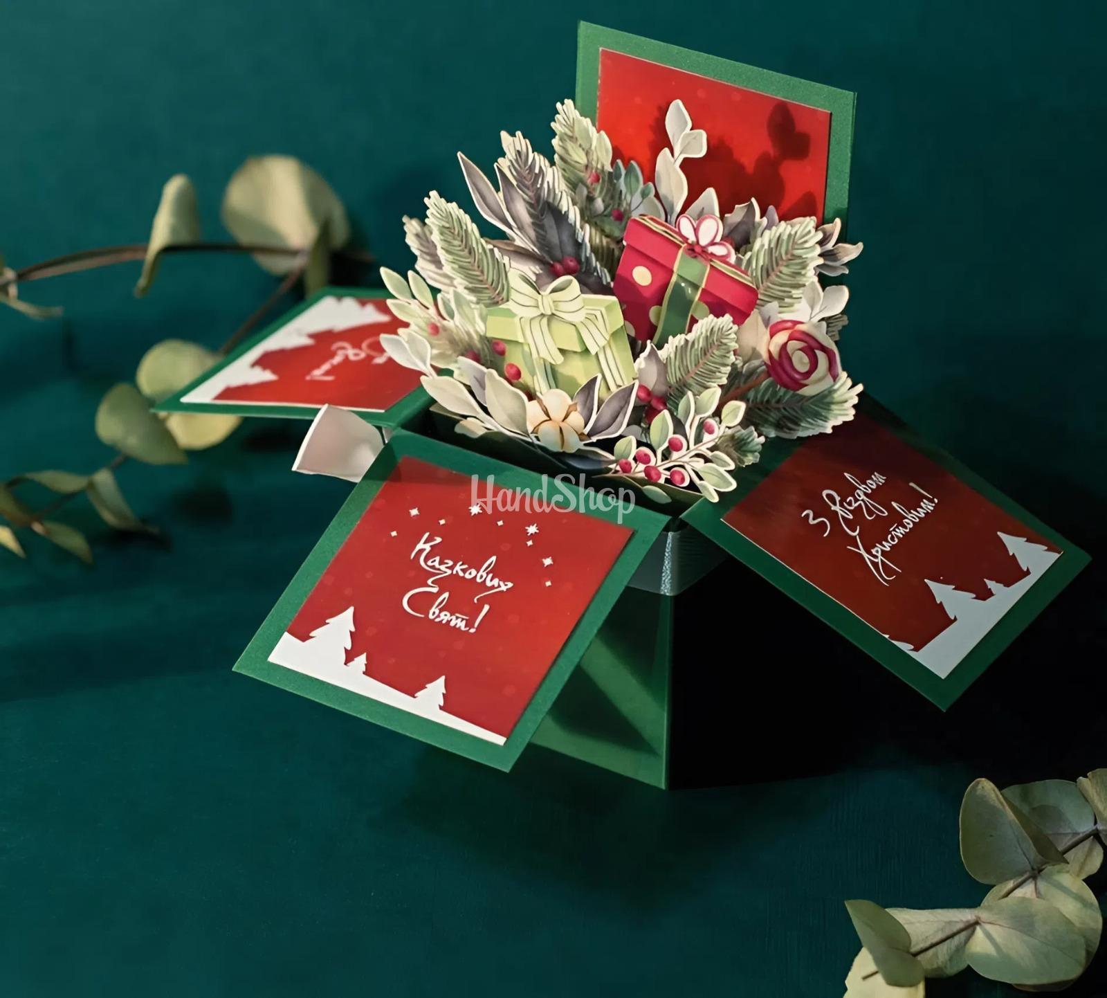 Особливості: листівка до нового 2026 року – святкова об’ємна коробочки на Різдво 12 x 12 см виготовлена з італійського дизайнерського картону. Зустрічайте свята яскраво й по-особливому з нашими новорічними об’ємними листівками-коробочками! Це не просто 3d листівка, а маленьке диво у формі коробочки, що відкривається та розкриває чарівний новорічний світ всередині. Усередині зимова листівка коробочка має 3D композицію з новорічними та різдвяними символами 2026 року: ялинки, подарунки, сніжинки, свічки, олені та інші святкові елементи. Святкова різдвяна листівка прикрашена всередині українським написом «Казкових свят!» – щире побажання, що додає тепла кожному подарунку. Наша вітальна коробочка листівка – повністю ручна робота – кожна коробочка створюється з любов’ю, турботою й увагою до деталей. Таку святкову коробочку можна подарувати мамі, сестрі, бабусі, подрузі чи колезі – вона точно викличе усмішку та стане чудовим доповненням до будь-якого подарунка. Новорічна об’ємна листівка-коробочка – це не просто сувенір, а справжній святковий настрій у долонях. Вона прикрасить дім, стіл або стане милим нагадуванням про вашу турботу й увагу. Коробочка на Різдво та Новий рік 2026 – це частинка чарів, зроблена своїми руками, щоб ваші свята були ще теплішими й яскравішими!