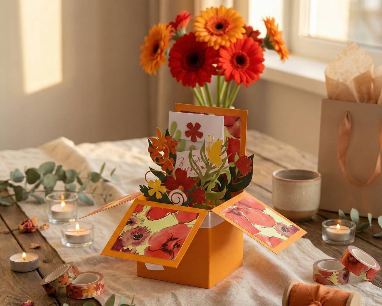 Особливості: листівка коробочка з квітами – жіноча об’ємна коробочка 12 x 12 см. Листівка виготовлена з італійського дизайнерського картону. Всередині 3d святкової листівки коробочки – 3D ілюстрація – тема жіночий день народження – святкові атрибути-вирубки – квіти, метелики, завитки та напис: «З Днем народження». Усередині об’ємна листівка коробочка з квітами прикрашена маленьким білим конвертиком, в який можна вкласти папірець з вашими побажаннями. Даруйте об’ємні коробочки з картону – листівки з квітами в коробочках – мамам, сестрам, тіткам, бабусям та подругам! Об’ємна коробочка своїми руками – коробочка на день народження – завжди оригінально та незвичайно! Скрапбукінг листівки об’ємна коробочка – подарунок у коробочці на день народження – здивує та порадує кожного!