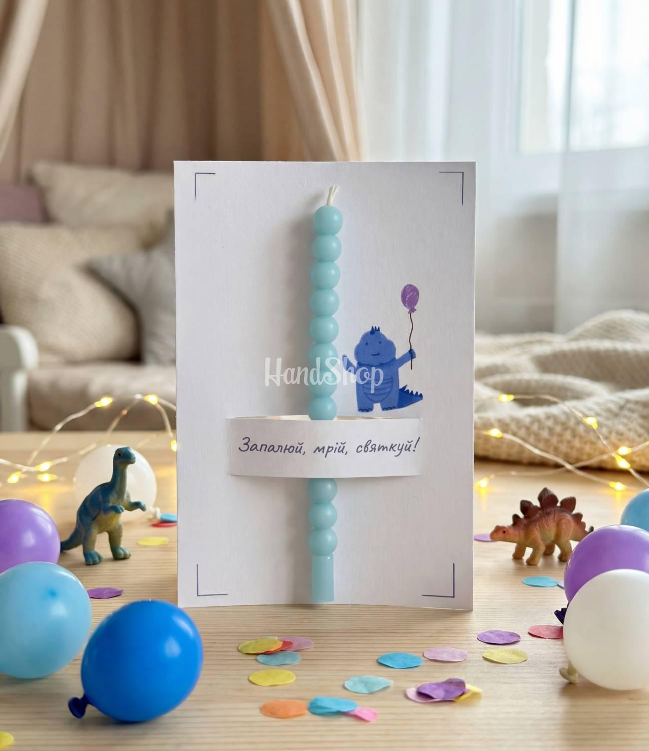 Особливості: святкові атрибути – дитяча авторська листівка маленького формату 12 х 8 см. Вітальна листівка має прорізне віконечко, через яке видніється довга свічка бенто-кульки ручної роботи 11 см та та 0,7 см в діаметрі, виготовлена з натурального віску, в блакитному кольорі. Свічка додає святковості і тепла, створюючи атмосферу затишку. На зворотному боці листівки є спеціальна смужка сірки – чиркало, а також сірник, закріплений на кольоровий скотч, щоб отримати ідеальну відповідь на будь-яке свято. Виготовлена з дизайнерського картону, на лицьовій стороні, має зображення милого блакитного дракончика, який тримає в руках повітряну кульку. Цей персонаж одразу створює позитивний настрій і дарує відчуття веселощів і магії, що так важливо для дитячого свята. Дитяча листівка на день народження з написом українською мовою: «Запалюй, мрій, святкуй!», що надихає малечу на святковий настрій і позитивні емоції. Це послання стане чудовим доповненням до святкового дня, підкреслюючи важливість мрій та радості. Ця чудова дитяча листівка – це не просто привітання, а справжнє свято на папері! Виготовлена з дизайнерського картону, вона одразу привертає увагу яскравим і миловидним дизайном. Формат 12 х 8 см робить її ідеальною для маленьких подарунків або просто як оригінальне доповнення до основного презенту. Дитяча листівка зі свічкою – це не тільки красиве привітання, але й маленька деталь, яка додає святкову нотку до кожного моменту.