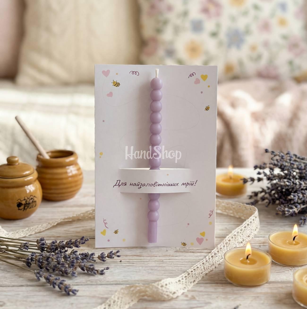 Особливості: святкові атрибути – авторська листівка маленького формату 12 х 8 см. Вітальна листівка має прорізне віконечко, через яке видніється довга свічка бенто-кульки ручної роботи 11 см та та 0,7 см в діаметрі, виготовлена з натурального віску, в фіолетовому кольорі. Свічка додає святковості і тепла, створюючи атмосферу затишку. На зворотному боці листівки є спеціальна смужка сірки – чиркало, а також сірник, закріплений на кольоровий скотч, щоб отримати ідеальну відповідь на будь-яке свято. Виготовлена з дизайнерського картону з ніжним принтом фіолетових сердечок, бджілок і завитків, вона одразу привертає увагу своєю елегантністю та витонченістю. Жіноча листівка з написом українською мовою: «Для найзаповітніших мрій» – надихає на позитив і енергію, що робить листівку не тільки гарною, але й дуже символічною. Ця унікальна листівка на день народження – ідеальний варіант для того, щоб зробити свято особливим та незабутнім! Ця маленька листівка стане чудовим доповненням до будь-якого подарунка та принесе радість іменнику. Святкова листівка з свічкою підходить для жінок будь-якого віку і стане чудовим акцентом на святковому столі чи в подарунковій упаковці. Додайте до свята яскравий момент разом з авторською листівкою, яка не тільки прикрасить день, а й залишить теплі спогади!