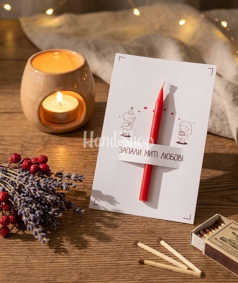 Особливості: святкові атрибути – романтична вітальна авторська листівка маленького формату 12 х 8 см. Вітальна листівка має прорізне віконечко, через яке видніється довга свічка бенто-олівець ручної роботи 9 см та та 0,5 см в діаметрі, виготовлена з натурального віску, в червоному кольорі, що додає чарівної атмосфери. На зворотному боці листівки є спеціальна смужка сірки – чиркало, а також сірник, закріплений на кольоровий скотч, щоб отримати ідеальну відповідь на будь-яке свято. Дизайнерський картон, на якому виготовлена листівка, підкреслює її елегантність. На лицьовій стороні ви знайдете зображення закоханої пари, що обмінюється сердечками, а напис «Запали миті любові» на українській мові надає листівці глибокого емоційного змісту. Ця романтична листівка зі свічкою стане чудовим подарунком для коханої людини, яка оцінить її витонченість і теплоту. Унікальність дизайну та майстерність виготовлення роблять її ідеальним варіантом для найкращих моментів вашого життя.