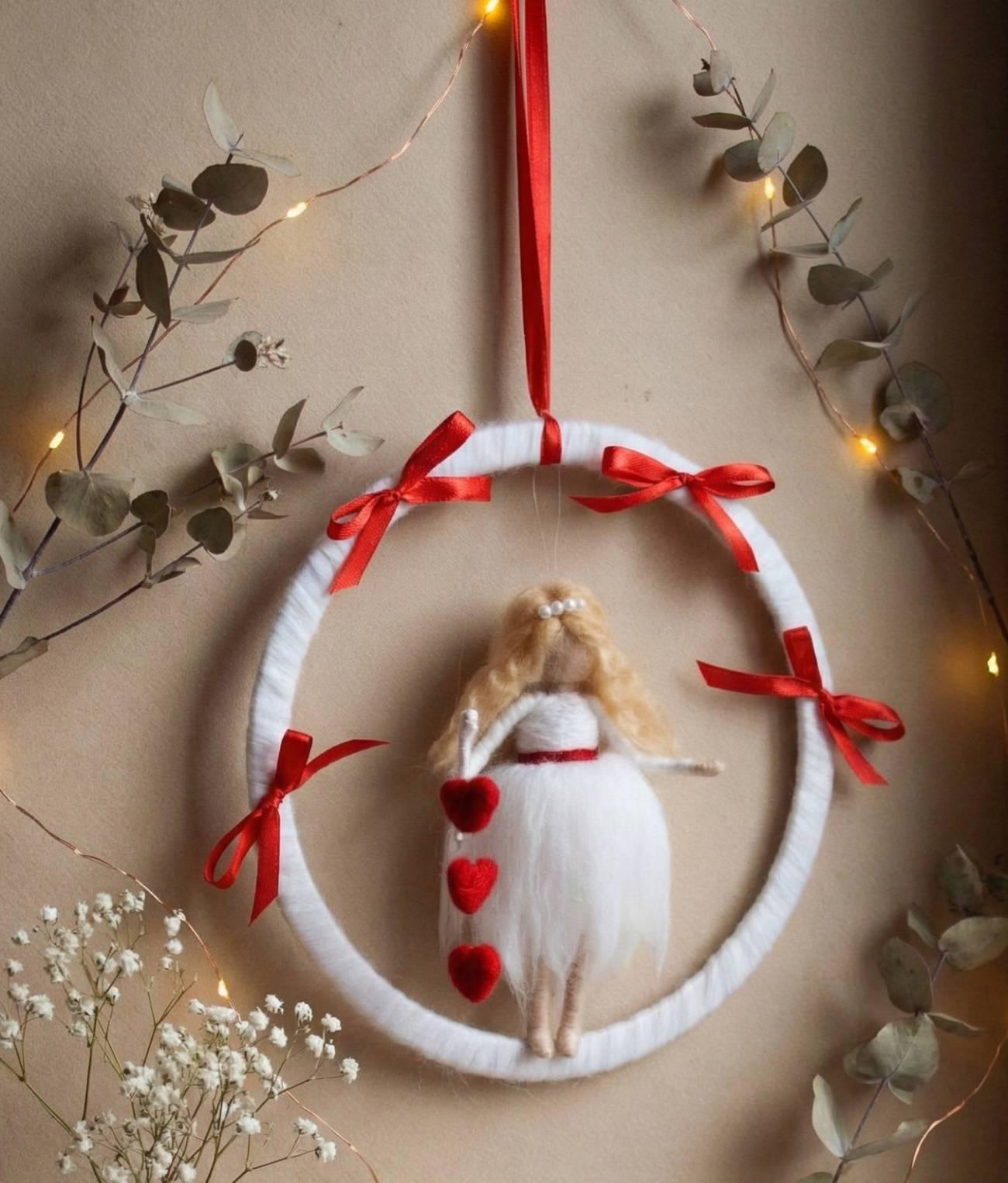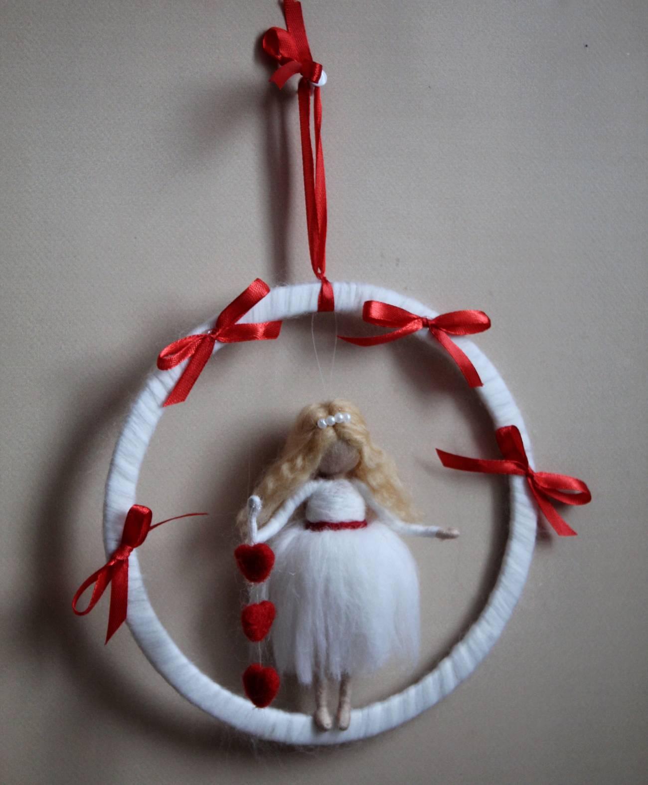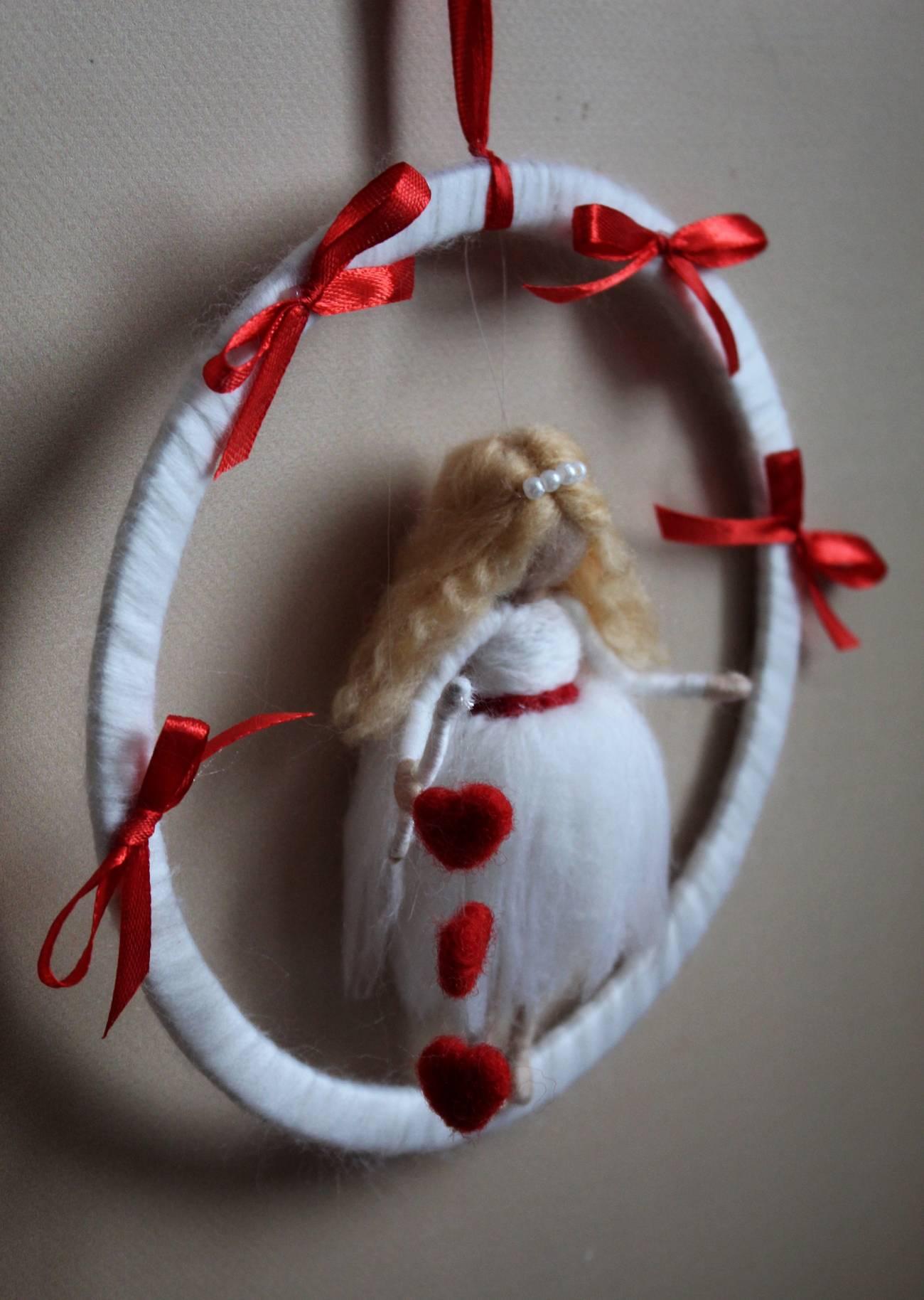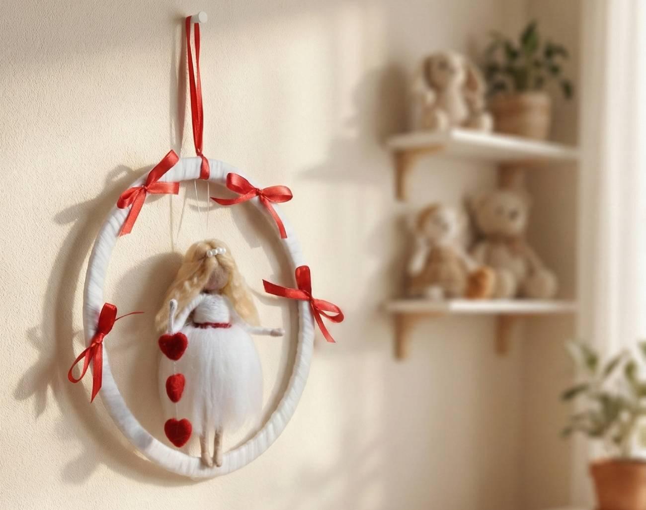 Особливості: ляльки валяння вовни – міні лялька білявка кудрява валентинка до 12 см з сердечками на круглій дерев’яній основі діаметром 18 см. Цей романтичний сувенір оберіг з вовни несе в собі атмосферу спокою, любові та домашнього затишку. У центрі композиції – дівчинка білявка з довгим кудрявим волоссям валентинка в білому вбранні та червоним поясом, яка тримає червоні сердечка як символи щирої любові, турботи й тепла. Її образ легкий і світлий, немов оберіг, який тихо охороняє дім і наповнює його добрими емоціями. М’яка текстура вовни поєднується з натуральним деревом, створюючи гармонійний, живий образ, а стрічки додають виробу ніжності й святковості. Цей авторський декор прикрашений атласними червоними бантиками ручної роботи – стане затишним акцентом у дитячій кімнаті, спальні або в куточку, де хочеться спокою та тепла. Він також ідеально підійде як особливий подарунок для близької людини – знак уваги, любові й турботи, який залишиться на довгі роки. Кожен виріб виконаний вручну, тому є унікальним і зберігає в собі тепло рук майстра. Це більше, ніж декор – це маленький оберіг із великим серцем.