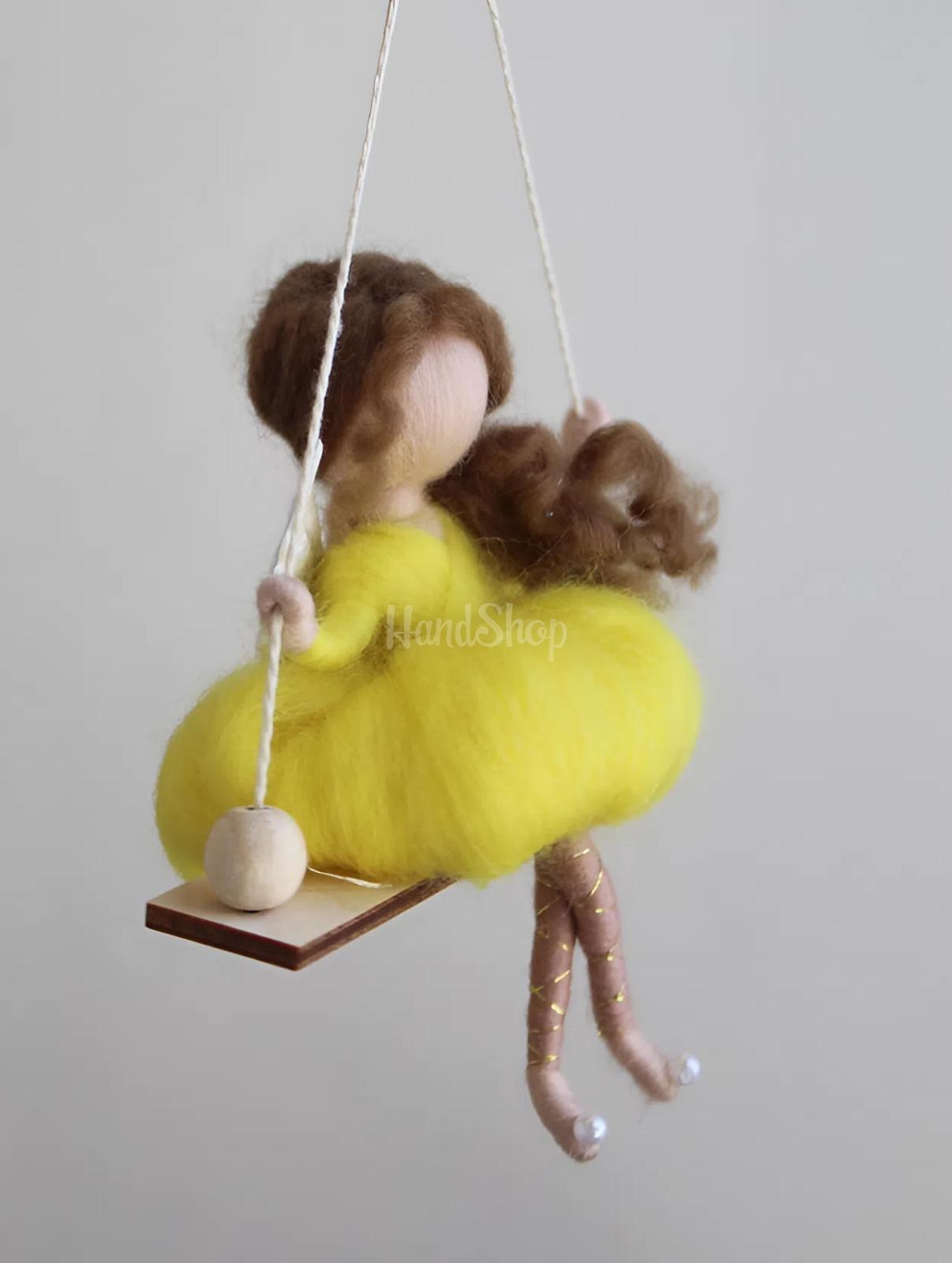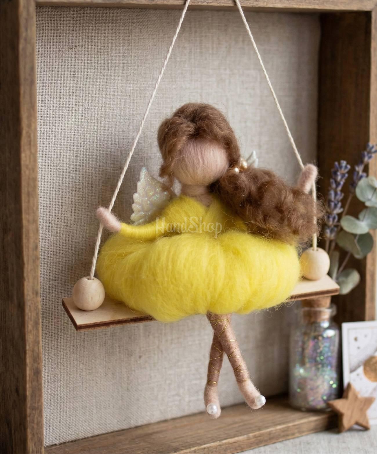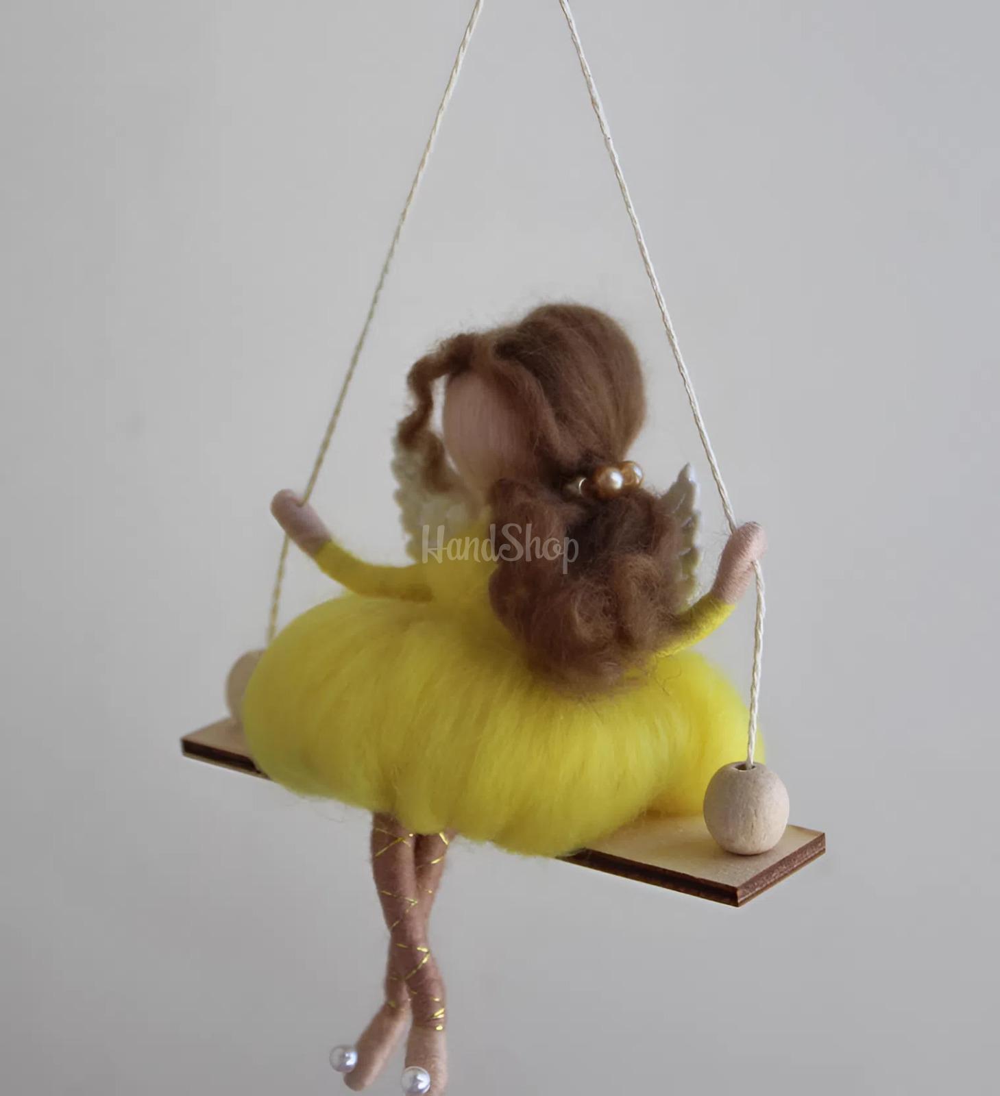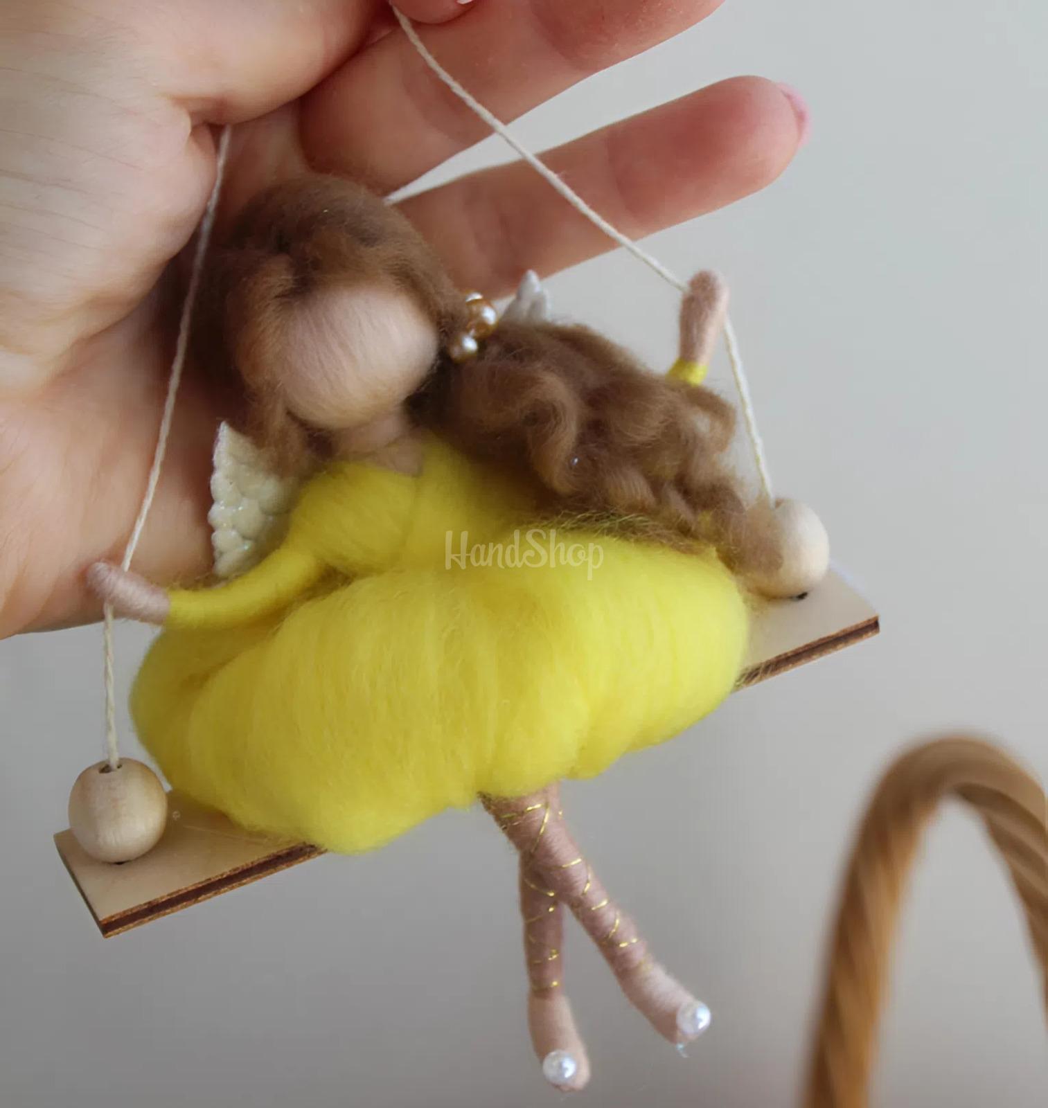 Особливості: ляльки валяння вовни – авторська дитяча лялька на дерев’яній гойдалці своїми руками невеликого розміру до 14 см. Мініатюрна лялька, виконана у техніці валяння з натуральної вовни мериноса, втілює образ милого янголятка з у пишній святковій жовтій сукні. Ангелик лялька сидить на декоративній дерев’яній гойдалці, що додає виробу особливого шарму та казковості. Позаду лялька оздоблена акуратними білими ангельськими крильцями, підкреслюючи її святковий, великодній настрій. Ця мила лялька з довгим каштановим кудрявис волоссям, зібраний у хвостик на бік стане чудовим подарунком на Великдень або будь-яке інше свято. Лялька підвіска ангел ідеально підходить як сувенір для близьких людей, символ турботи та тепла. Її можна використовувати для декору дитячої кімнати, прикрасити інтер’єр або навіть підвісити в автомобілі – вона всюди додасть затишку та ніжності. Подаруйте емоції, створені вручну. Маленькою із вовни лялькою зайка можна прикрашати дитячий інтер’єр, вішати в машині.