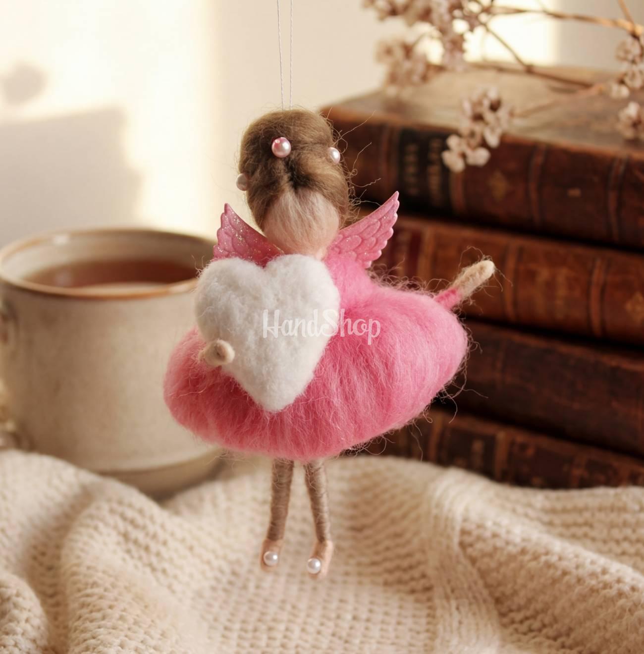 Особливості: ляльки валяння вовни – дитячі ляльки підвіски сувеніри – міні лялька своїми руками валентинка невеликого розміру до 12 см – сувенір підвіска. Дитяча лялька іграшкова виконана з шерсті мериноса в милому образі маленька Barbie фея валентинка з білим сердечком на підвісній нитці. Лялька підвіска ангел з коричневим волоссям у рожевій сукні. Сувенірна лялька має позаду білі ангельські крильця. Лялька з вовни зроблена у вигляді сувеніру підвіски валентинки на ниточці. Ляльку валяну з вовни в ліловій пишній сукні можна використовувати як подарункові сувеніри підвіски вашим коханим і рідним. Маленькою із вовни лялькою валентинкою можна прикрашати дитячий інтер’єр, вішати в машині. Міні ляльки своїми руками ангелики в рожквій сукні – лялька з вовни валентинка – сувенір та талісман рідним дівчатам! Дитяча лялька ангел – ляльки звалені з вовни порадує і зачарує не лише дитину, а й дорослу!