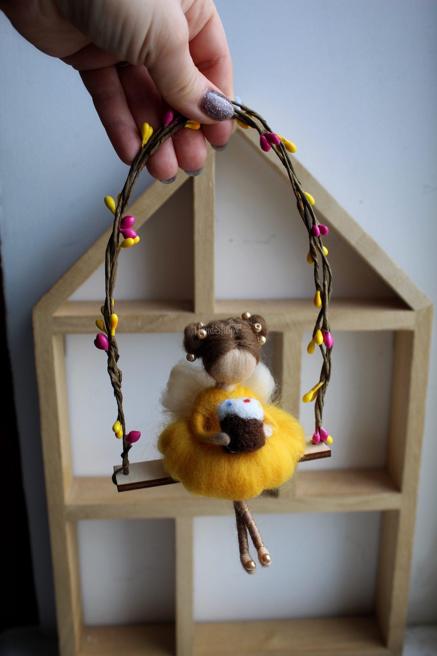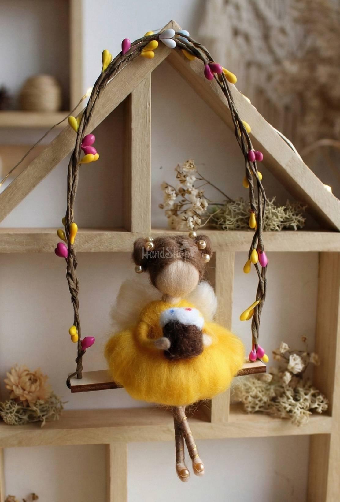 Особливості: ляльки валяння вовни – весняна композиція лялька фея на гойдалці невеликого розміру до 14 см з великодноью пасочкою у руках – сувенір підвіска. Лялька з вовни фея на гойдалці – це ніжна великодня композиція ручної роботи розміром 15 х 10 см, яка поєднує в собі символіку свята, затишок і казковий настрій. Це не просто сувенір, а маленька історія про добро, турботу й віру в дива. Фея-ангел одягнена у пишну жовту сукню – колір сонця, радості та оновлення. У руках вона тримає святкову великодню пасочку, що додає композиції особливої символічності та підкреслює атмосферу родинного тепла. Цей милий акцент робить сувенір доречним подарунком до Великодня та весняних свят. Позаду лялька декорована ніжними ангельськими крильцями у вигляді пишного бантика – деталь, що додає образу легкості й зворушливості. Довге каштанове волосся акуратно зібране у дві гульки, створюючи охайний, по-дитячому щирий образ, який викликає усмішку з першого погляду. Фея розташована на гойдалці, що створює відчуття руху, легкого весняного вітру та безтурботності. Завдяки компактному розміру підвіску легко розмістити у святковому інтер’єрі, прикрасити великодній кошик, декорувати дитячу кімнату або використати як символічний оберіг. Ця композиція з феєю стане чудовим подарунком для близьких – як знак турботи, світла й добрих побажань. Ручна робота з вовни зберігає тепло майстра та робить кожен екземпляр особливим і неповторним. Подаруйте маленьке весняне диво, яке наповнить дім радістю та святковим настроєм.